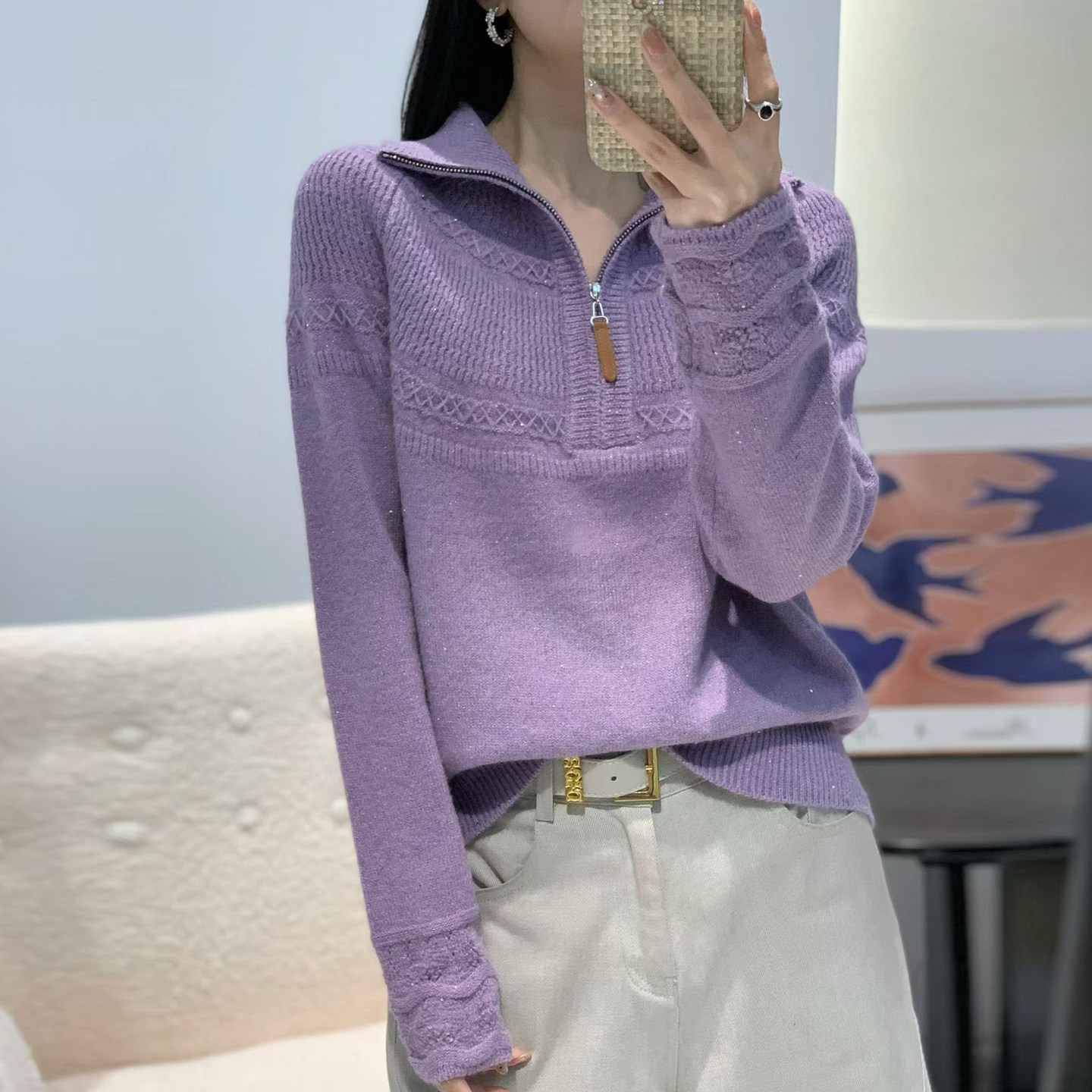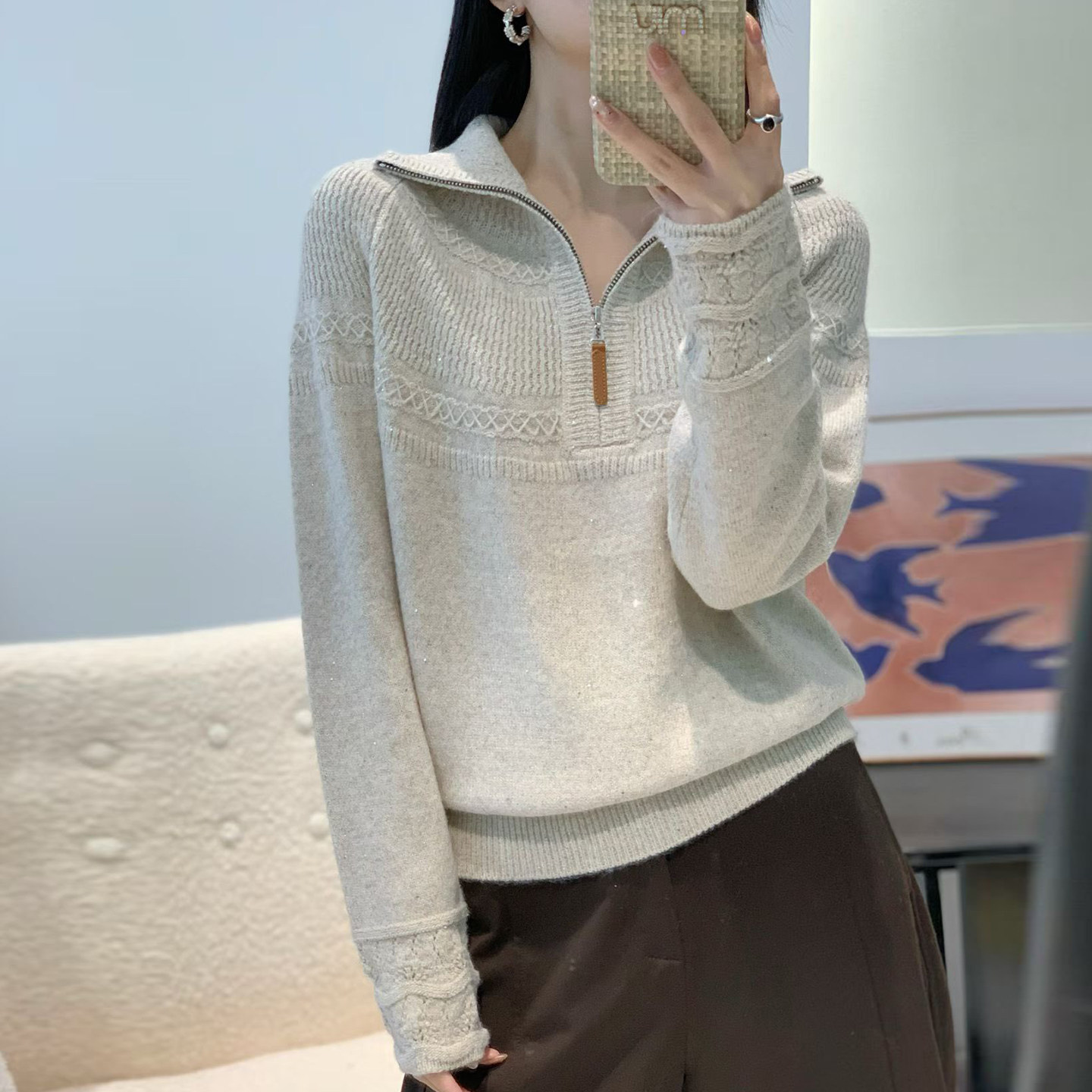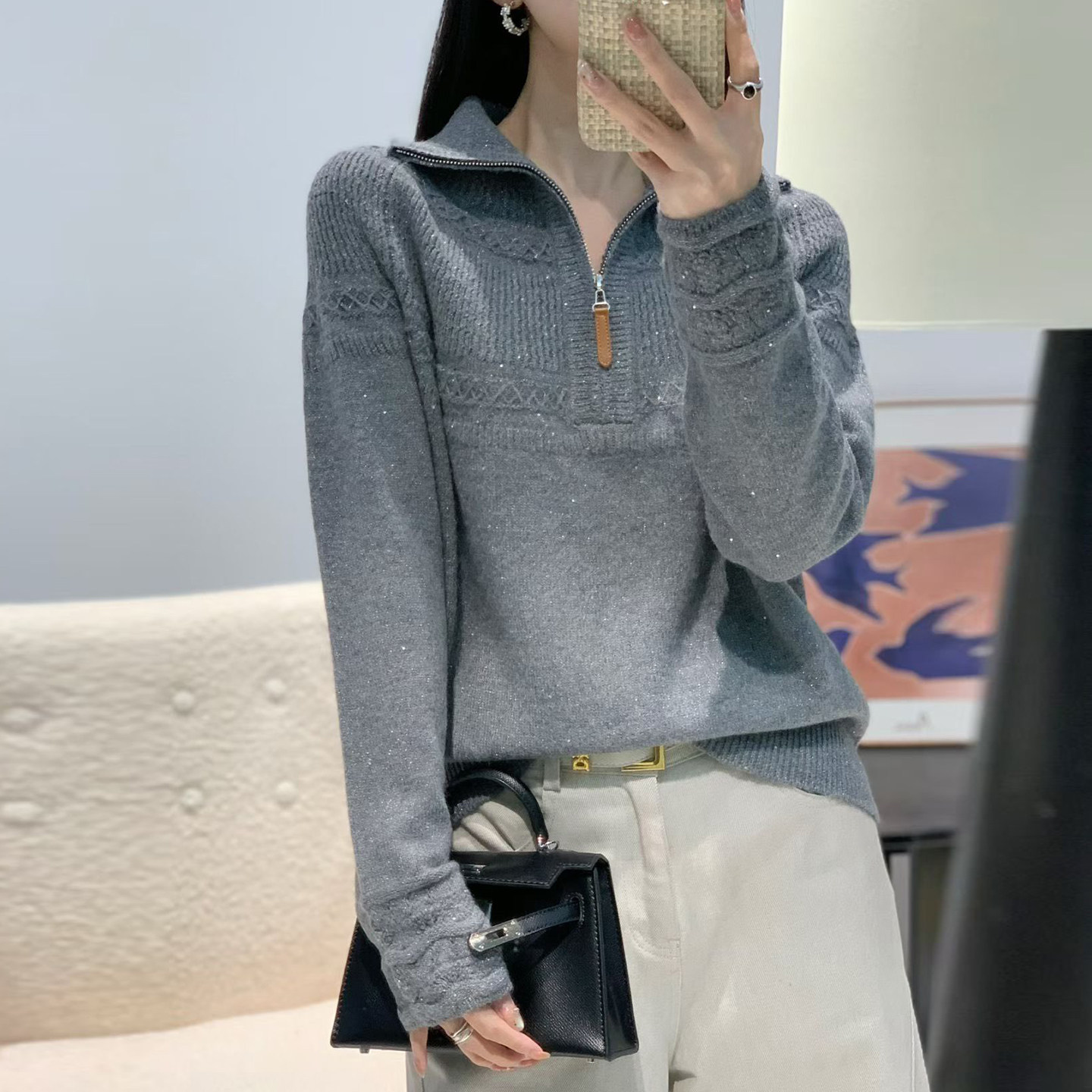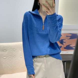 半拉链翻领亮片毛衣女2025秋冬新款 提花密熊羊毛宽松打底针织衫