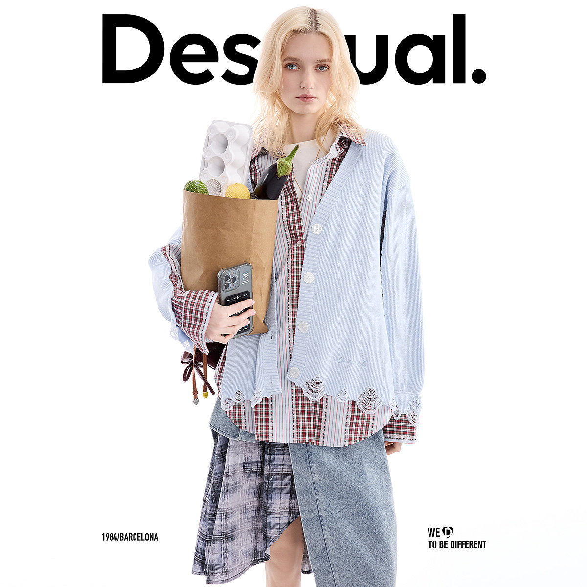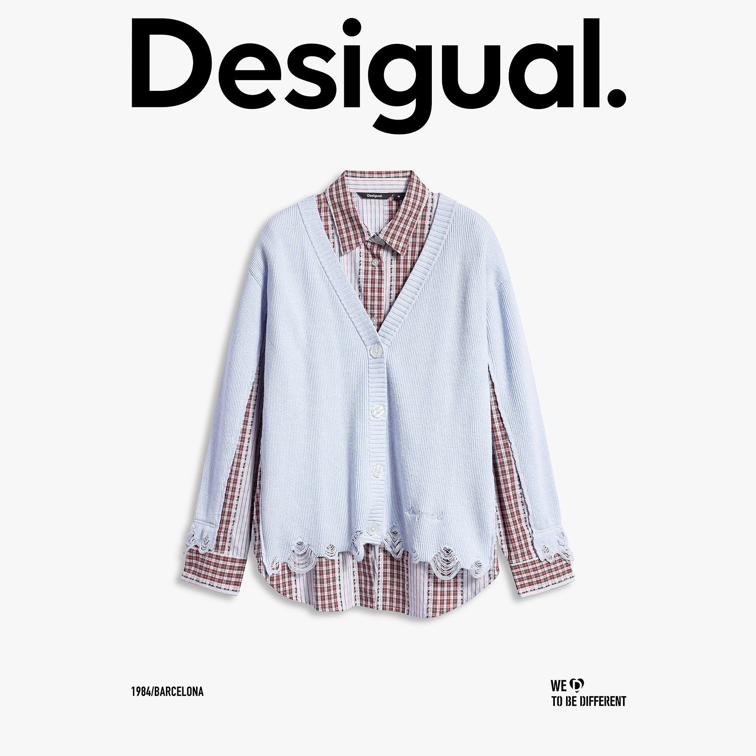 衬衫 假两件女式 宽松针织破洞拼接条纹格纹长袖 Desigual26春夏新品