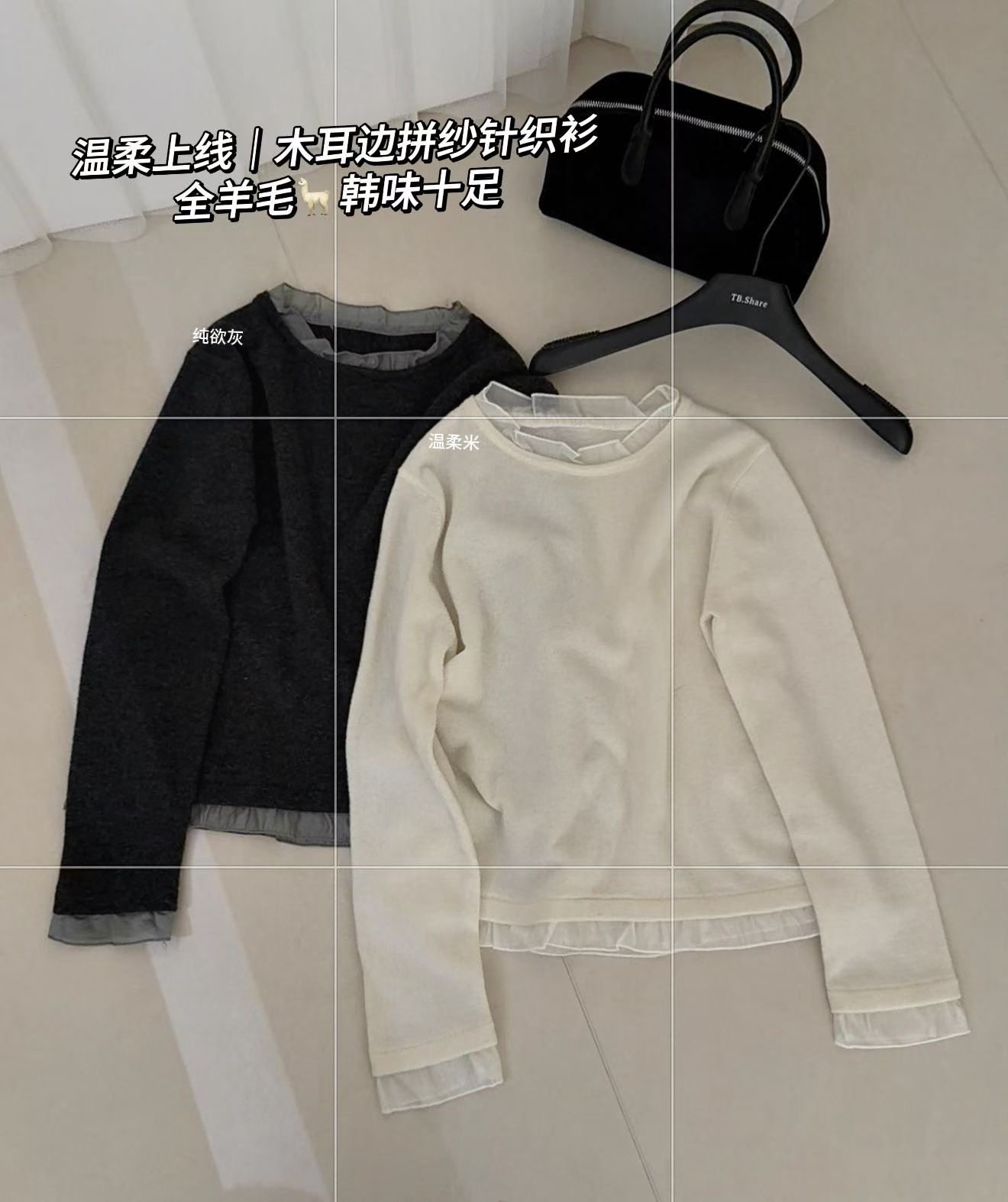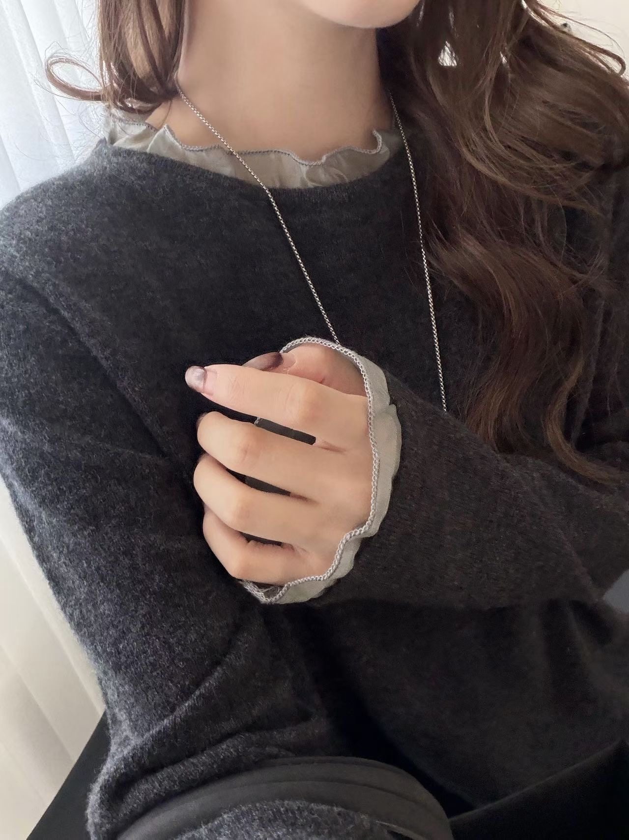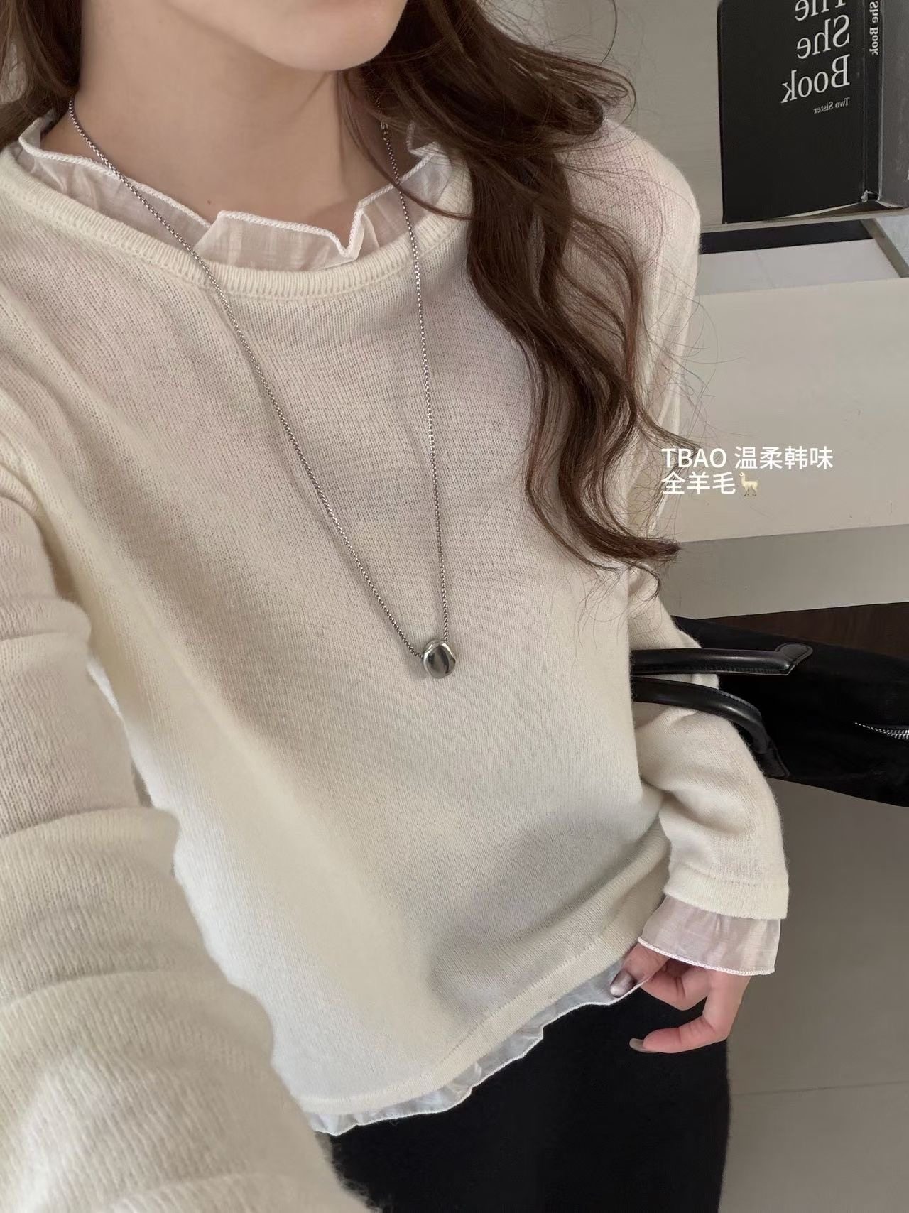 2025冬季 韩系简约百搭圆领拼接蕾丝花边羊毛打底 新款