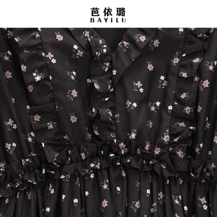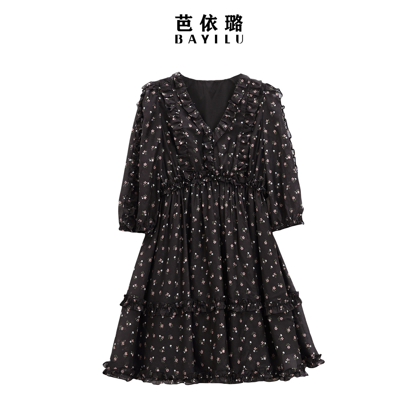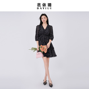 雪纺黑色韩版 芭依璐2026春季 连衣裙透气收腰法式 七分袖 长裙女 新款