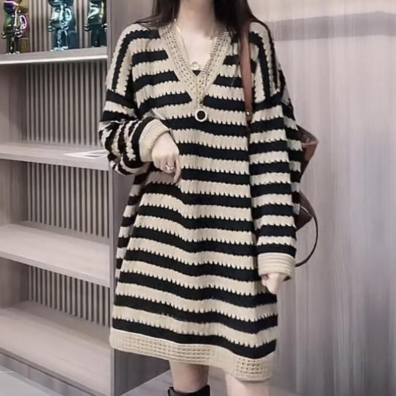针织衫 条纹中长款 裙子胖mm宽松显瘦V领毛衣连衣裙 女装 胖人特大码