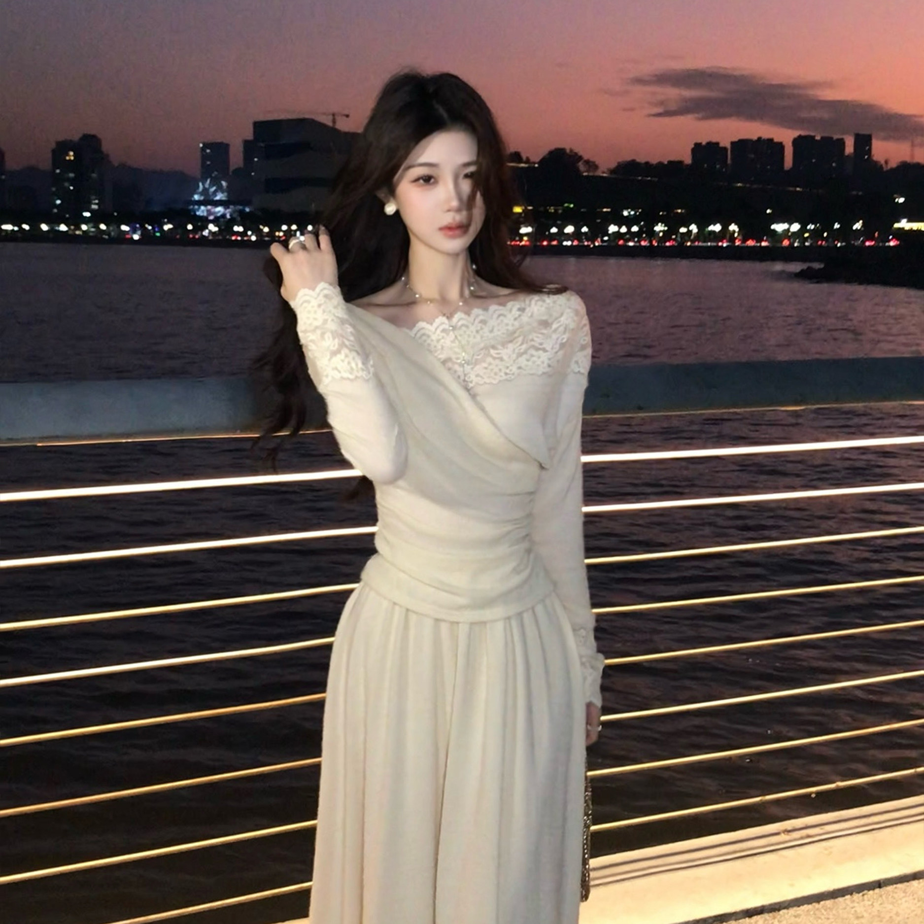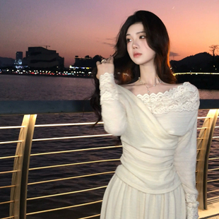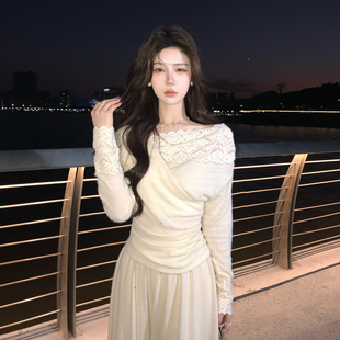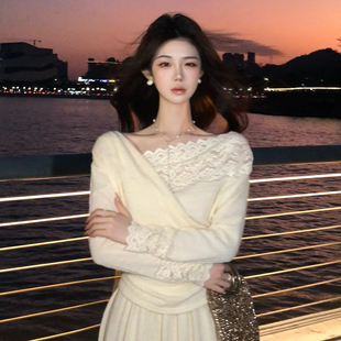 冬 针织蕾丝拼接上衣垂感半身裙套装 木子李 李设计感精致温柔长袖