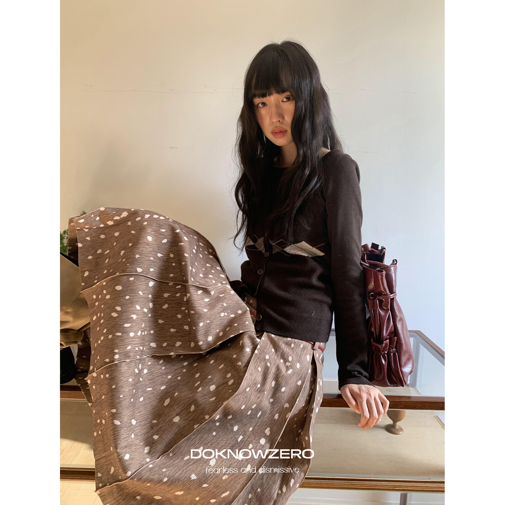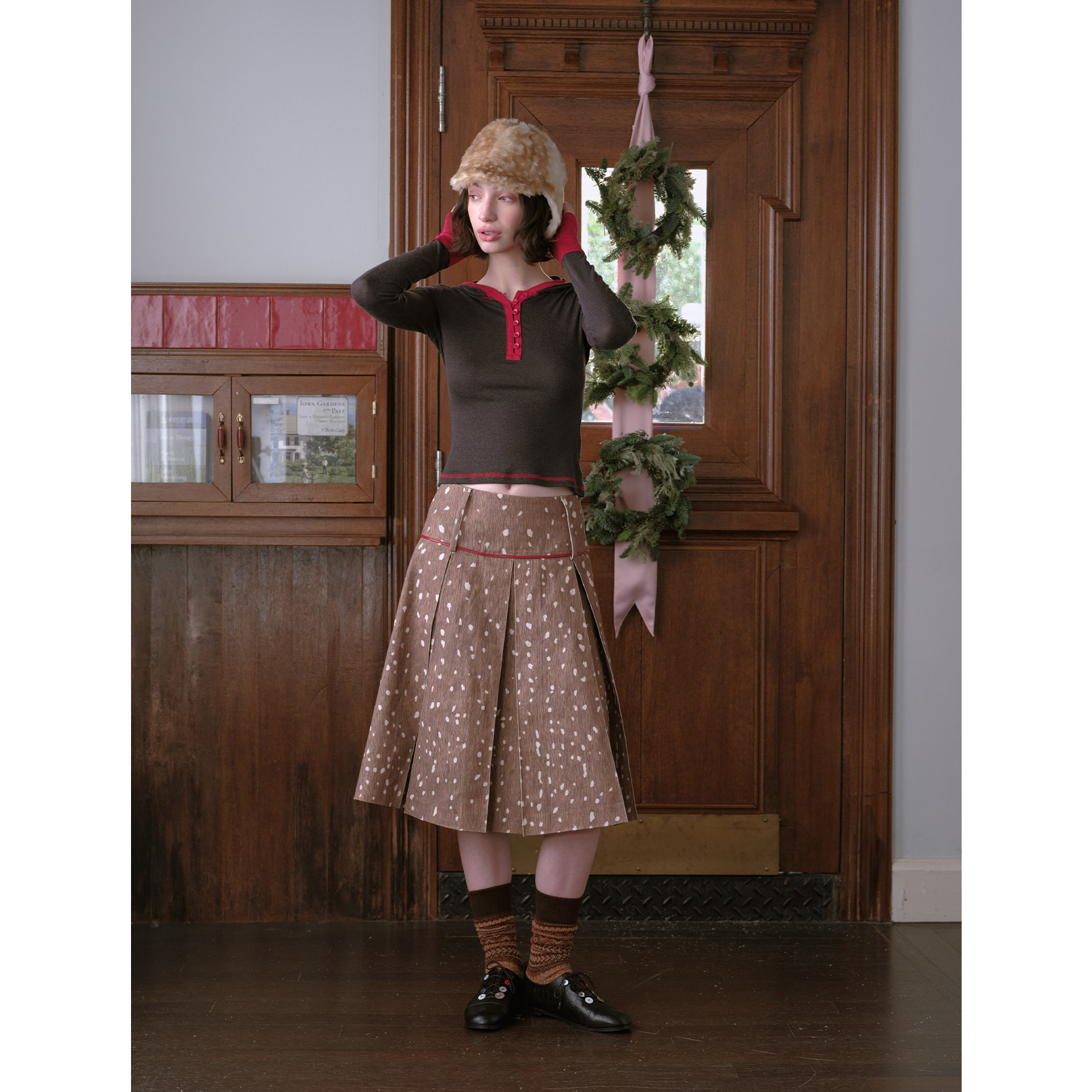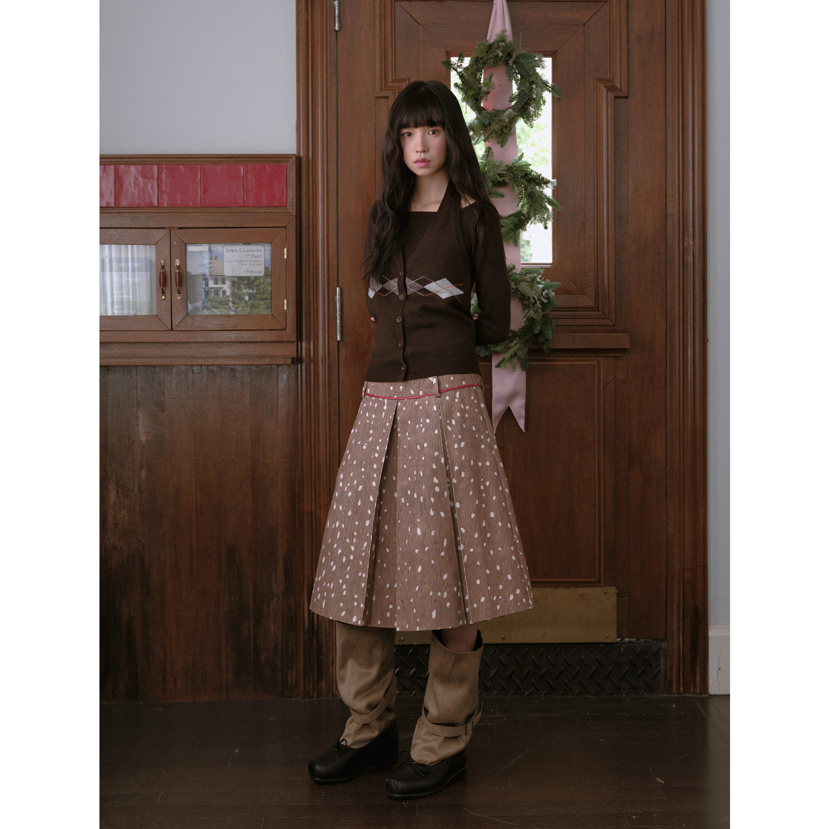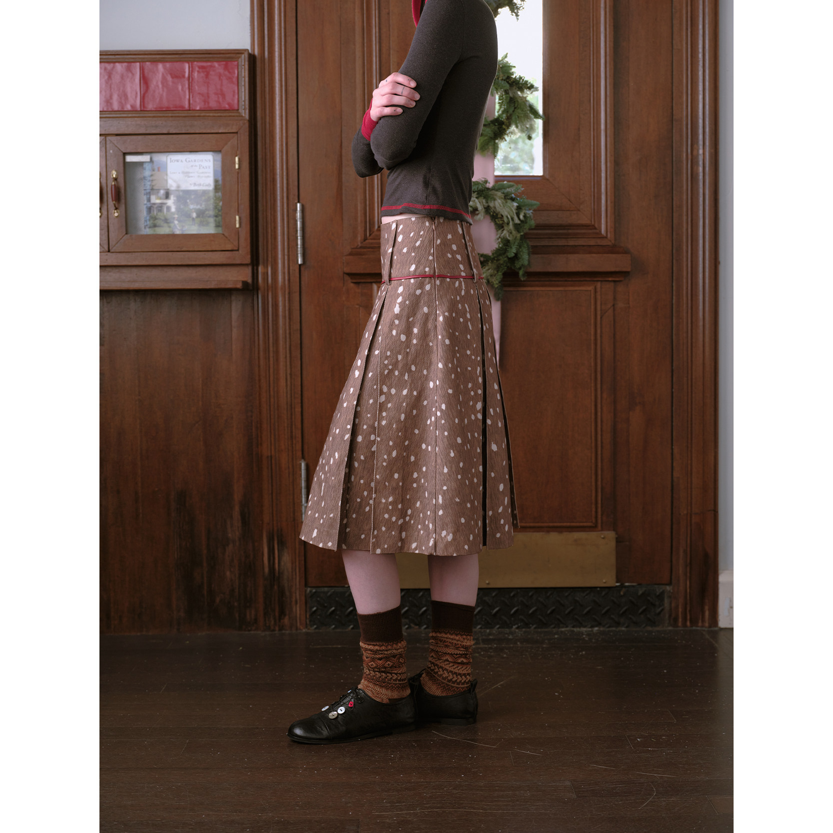 DKZ 复古水洗中裙 咖色小鹿纹百褶半身裙女秋冬新款