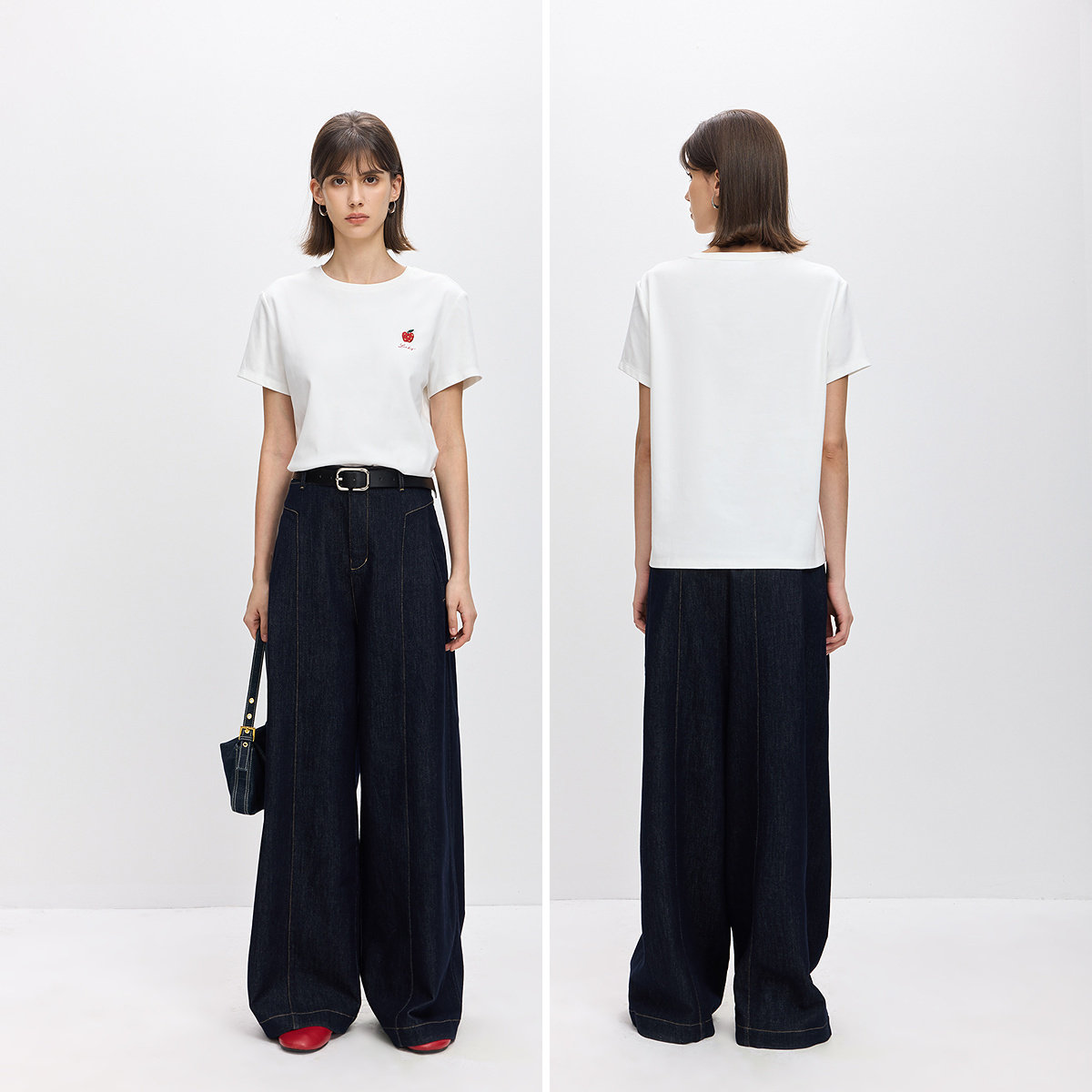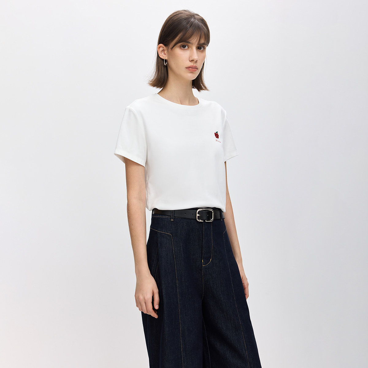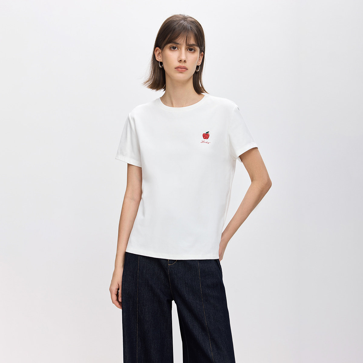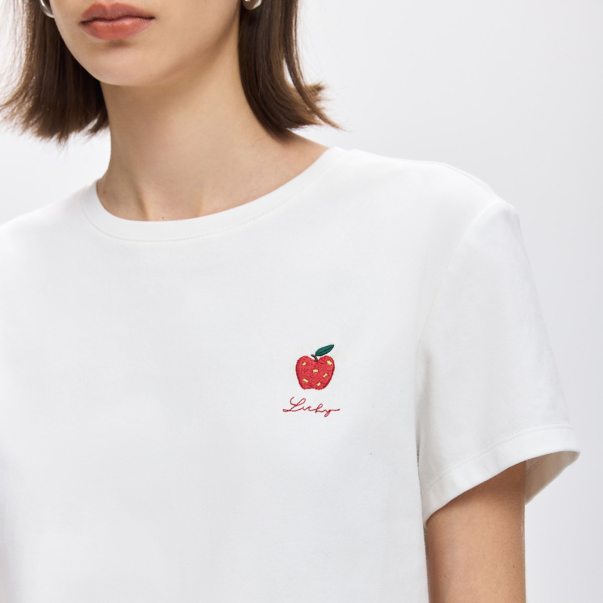 LILY2026春新款 T恤女 撞色苹果刺绣磨毛暖感休闲通勤圆领白色短袖