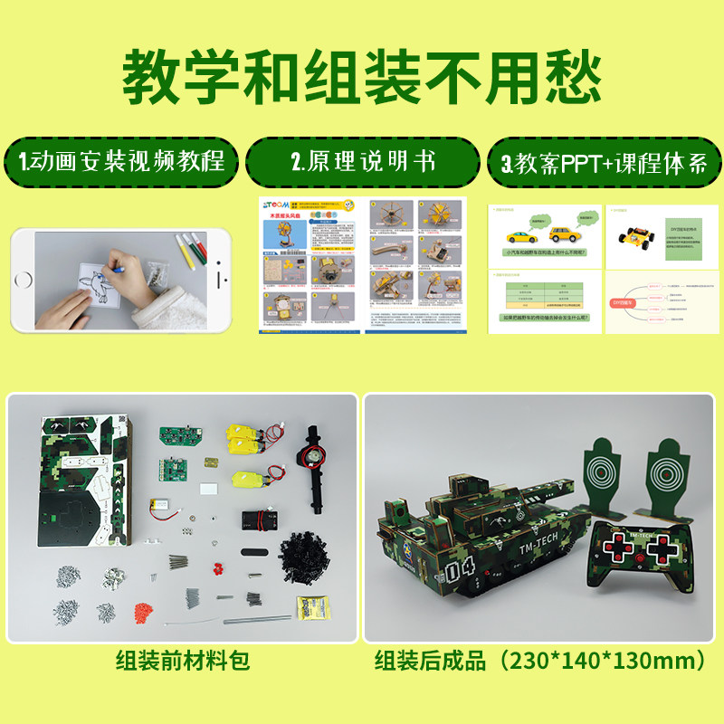 DIY遥控坦克拼装 模型儿童科学实验教育玩具300°旋转木质战车
