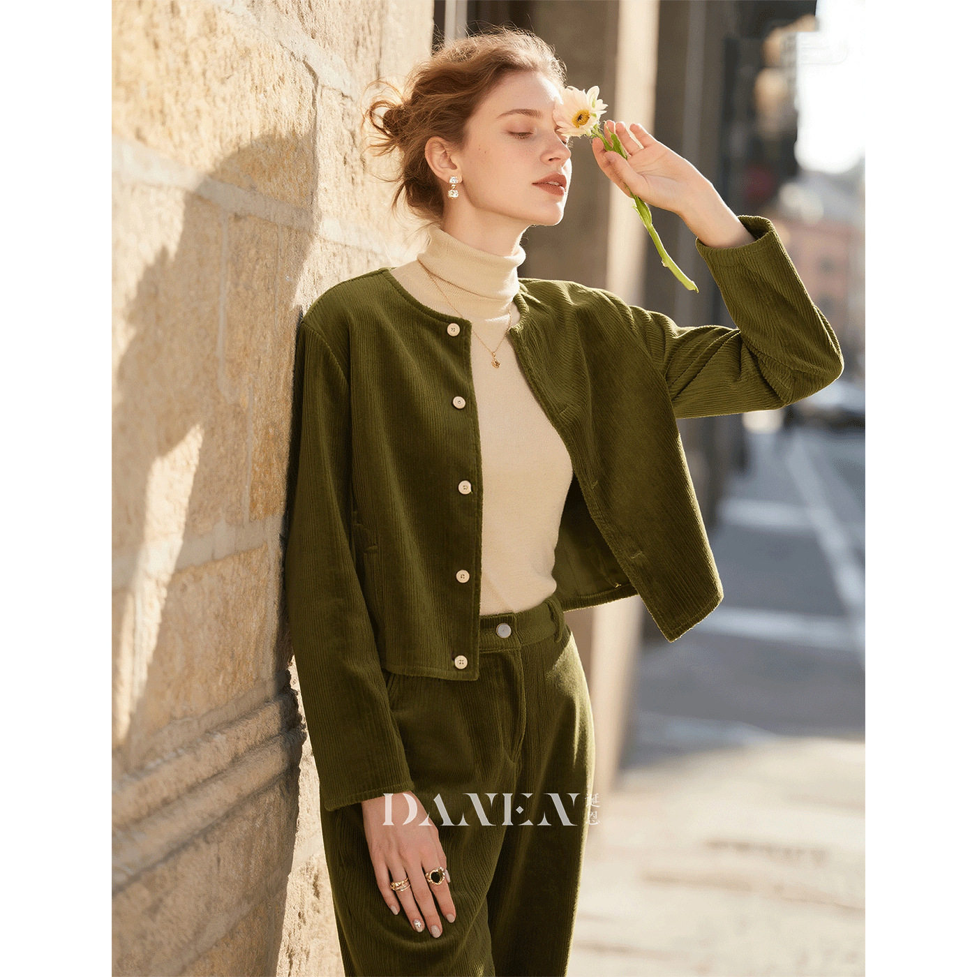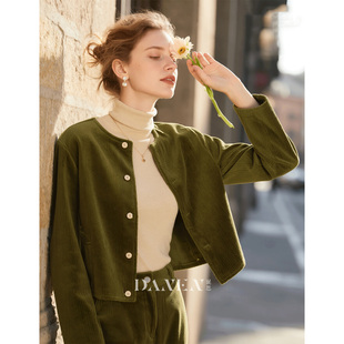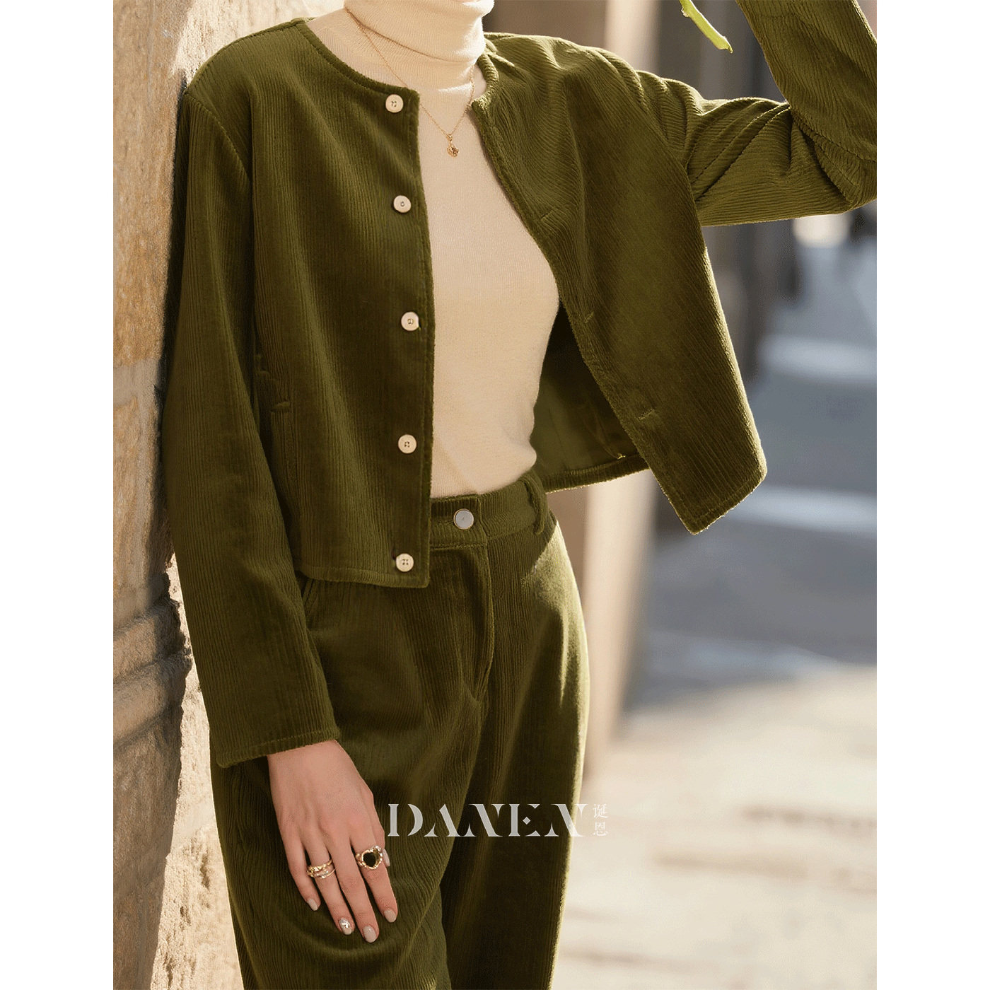 两件套 轻奢优雅风短外套阔腿裤 橄榄绿灯芯绒套装 女2025年秋冬新款