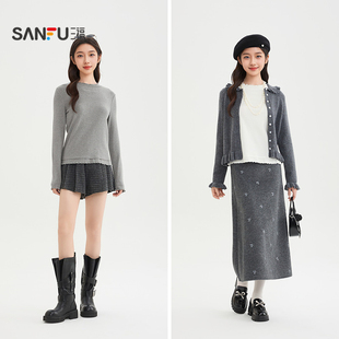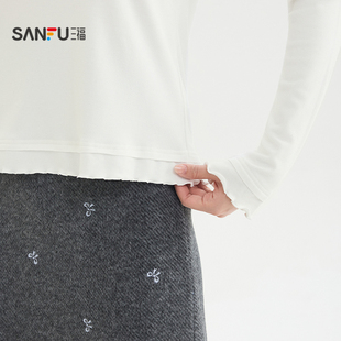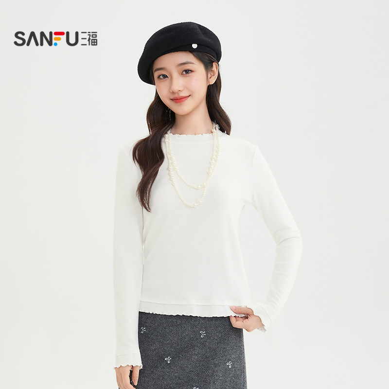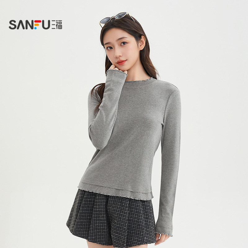 上衣女装 三福打底女衫 木耳边t恤休闲圆领长袖 秋季 515866 2025新款
