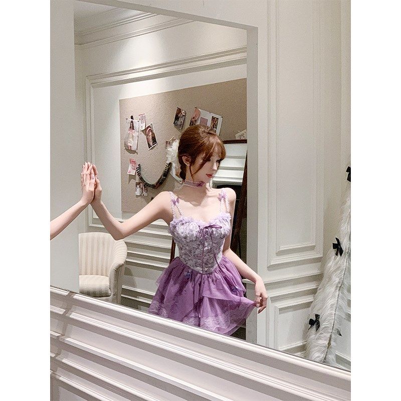 GirlyFancyClub娇憨甜心 生日派对粉色厚缎毛毛边吊带蓬蓬连衣裙