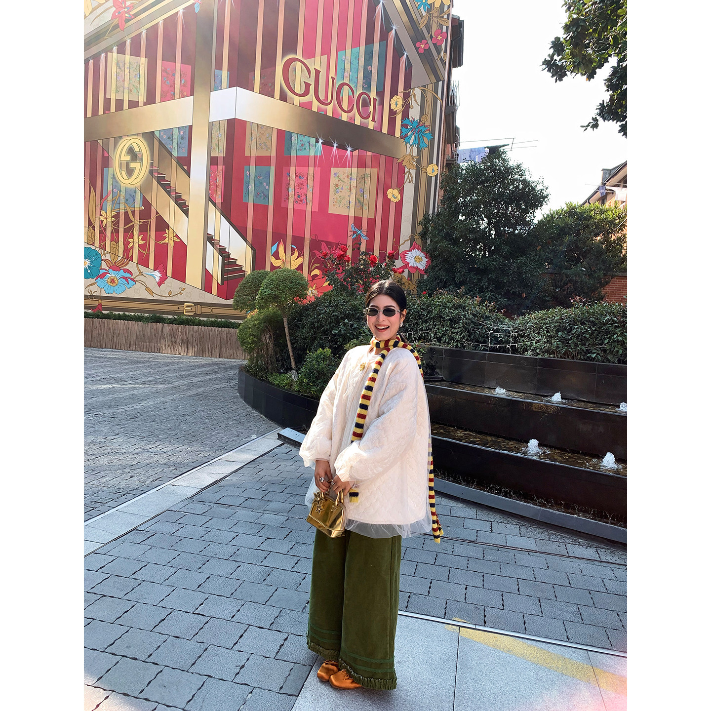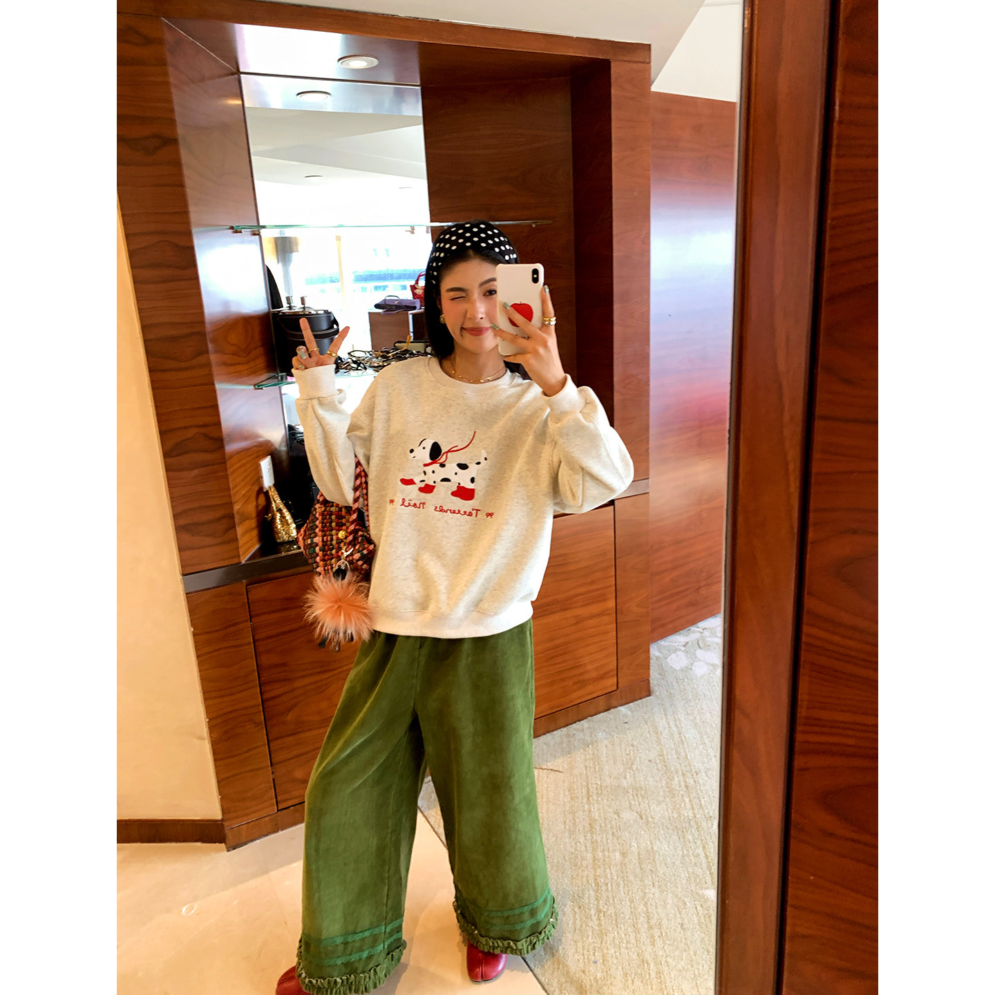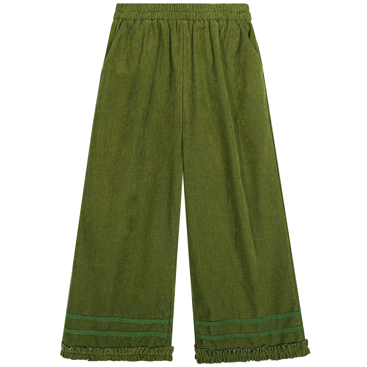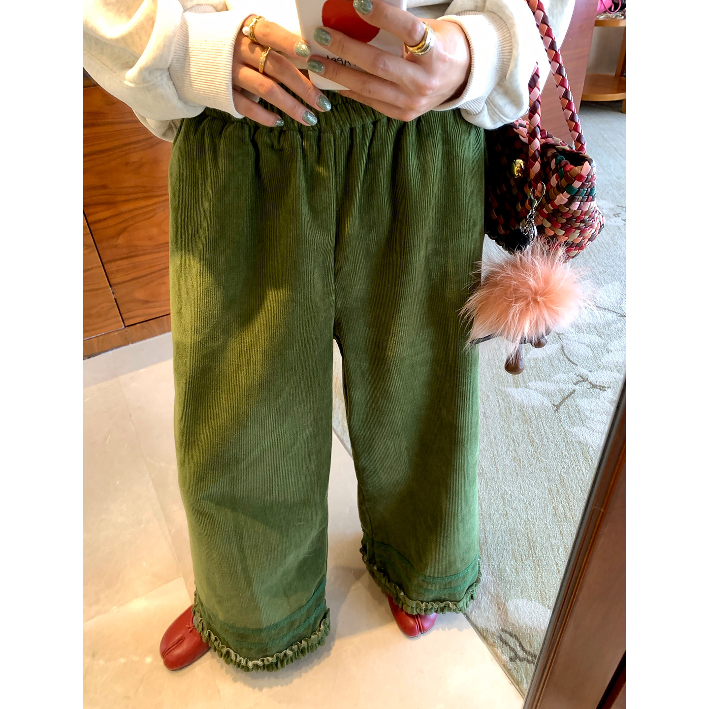 设计感小众绿色 松紧腰灯芯绒阔腿裤 今屿花花加绒裤 子女2025年新款