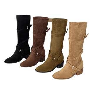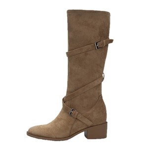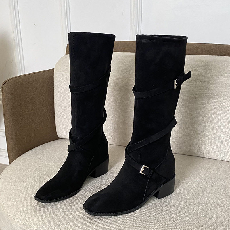 增高7cm大长腿尖圆头交叉带粗跟靴子中筒靴瘦瘦长靴女 Evsonen