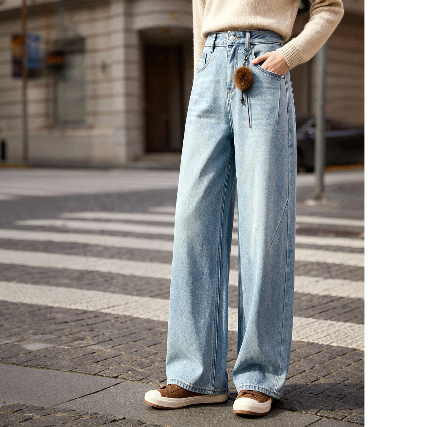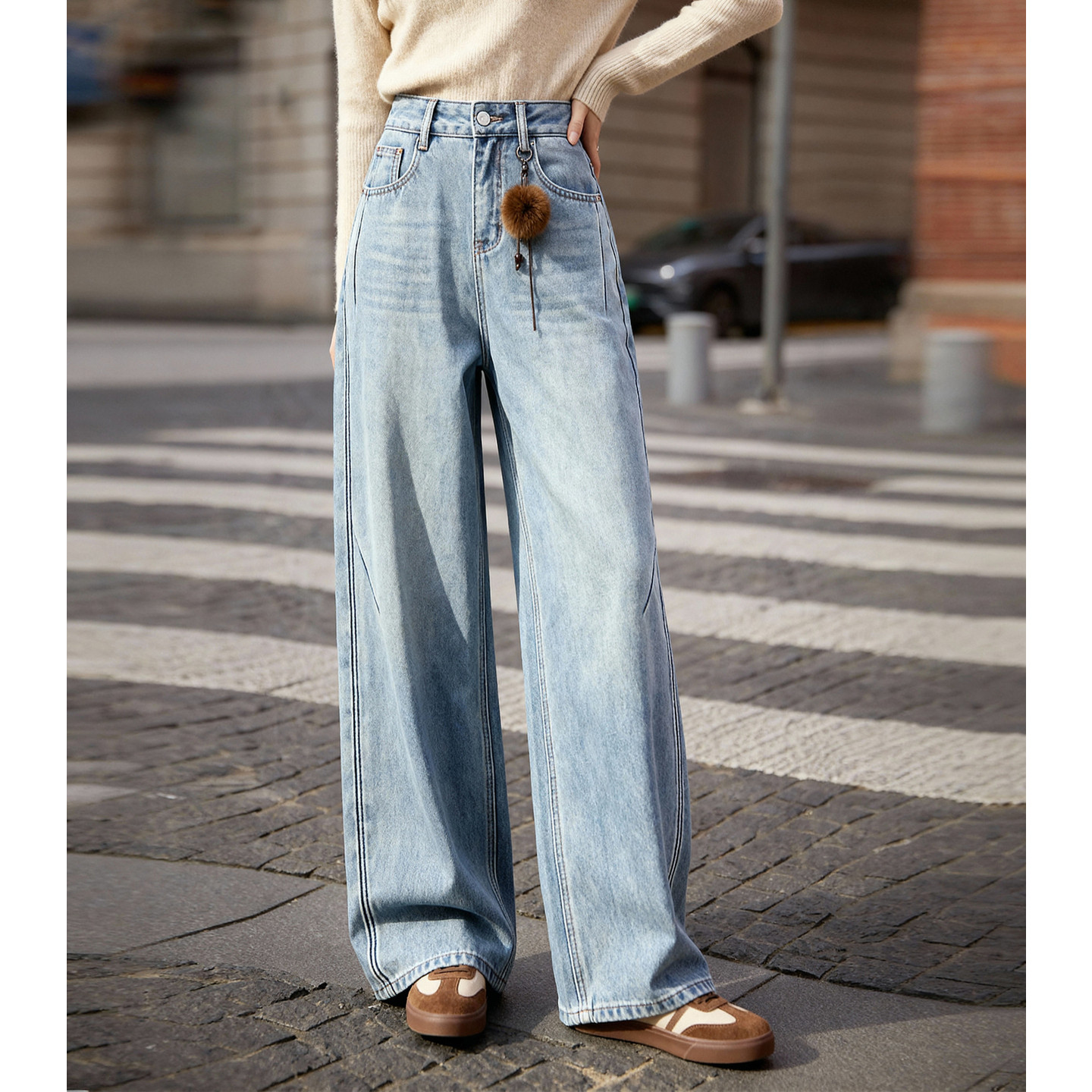 遮肉显瘦拖地裤 新款 子 女冬季 百家好复古高腰加绒保暖阔腿牛仔长裤