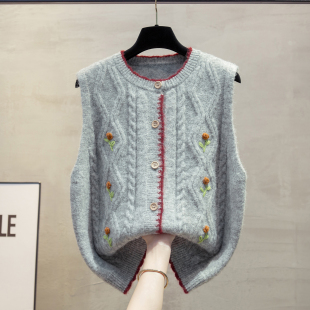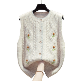手工花圆领开衫 宽松马夹麻花毛衣坎肩 针织马甲背心女2026春秋新款