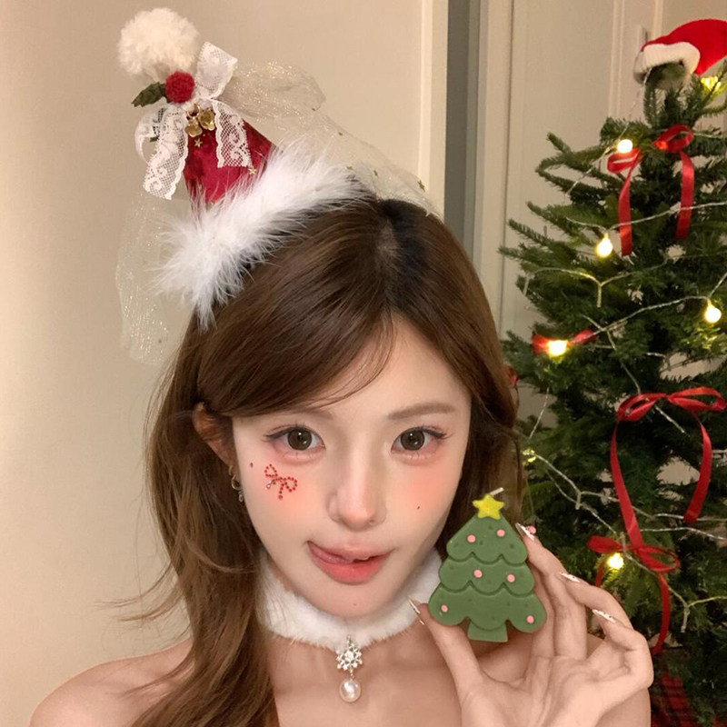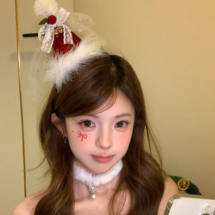 圣诞节红色圣诞帽子女冬季 氛围感蝴蝶结铃铛毛球头饰发饰毛绒帽