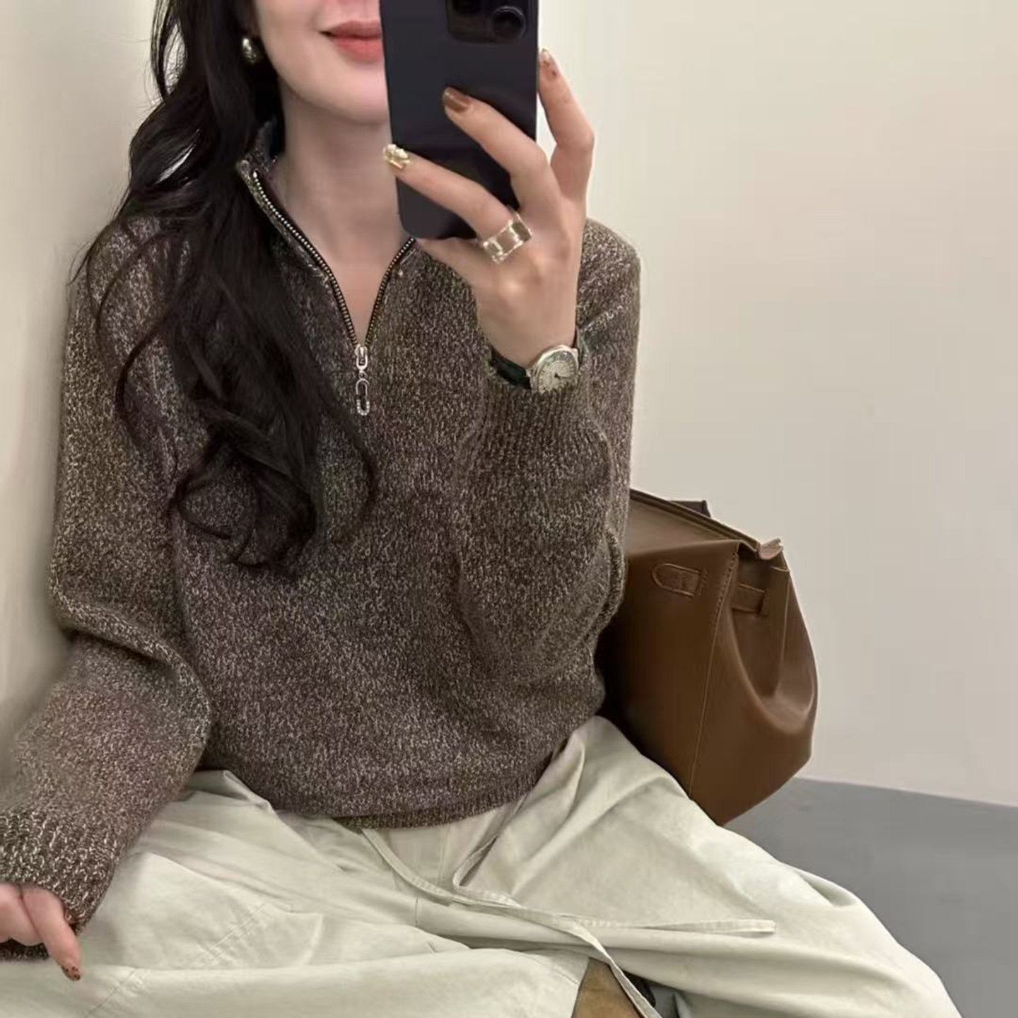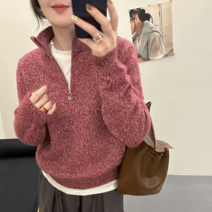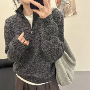 高级感绿色V领拉链毛衣女秋冬慵懒宽松气质针织衫 上衣