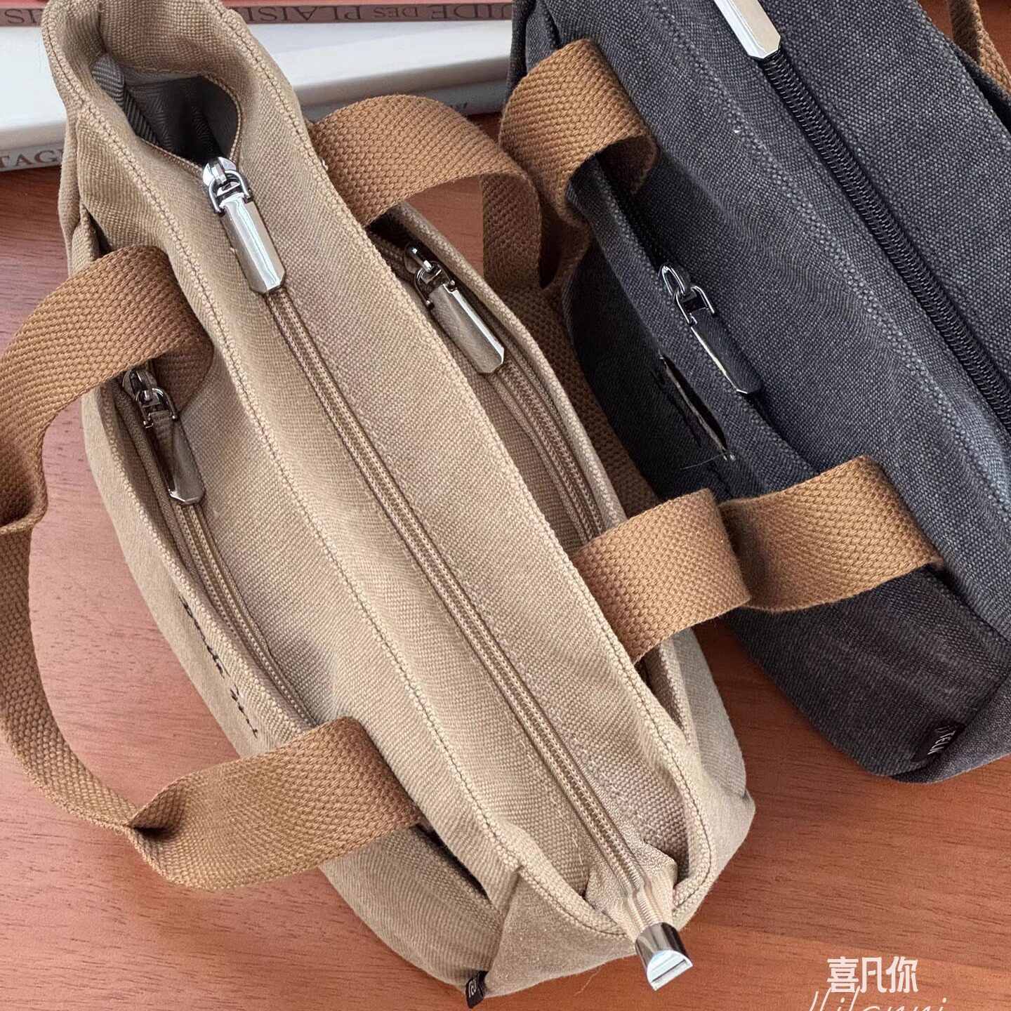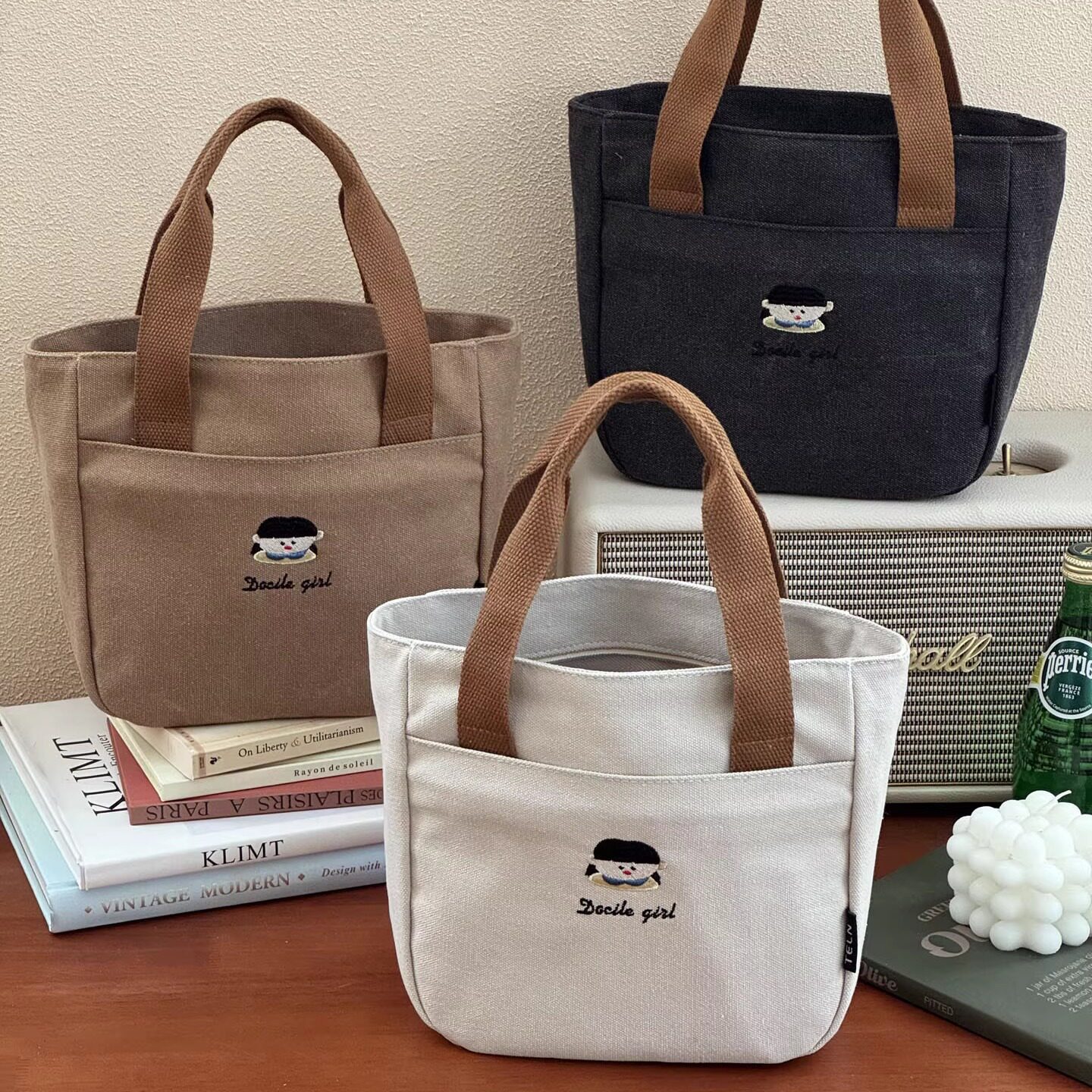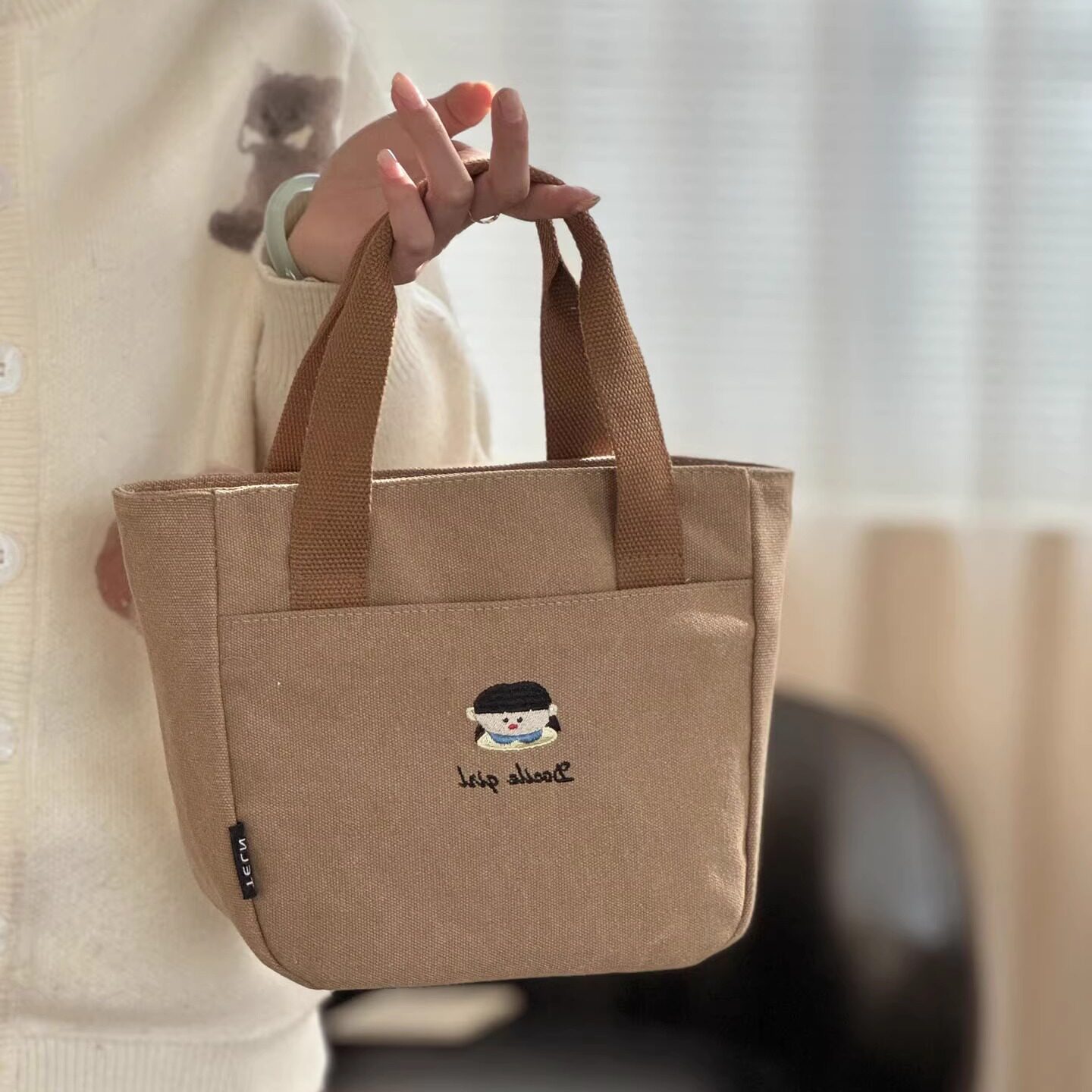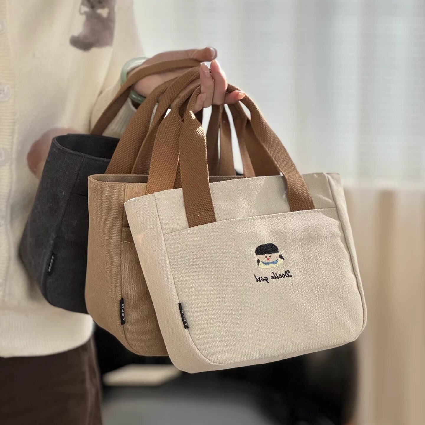 韩系卡通小女孩刺绣通勤加厚帆布手提包文艺日常便携学生餐盒包袋