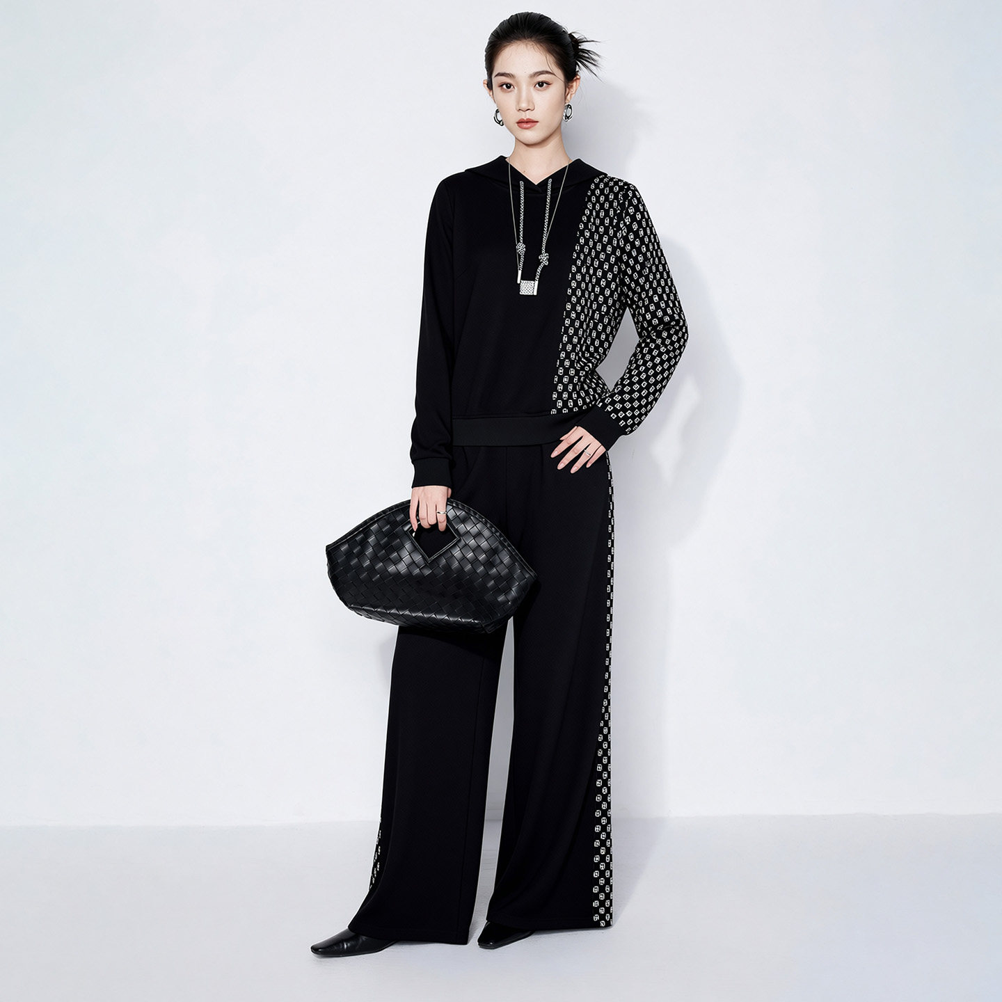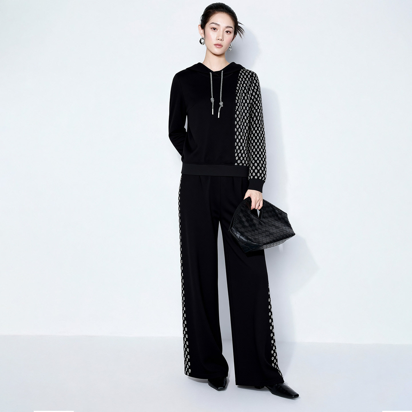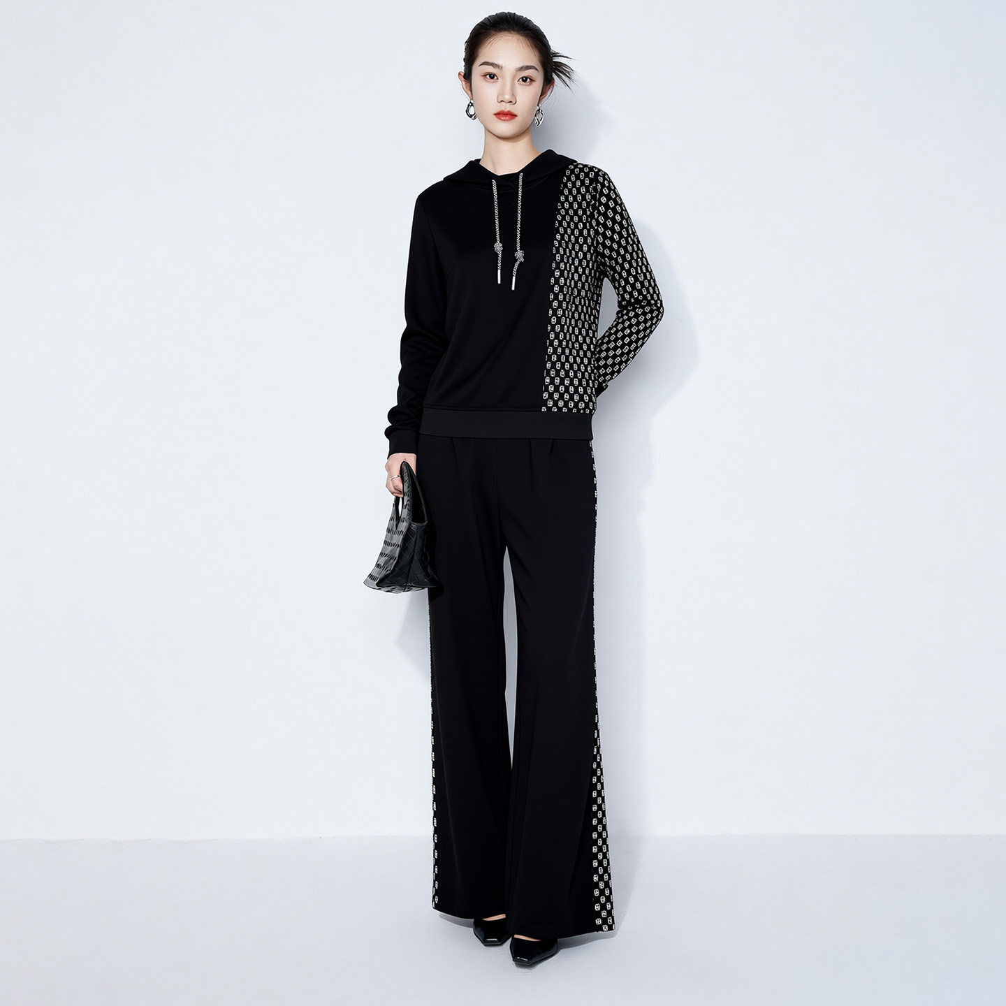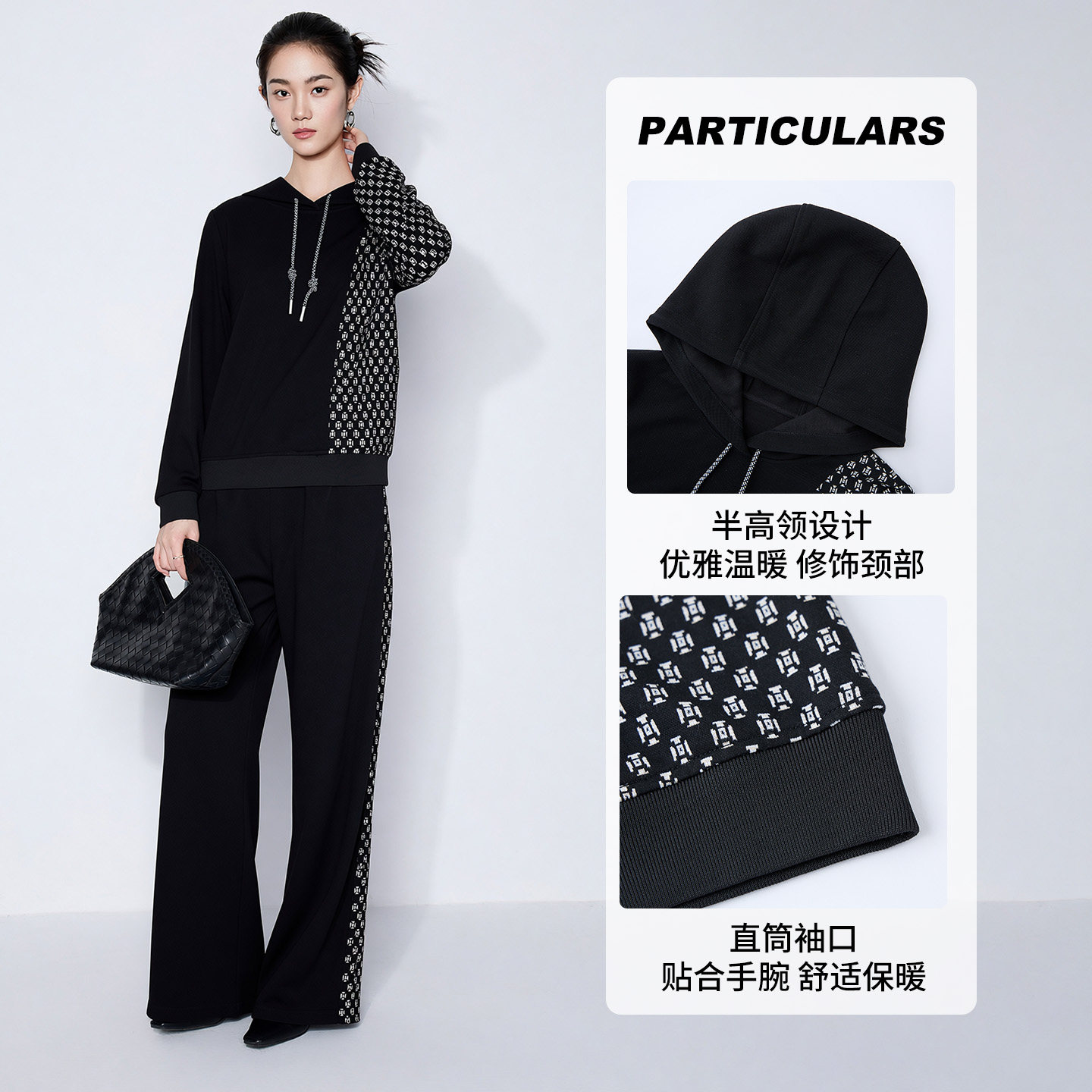 两件套装 子长裤 女 黑色连帽拼接印花卫衣休闲裤 马天奴2025秋冬新款