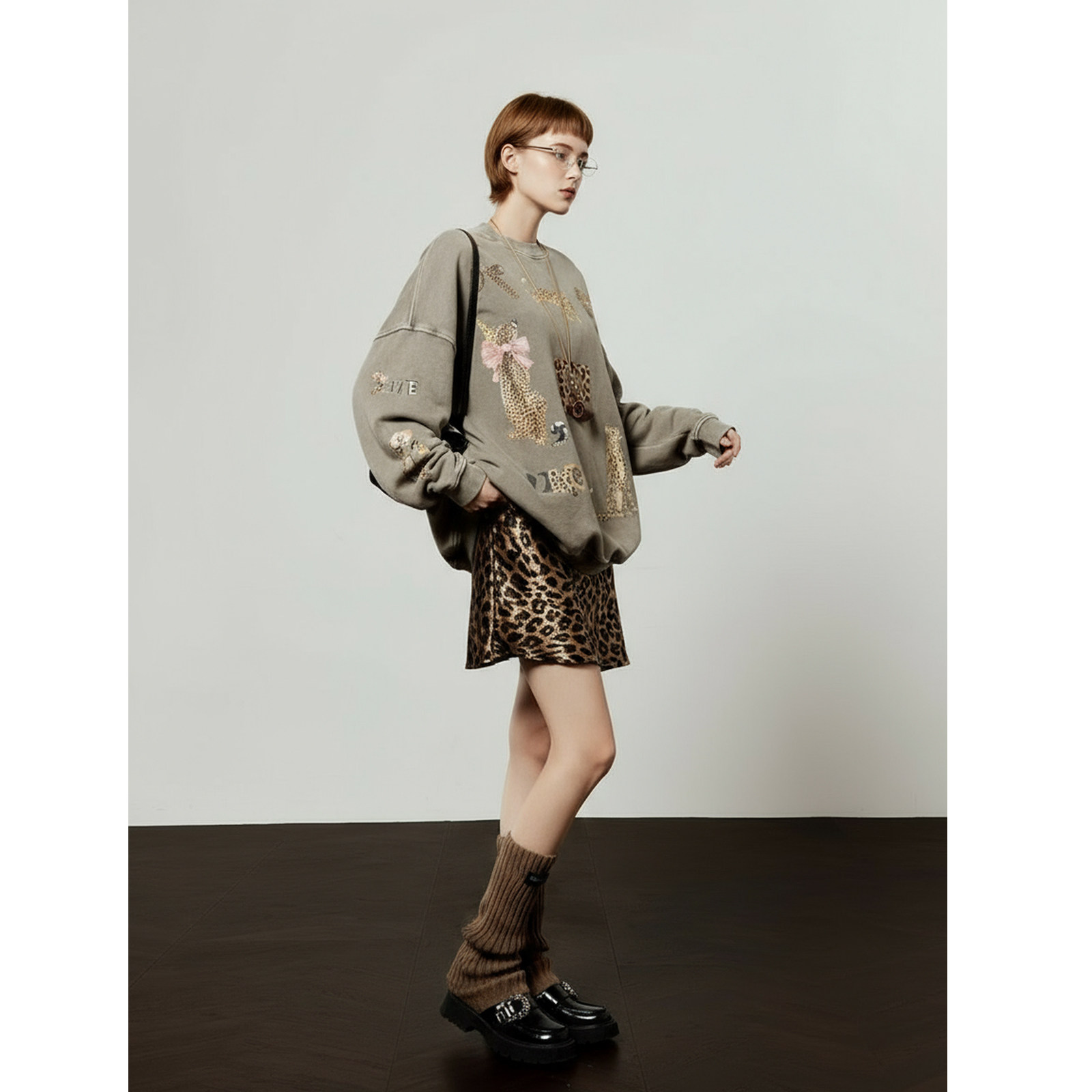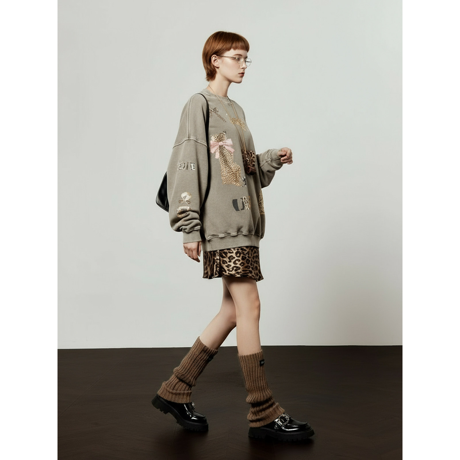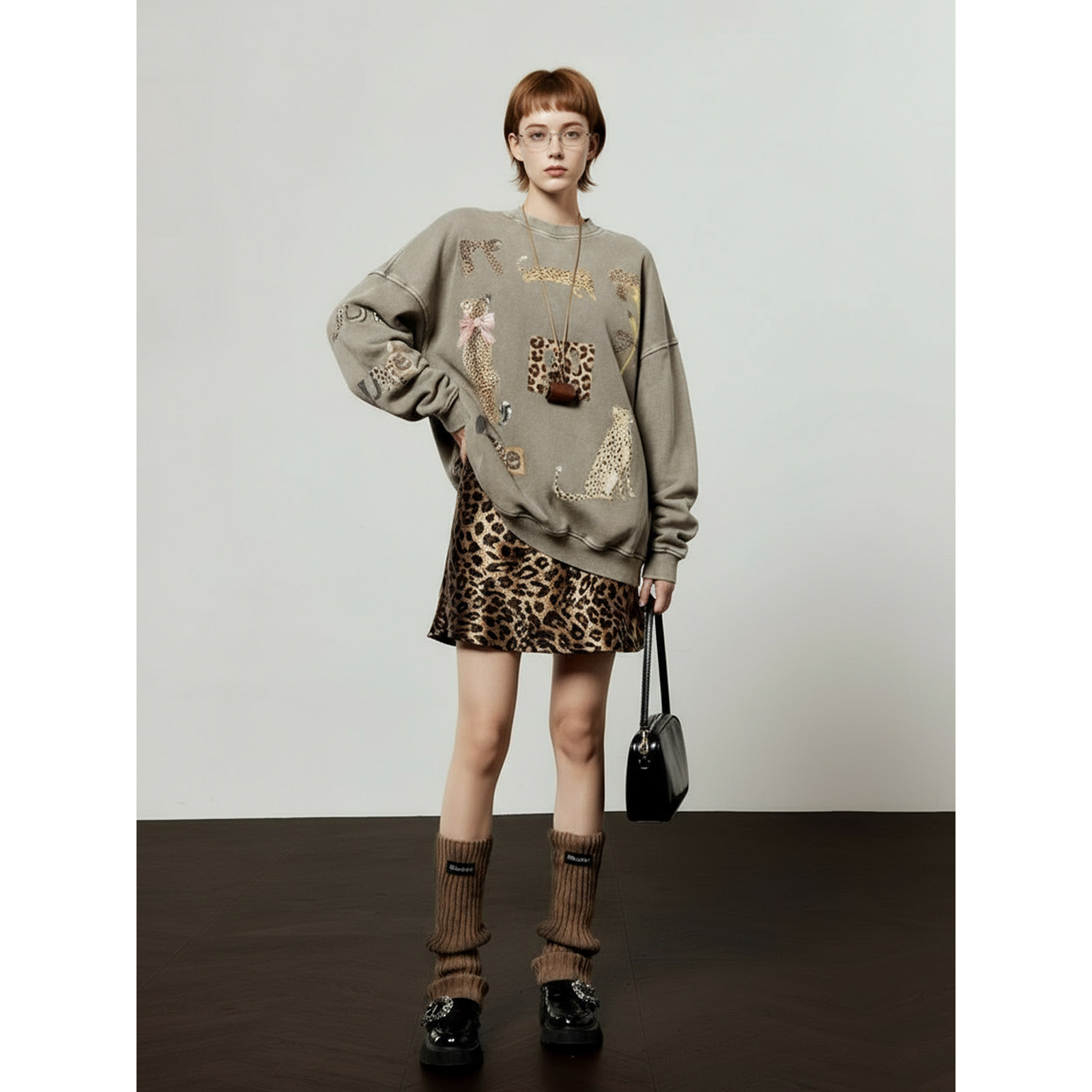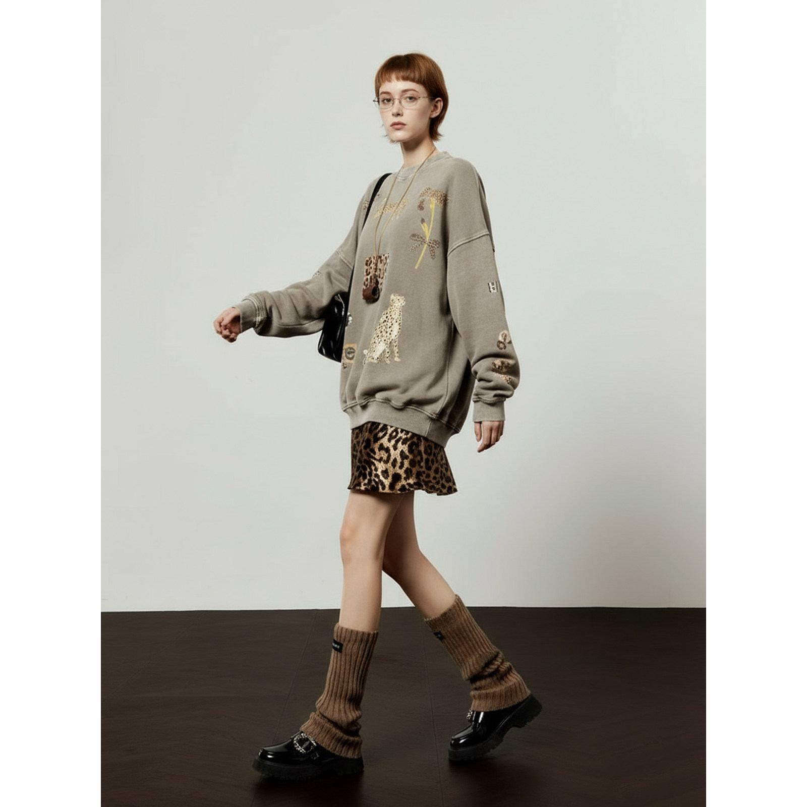 「周里物出品」灰色卫衣女2026春季 满印豹纹信徒印花休闲上衣 新款