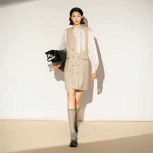 XG雪歌26春小香风双排扣粗花呢无袖 背心V领连衣裙女XL104007B130