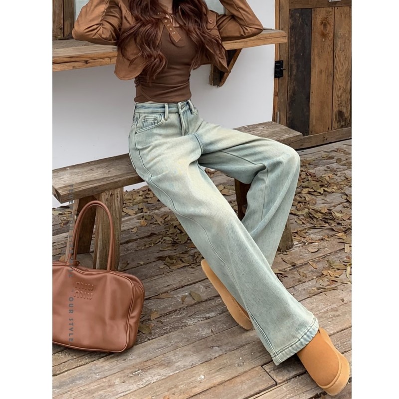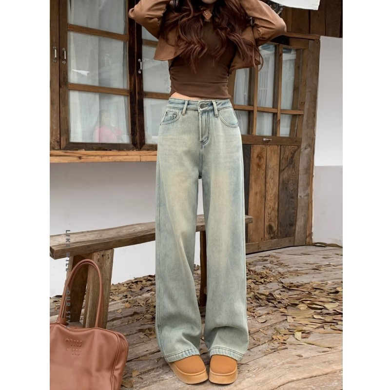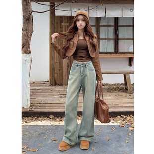 宽松显瘦拖地直筒裤 2025新款 子 女秋冬季 美拉德高腰加绒阔腿牛仔裤