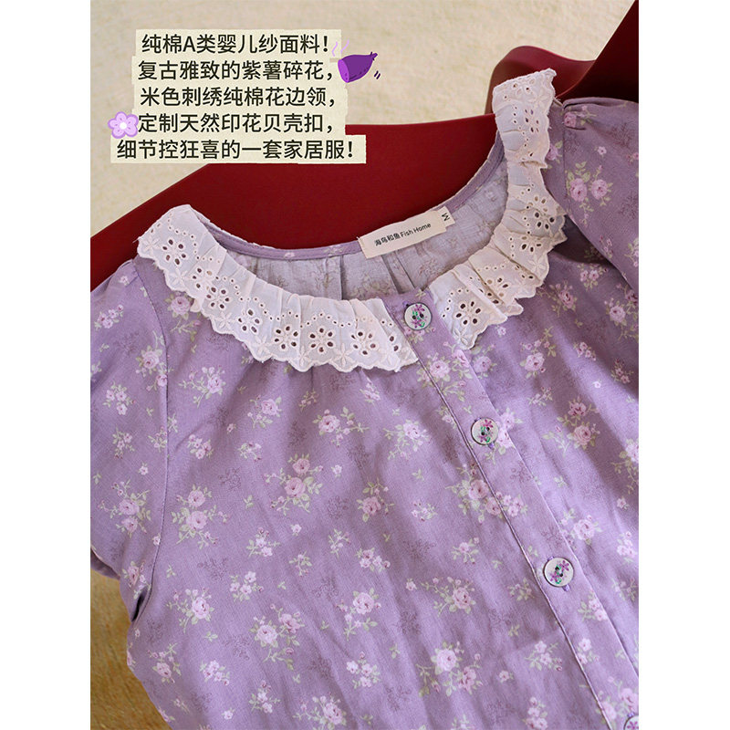 紫薯碎花·FishHome原创花边领纯棉纱布长袖 睡衣家居服2025新 长裤