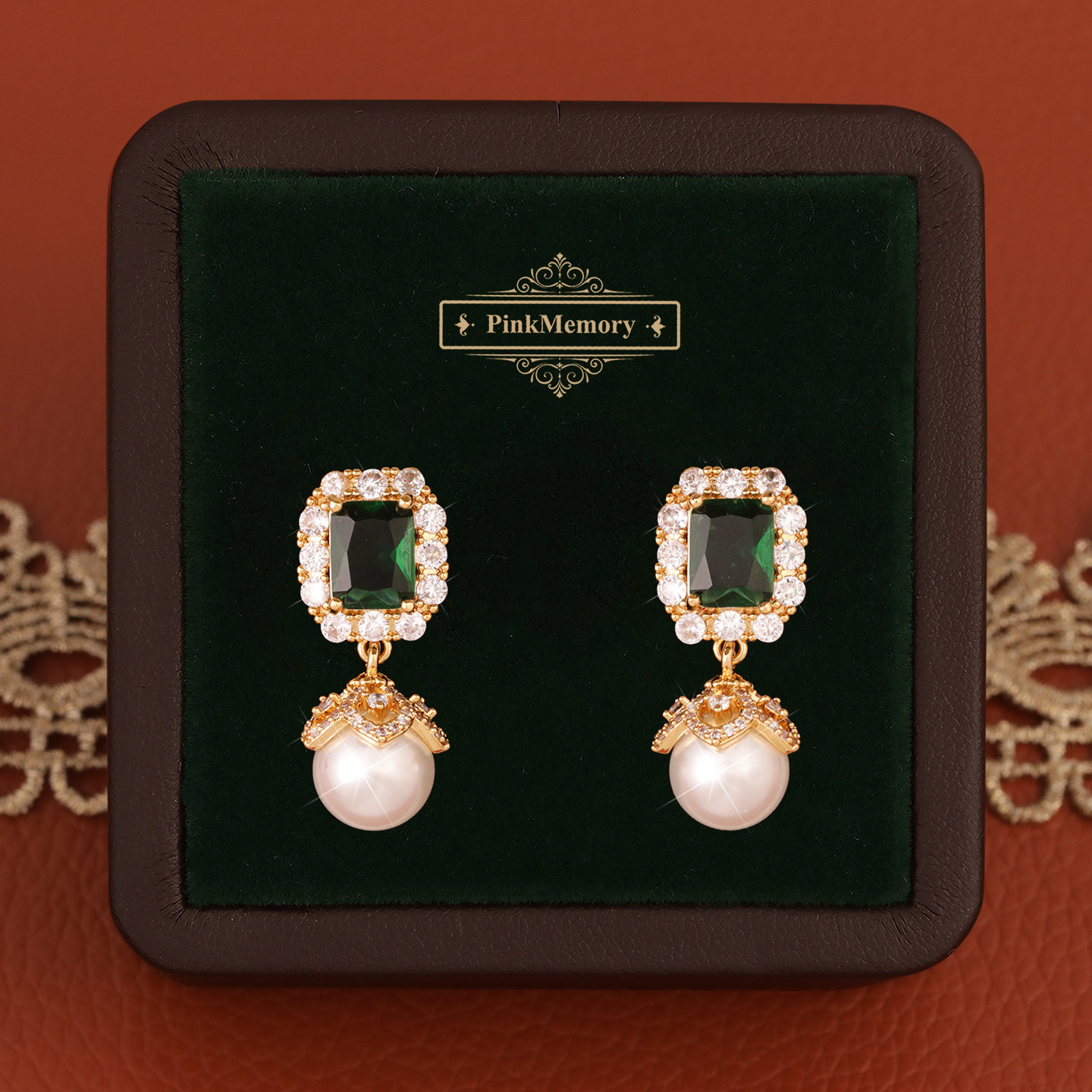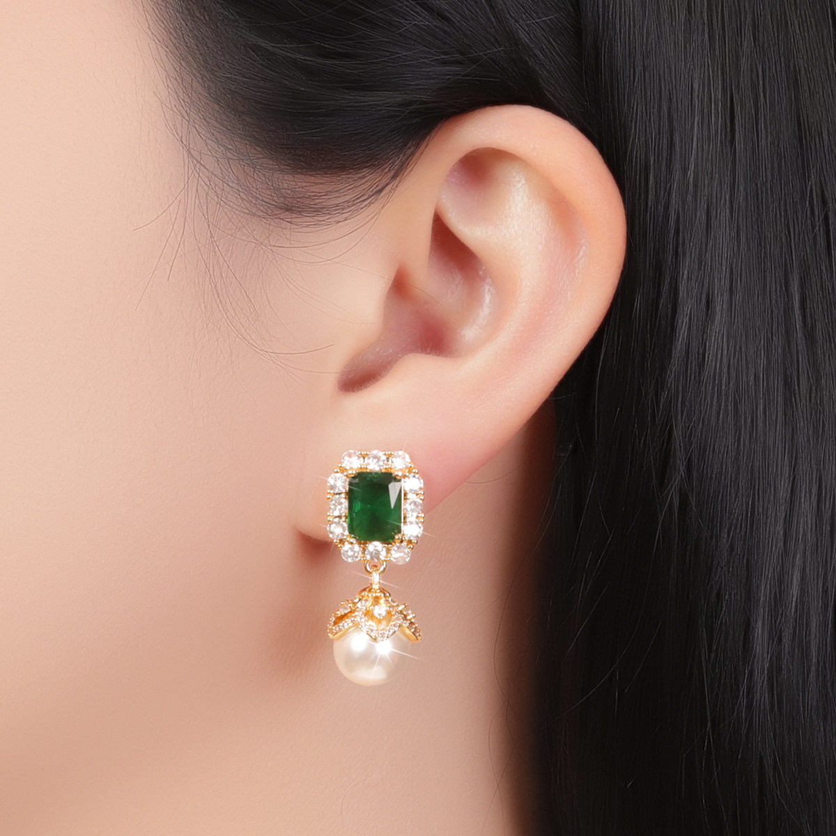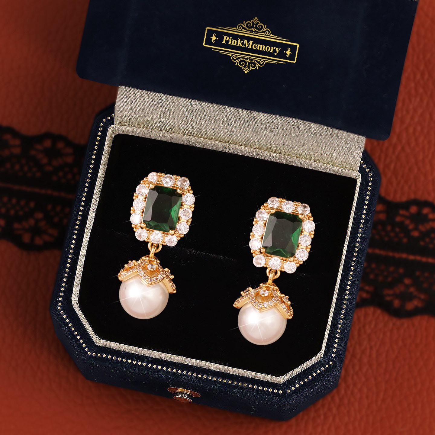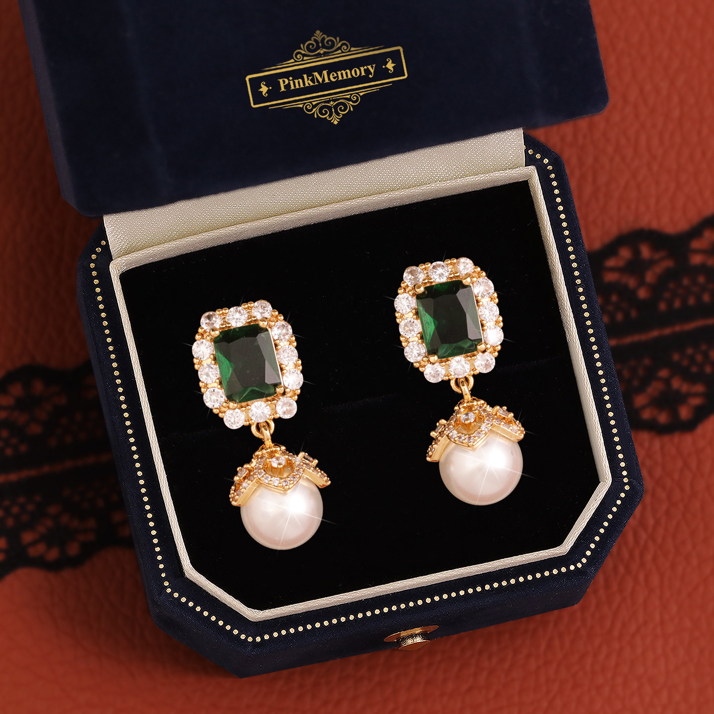 巴黎Pink 领针耳环 Memory满钻几何绿宝石珍珠耳钉高级感轻奢女款