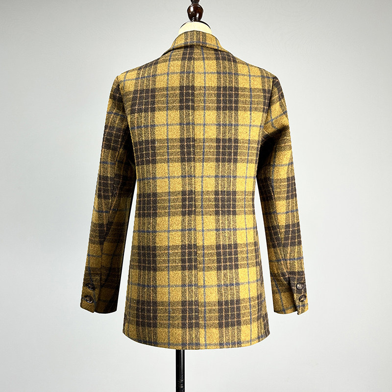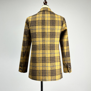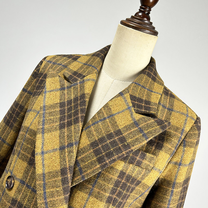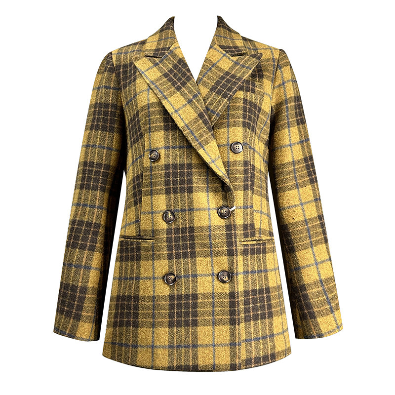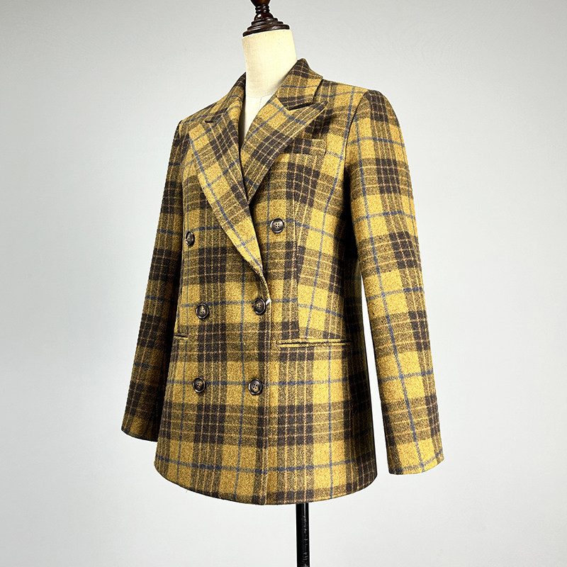 品牌黄色格子羊毛呢外套女2025秋冬修身 领加厚上衣 显瘦双排扣西装