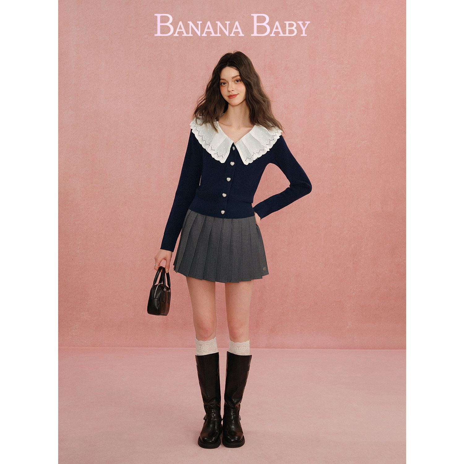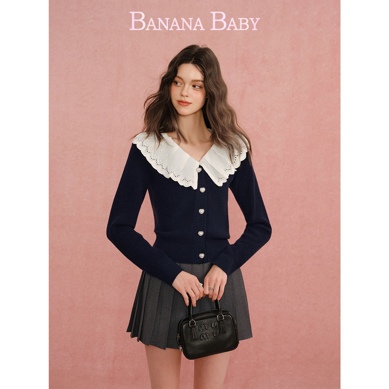甜美娃娃领珍珠扣针织开衫 BABY2026年春新款 BANANA 女 绵羊毛