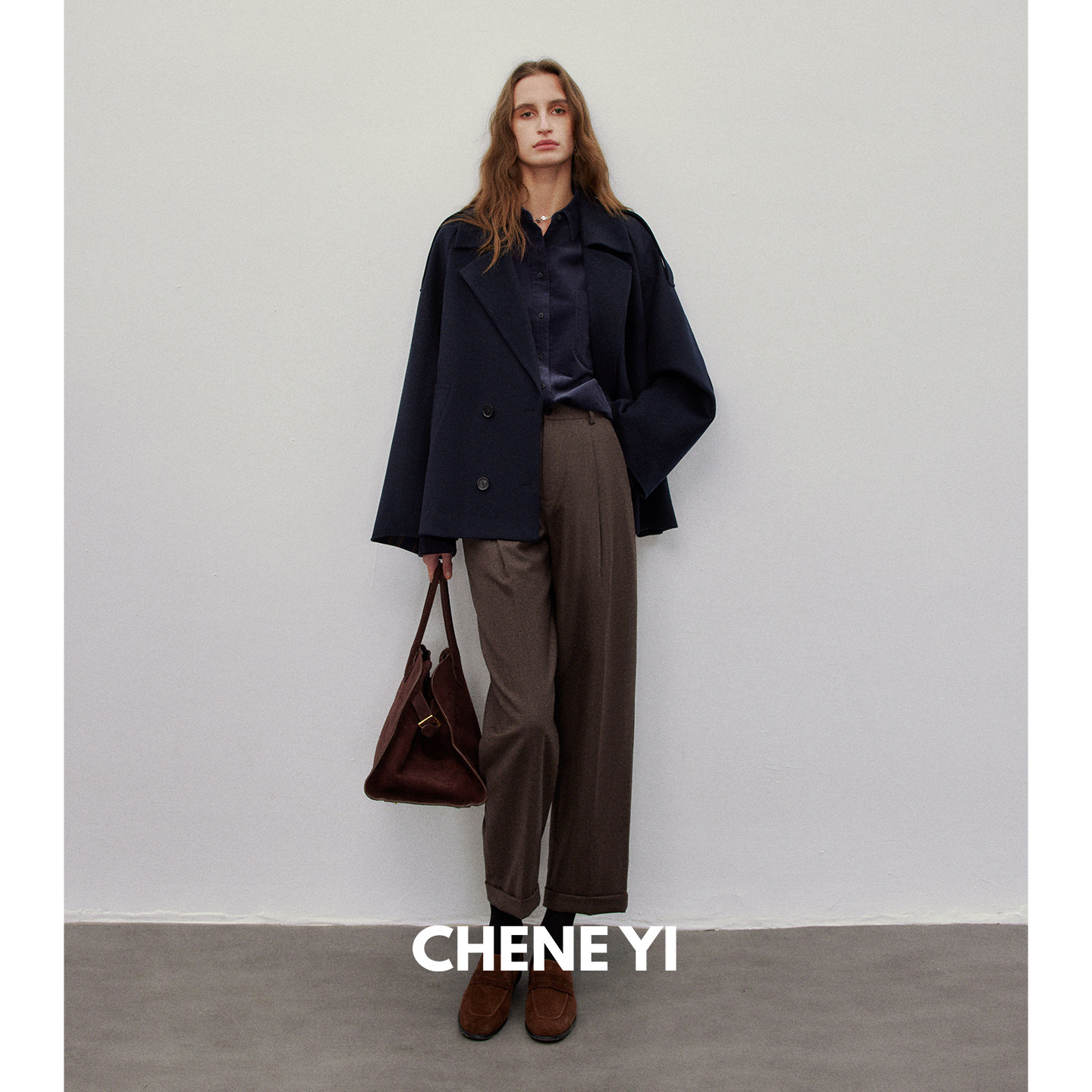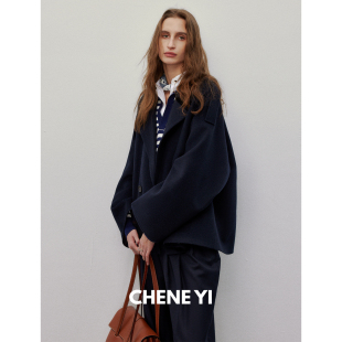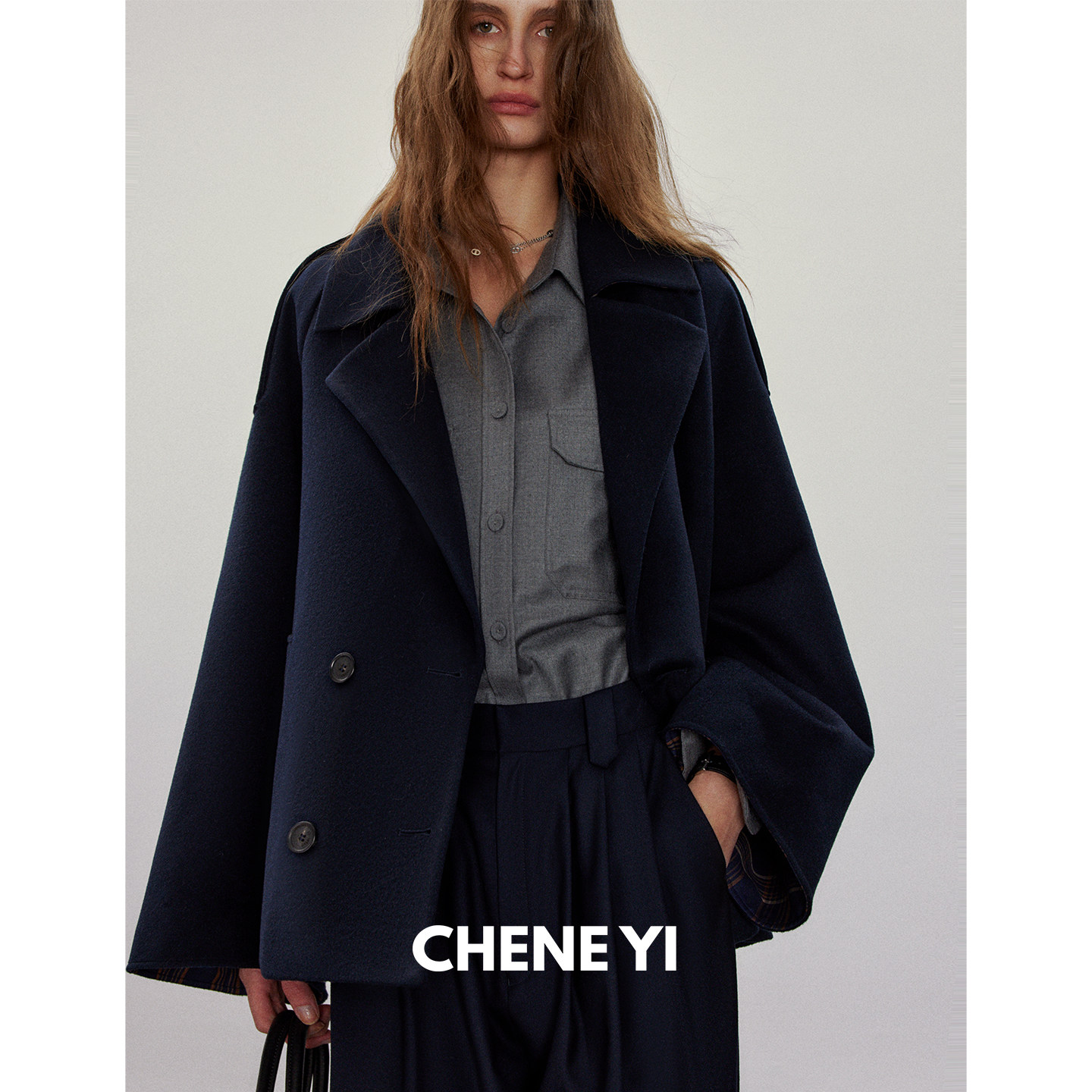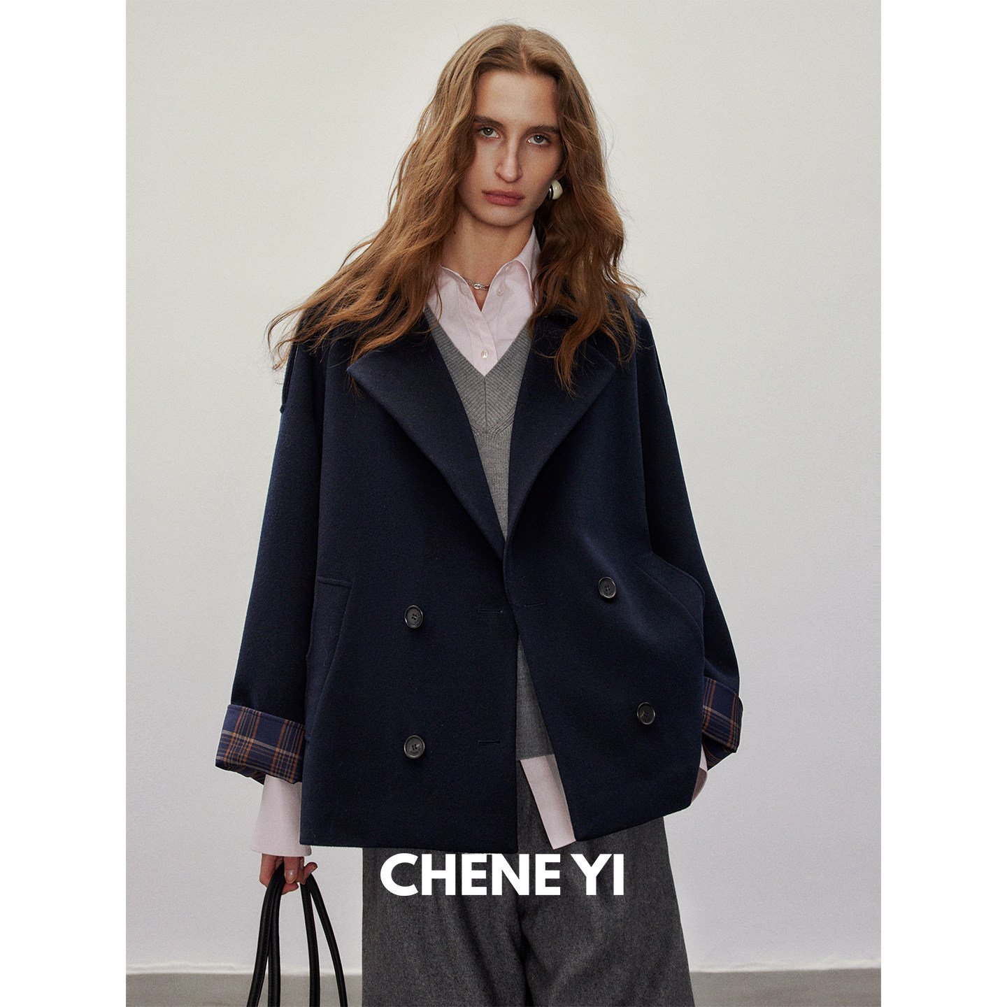 廓形肩章风衣大衣女士小个子羊毛毛呢外套 格纹拼接短款 CHENE