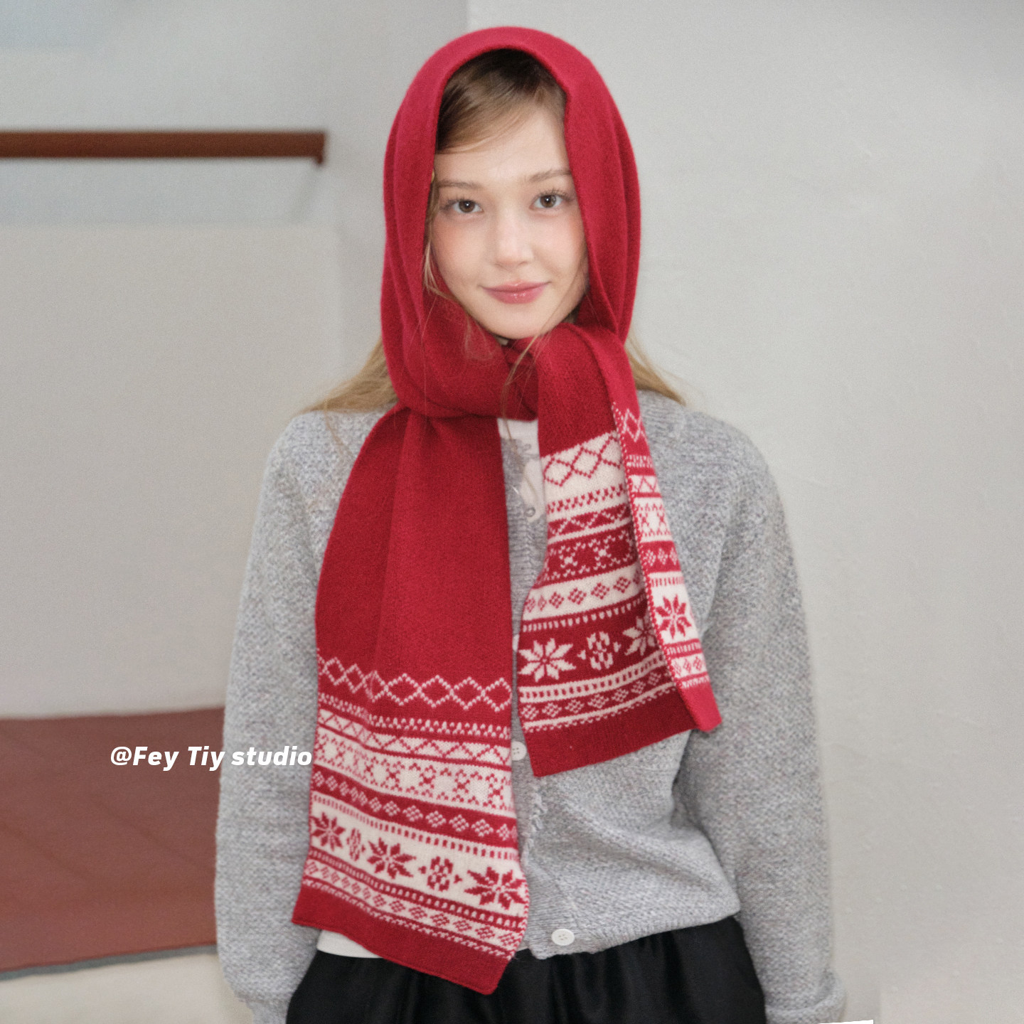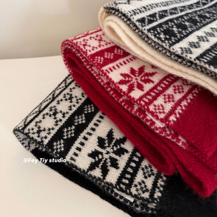 圣诞保暖围脖女 费尔岛雪花纯羊毛针织围巾女冬季 feytiy 100%羊毛