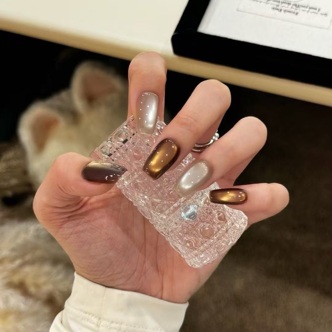 藏蓝波点纯手工穿戴酸奶白猫眼爆闪反向法式 美甲贴片 显嫩满钻短款