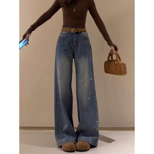 高腰垂感加绒直筒拖地裤 新款 女2025冬季 高级感重工烫钻阔腿牛仔裤