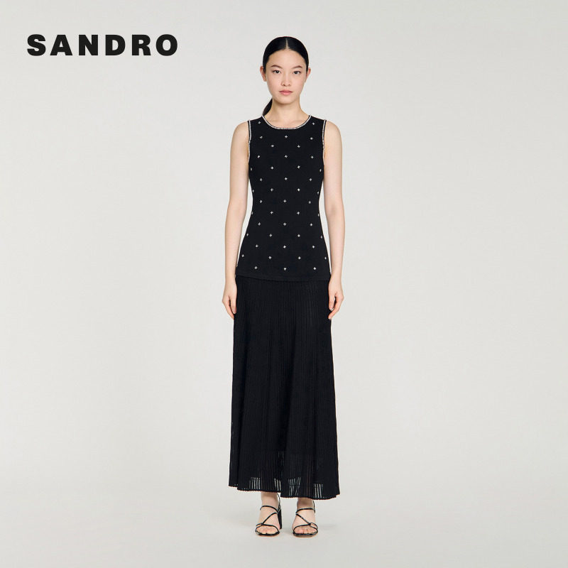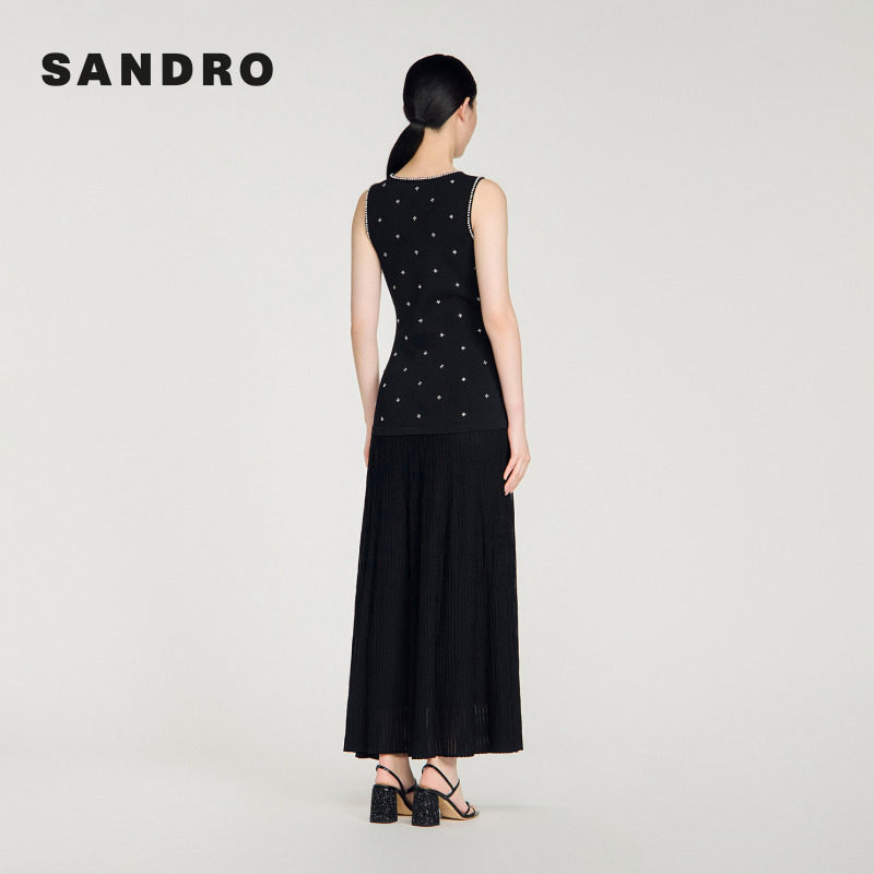 法式 女装 撞色仿钻装 饰长款 连衣裙 SANDRO2026春季 拼接裙摆无袖 新款