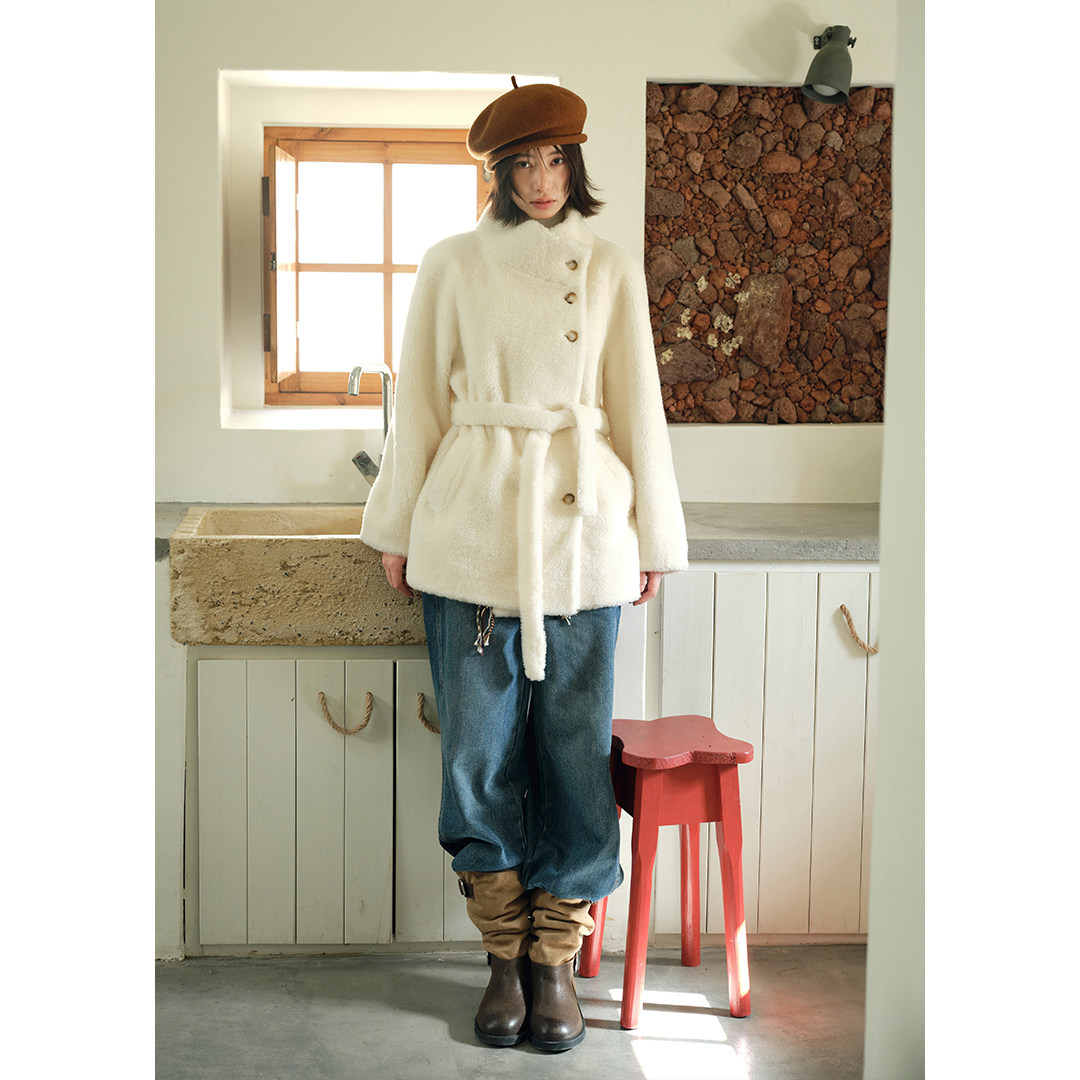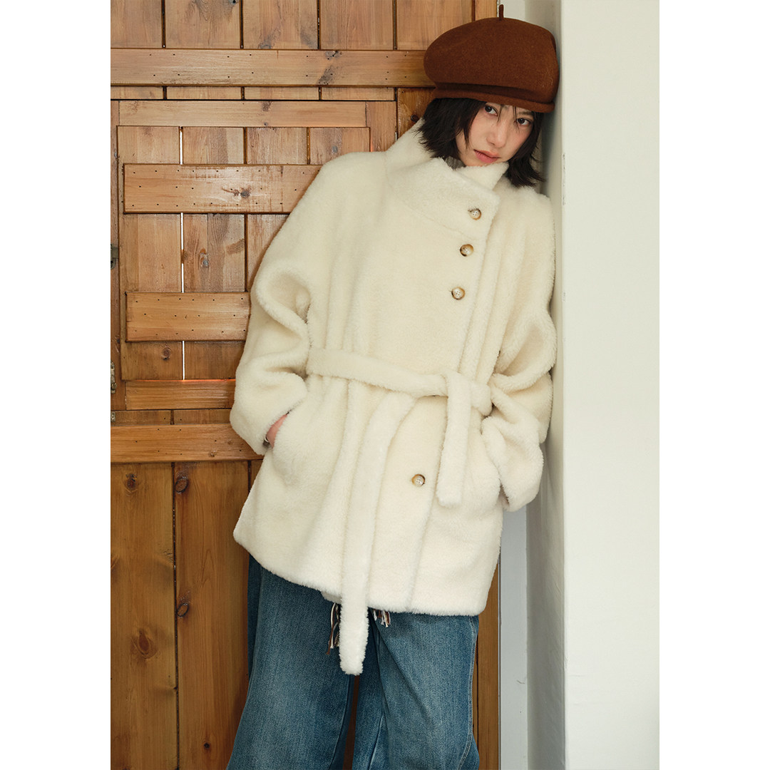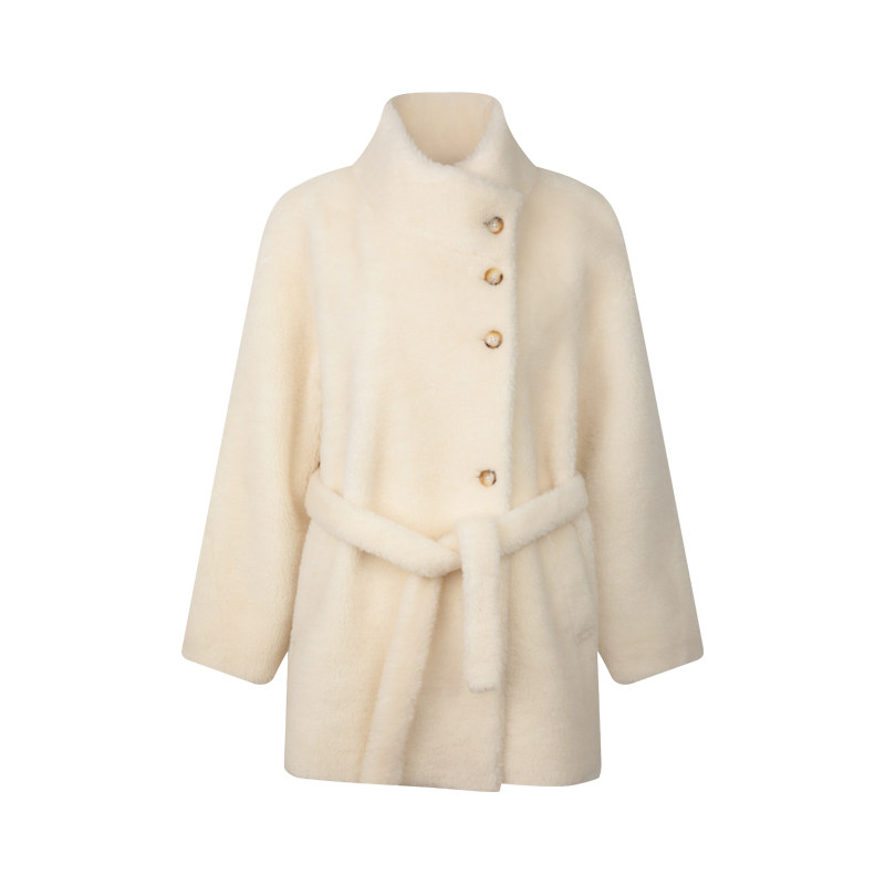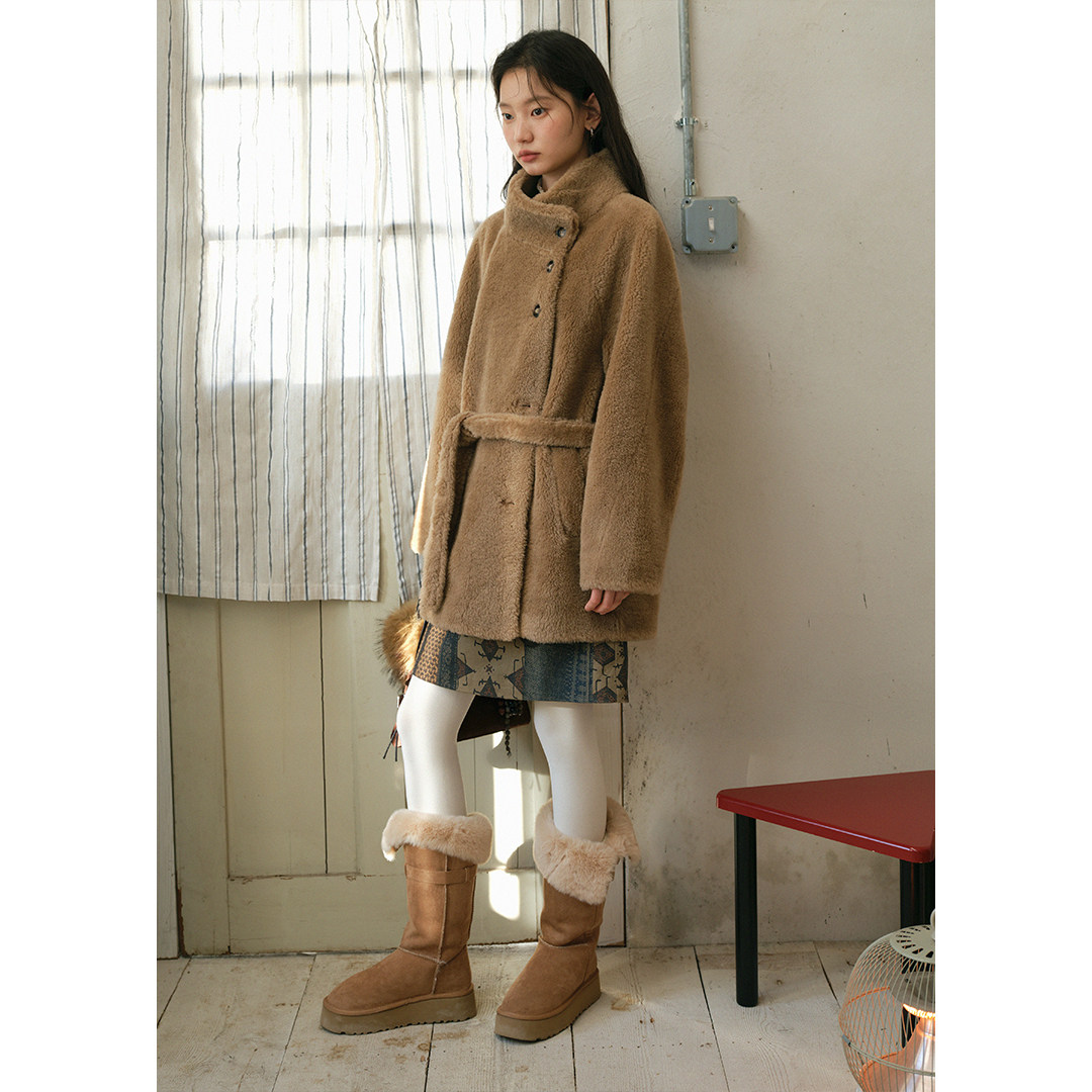 BLUEerror 羊羔毛加厚立领毛绒皮草女全羊毛腰带皮毛一体外套冬季