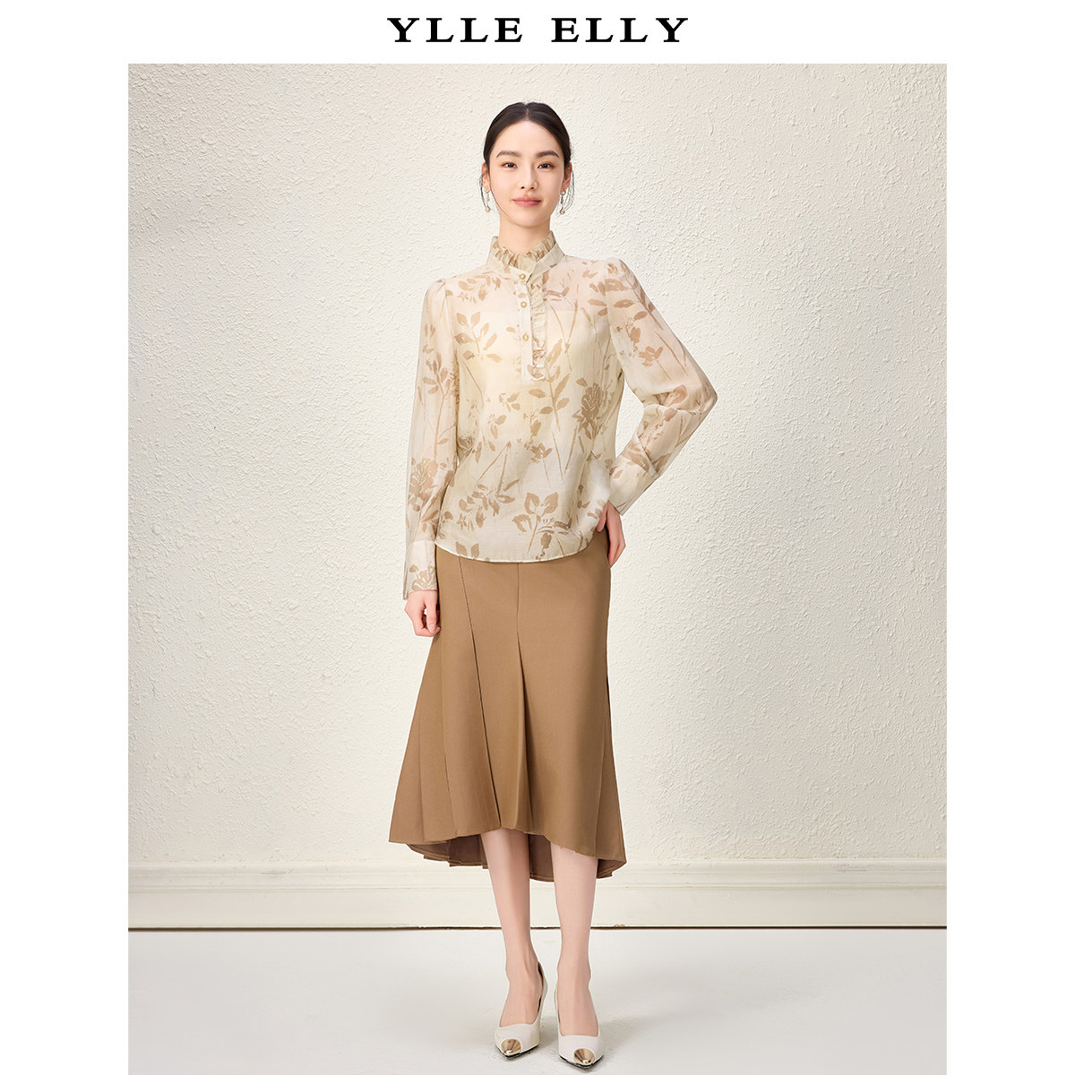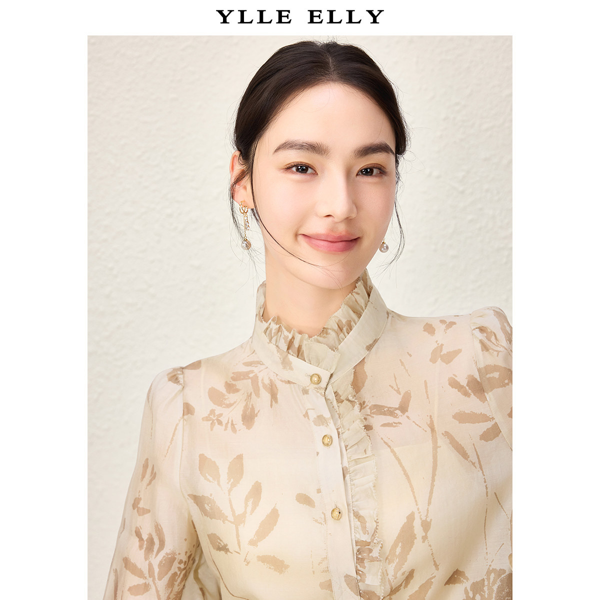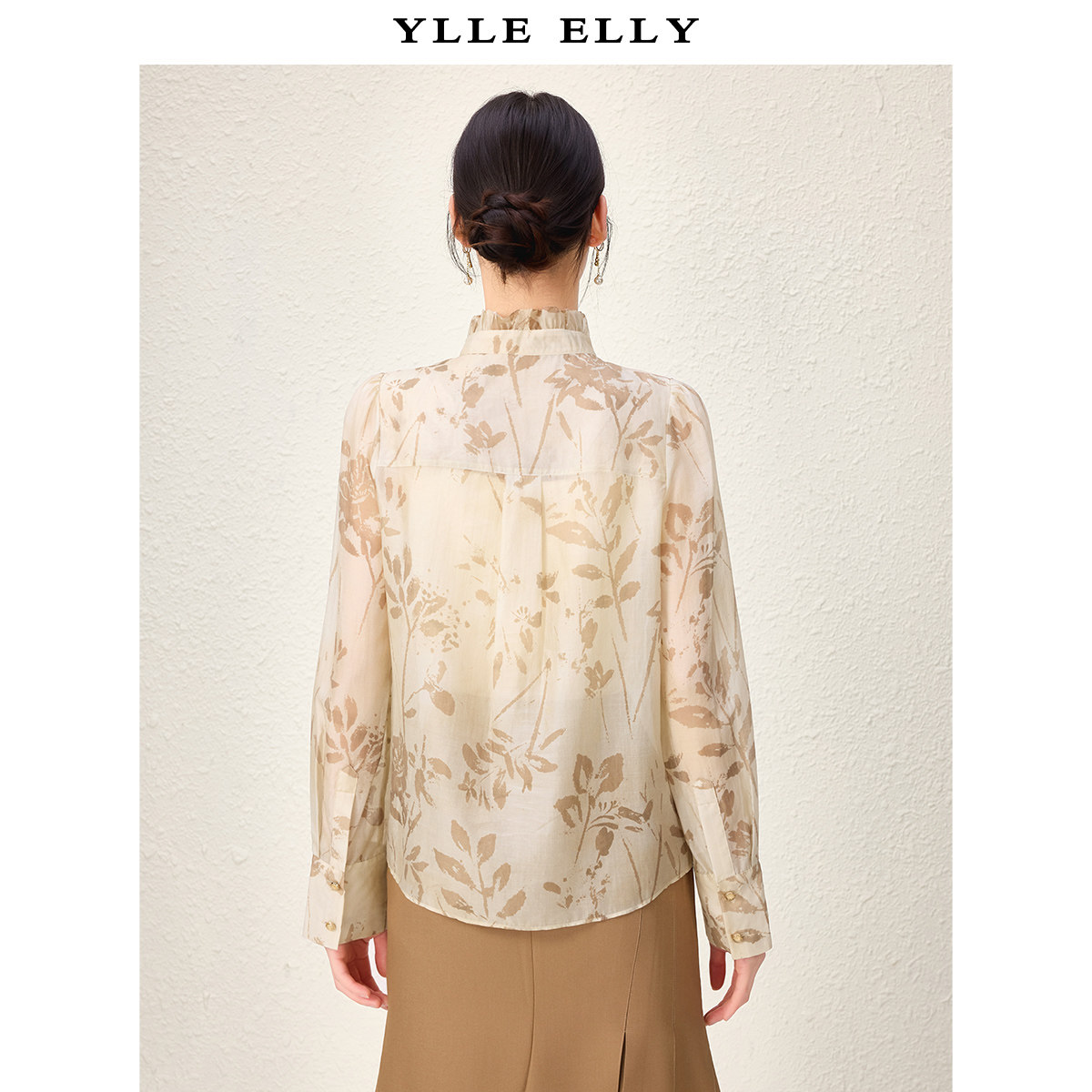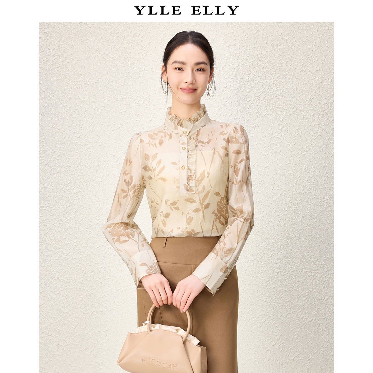 ELLY 新款 衣衫 春季 莱赛尔天丝立领上衣 妙影植物印花小衫 YLLE