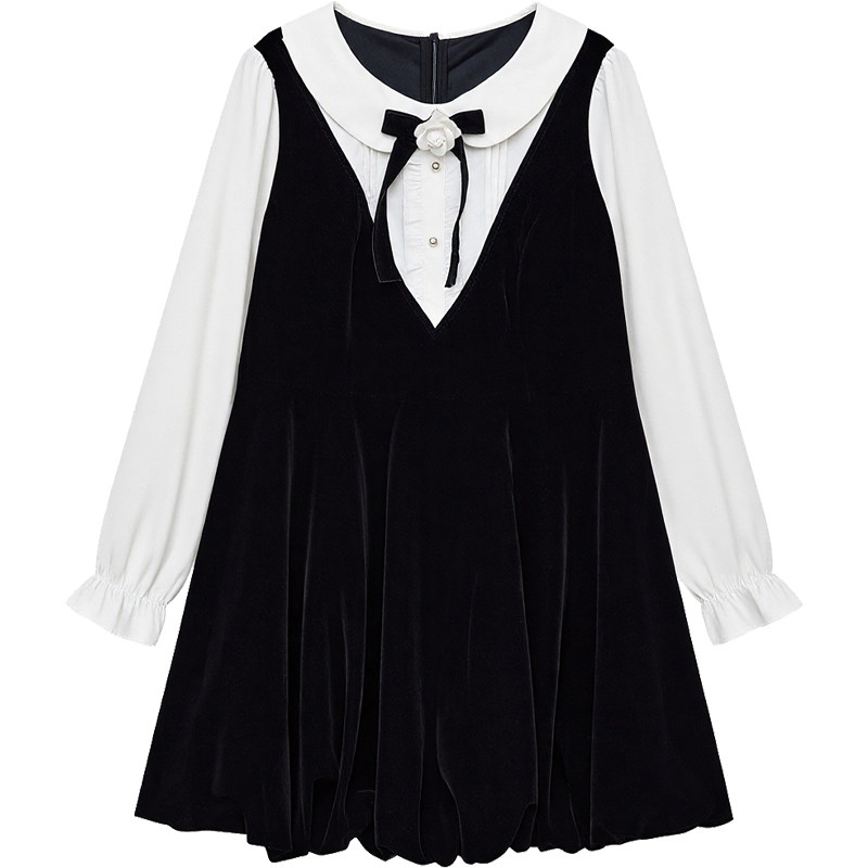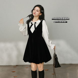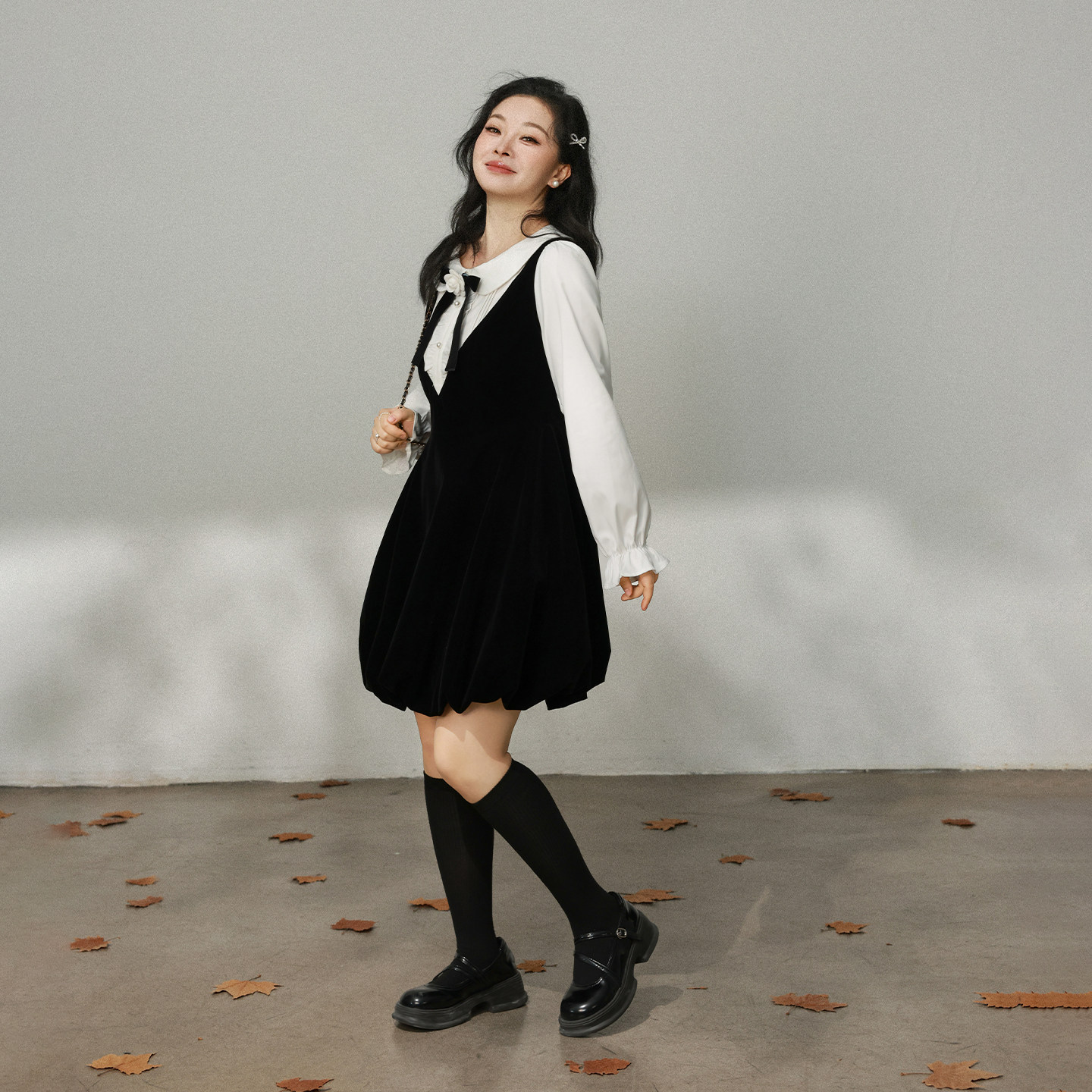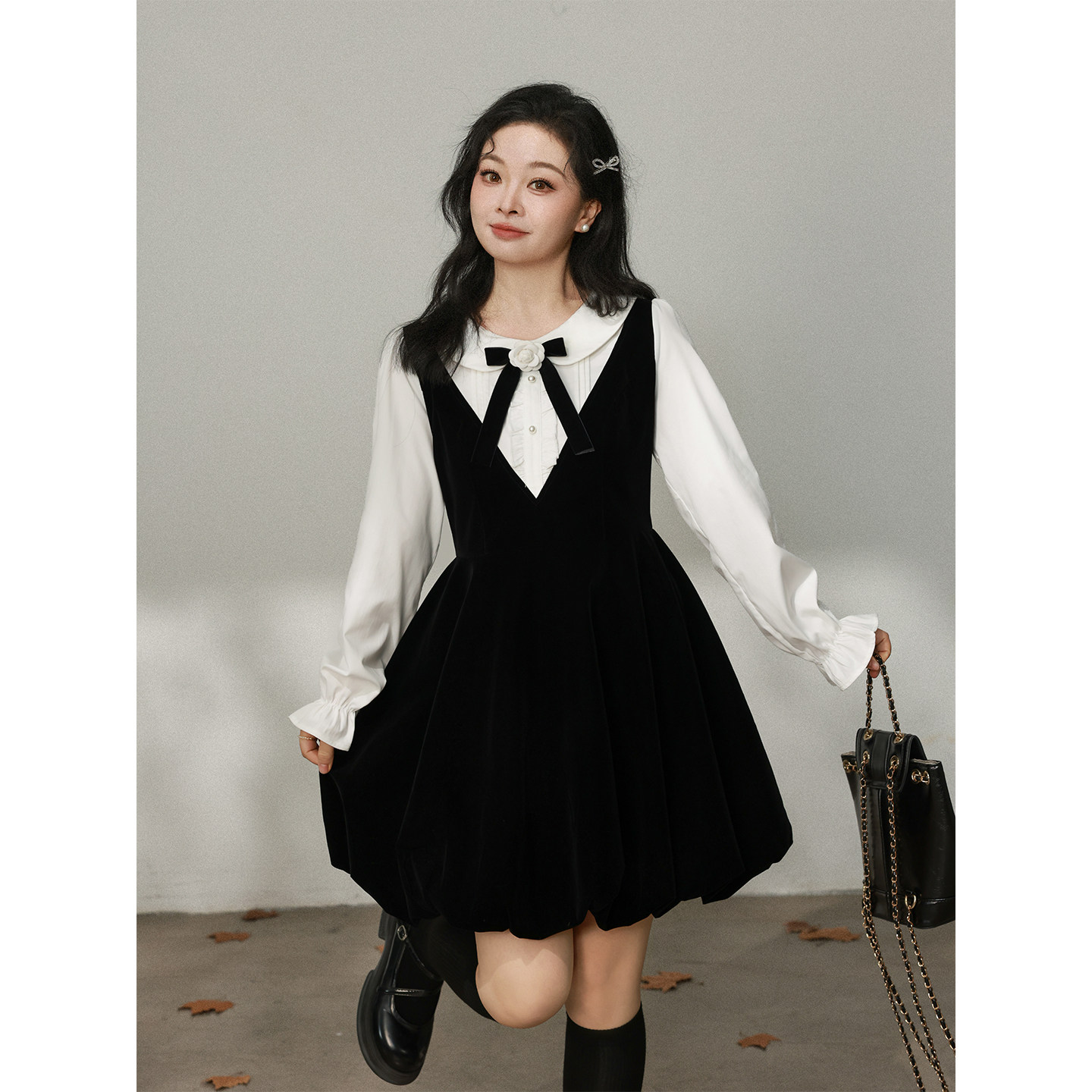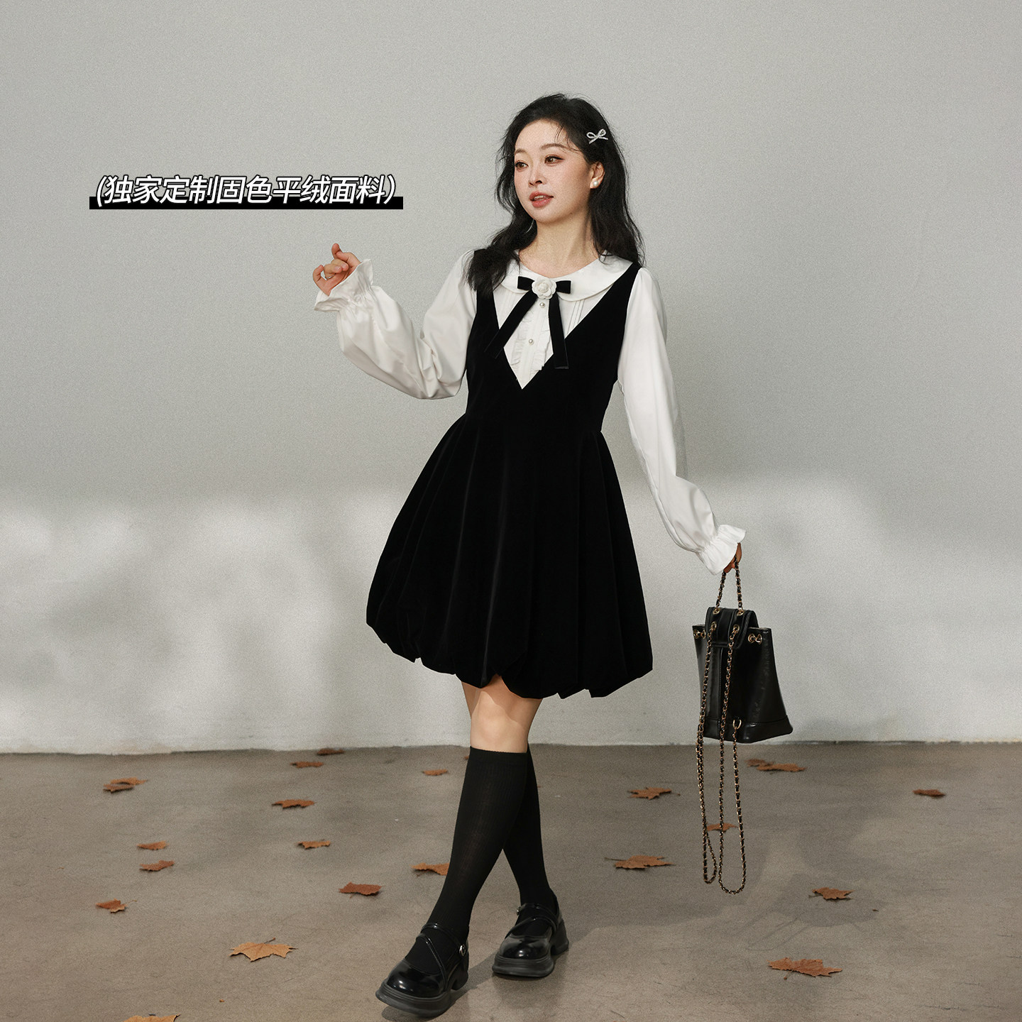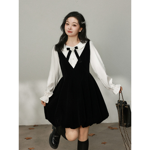 背带裙 灯笼袖 安妮不火 假两件毛绒针织拼接呢料连衣裙女微胖大码