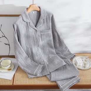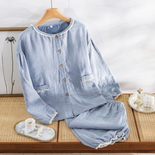 家居服纯棉睡衣 A类全棉色织提花四层纱女式 四层纱花边加厚