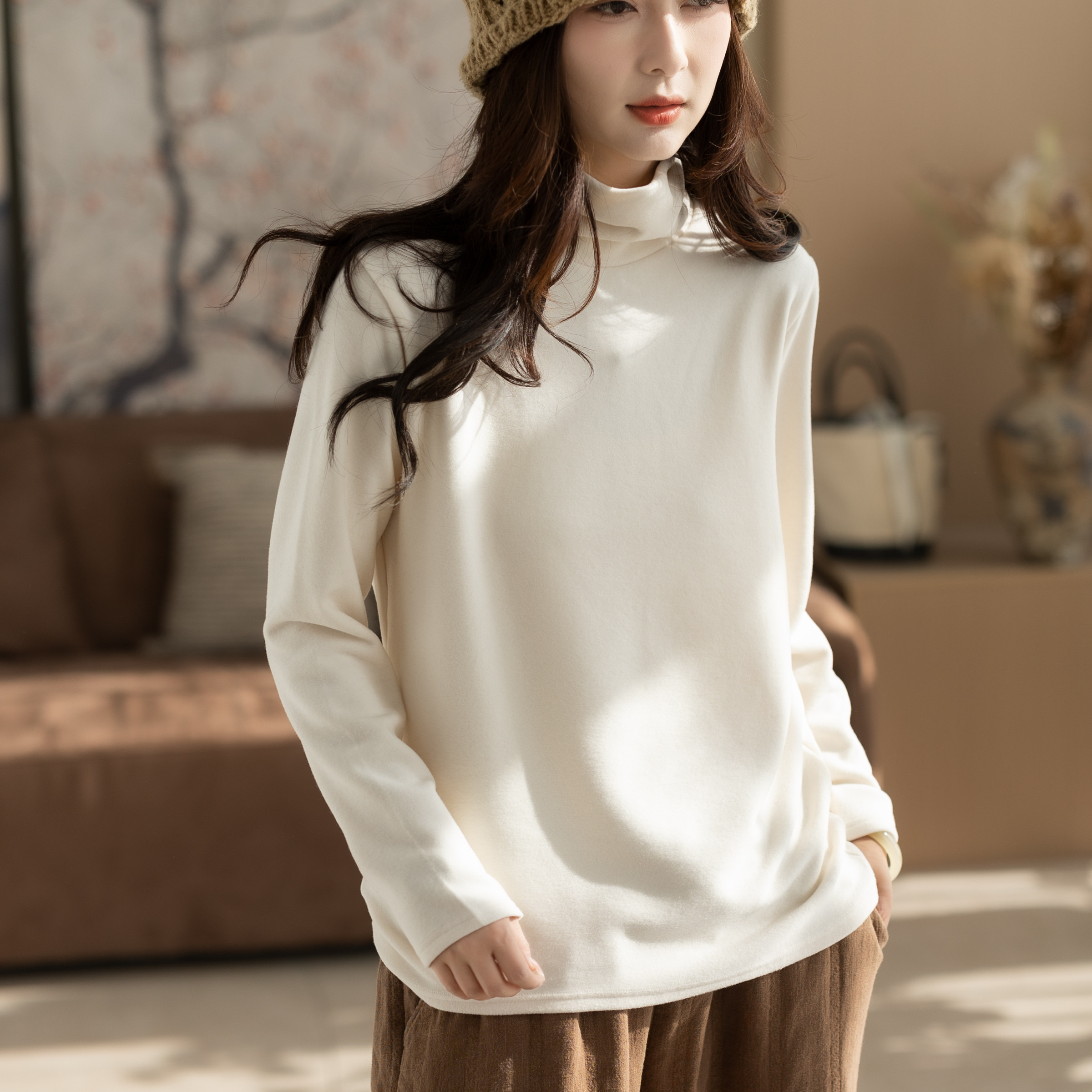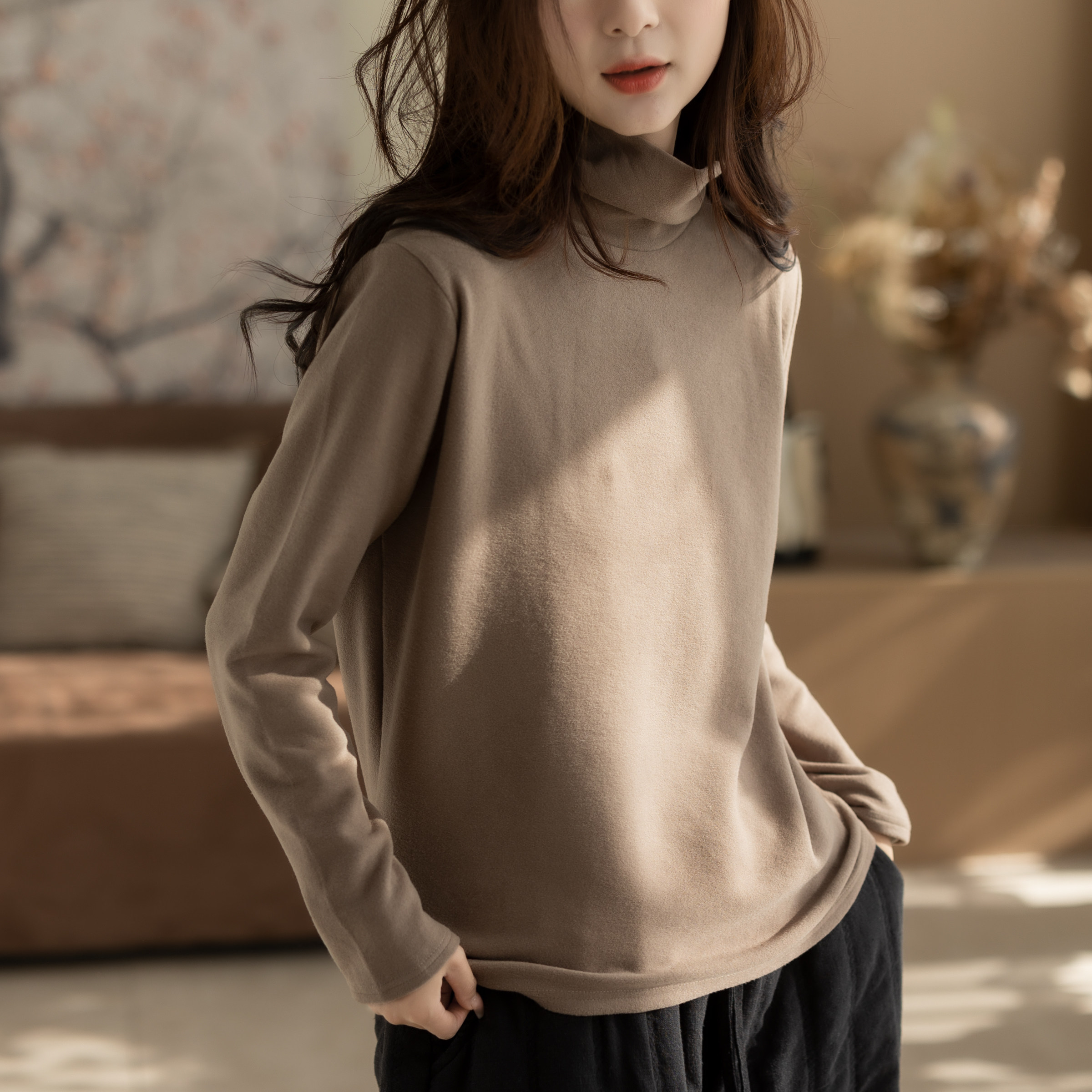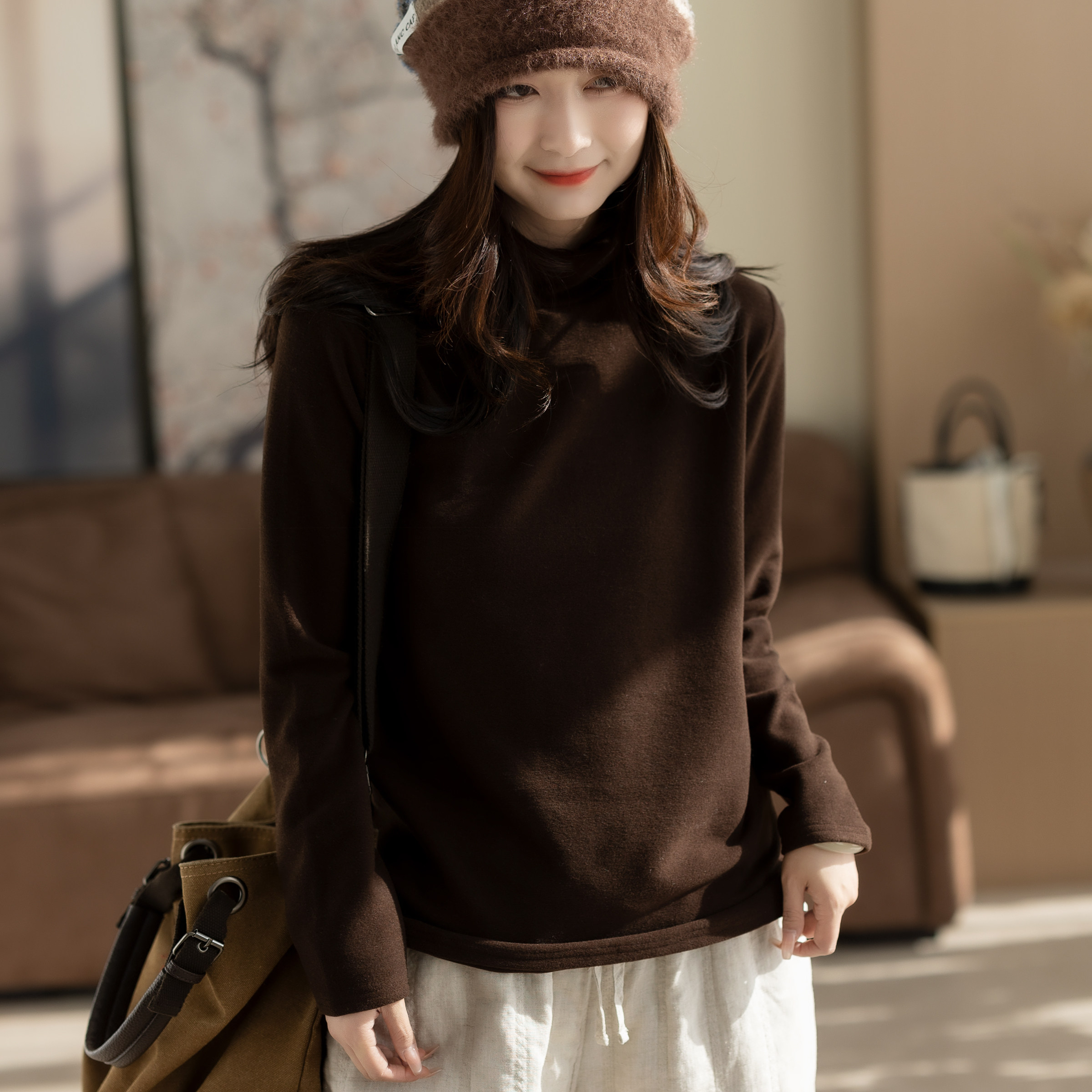 好看女士休闲文艺显瘦女装 高领时尚 上衣潮 女秋冬新款 咖咪羽打底衫
