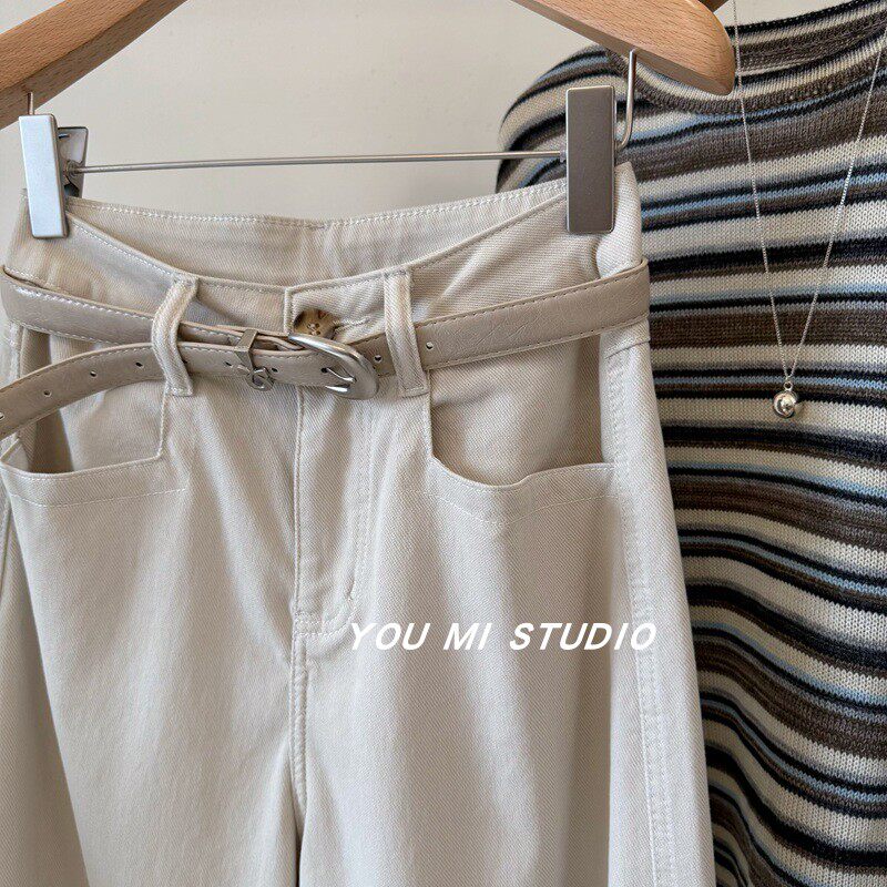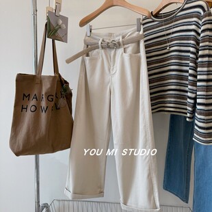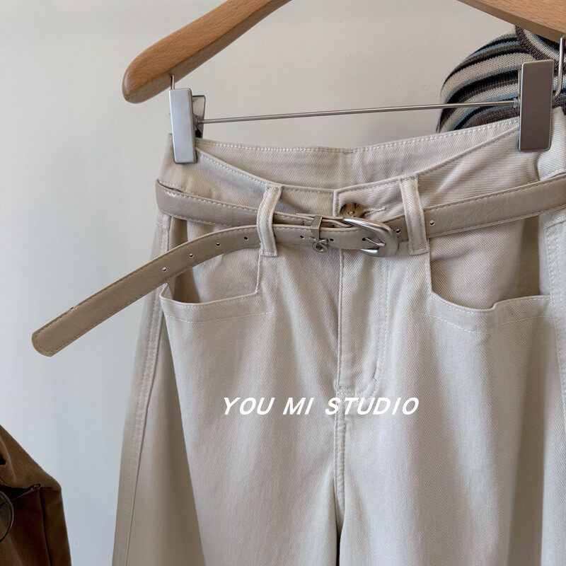 显瘦显腿直阔腿休闲裤 自卷边宽松直筒九分裤 配腰带 梨形闭眼入