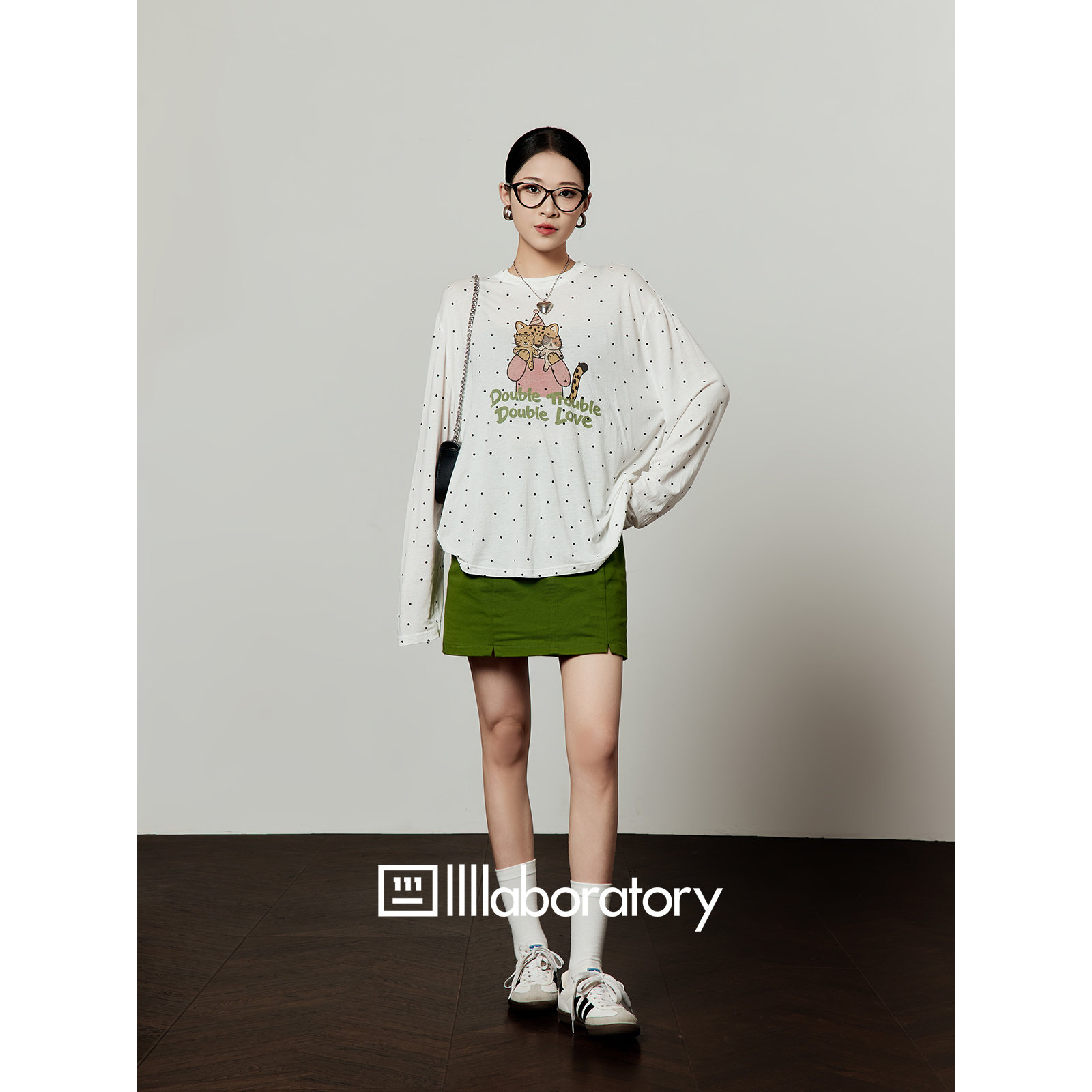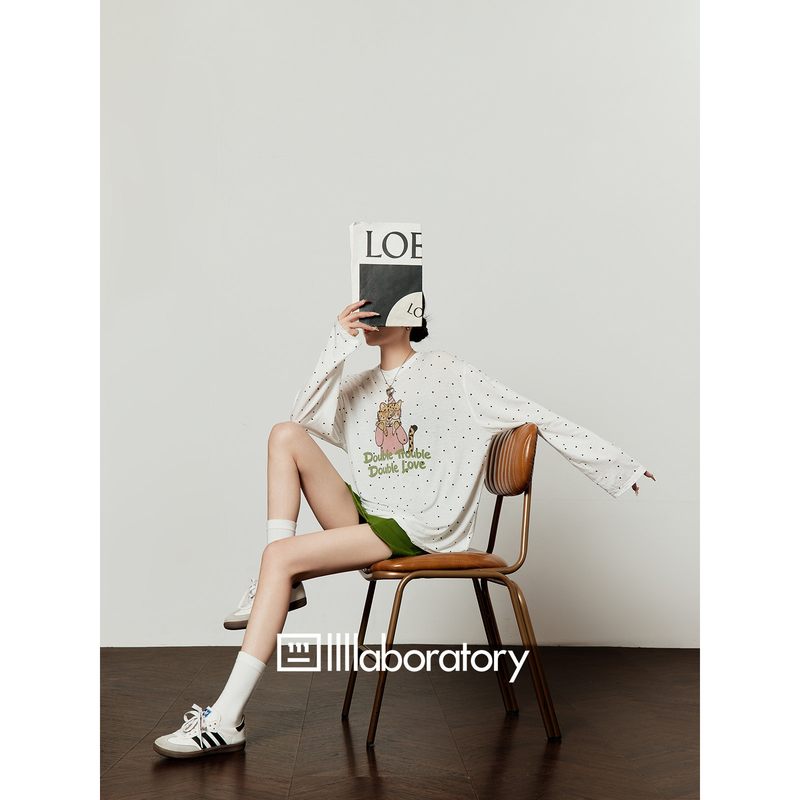 周里物出品「玩偶挡脸豹」白色波点T恤女2026春夏新款 设计感上衣