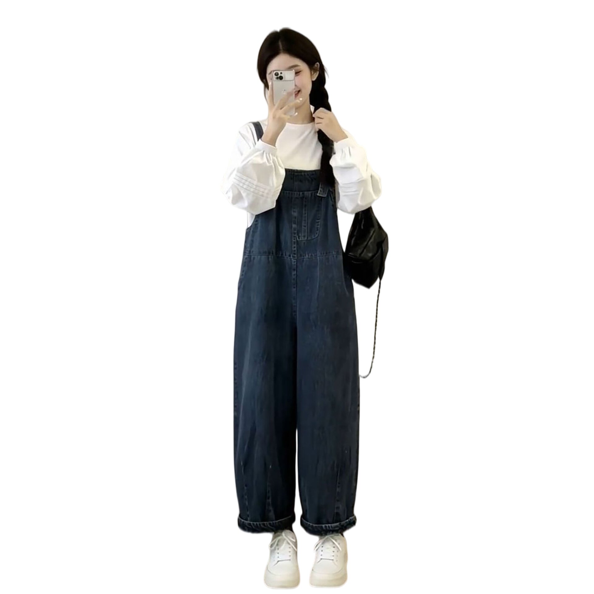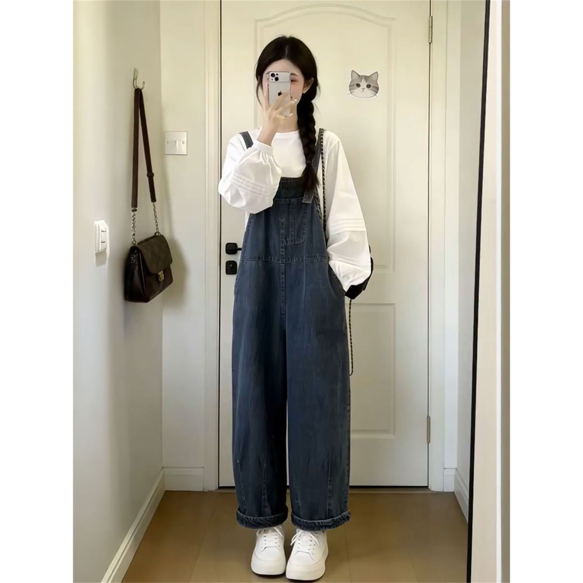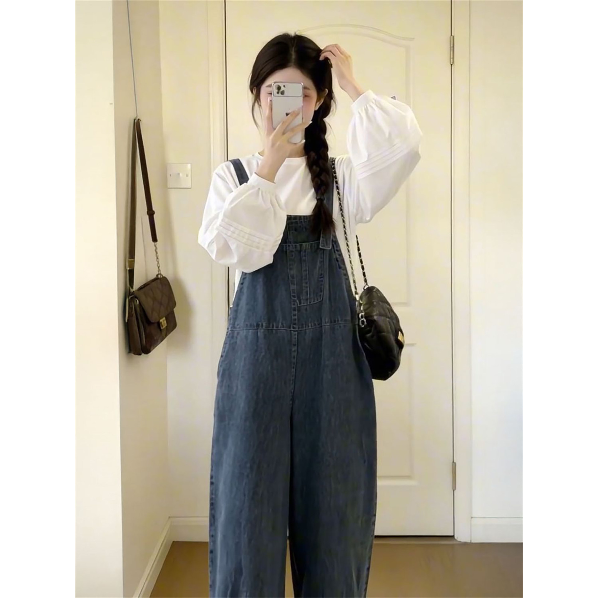 衬衫 2026春季 女搭配圆领长袖 清纯少女风复古背带牛仔裤 两件套 新款