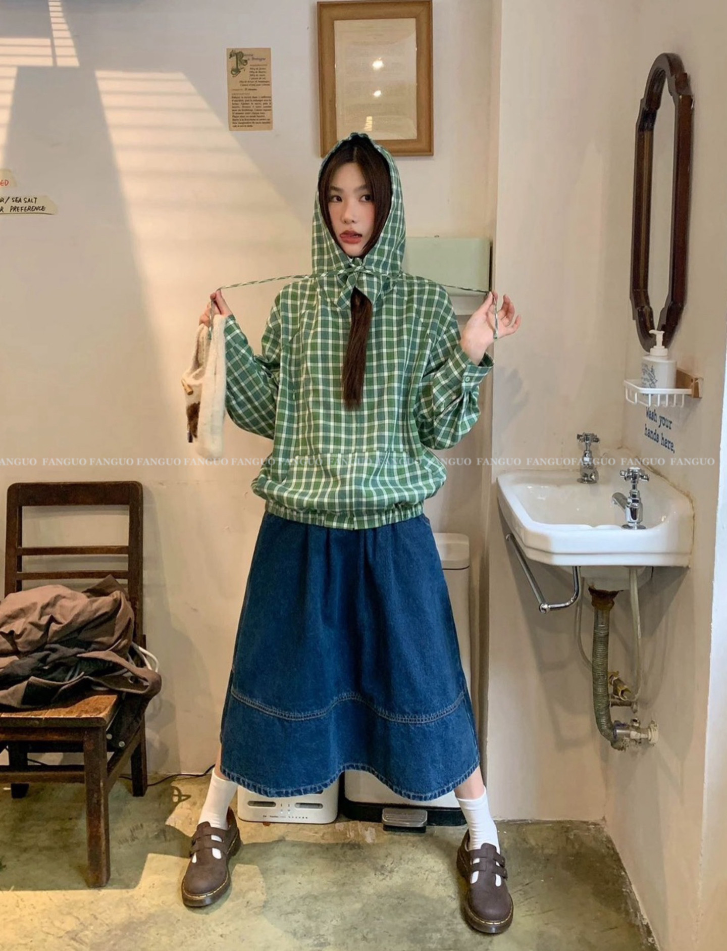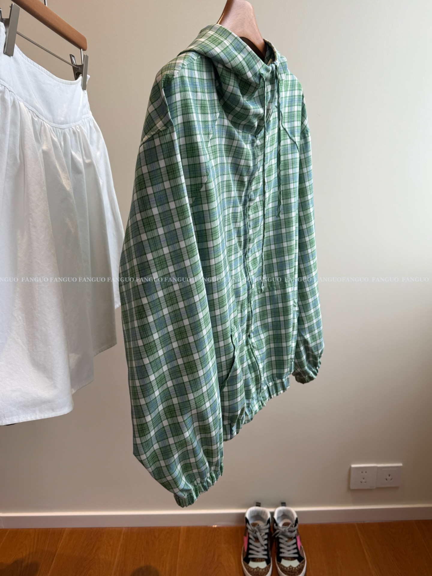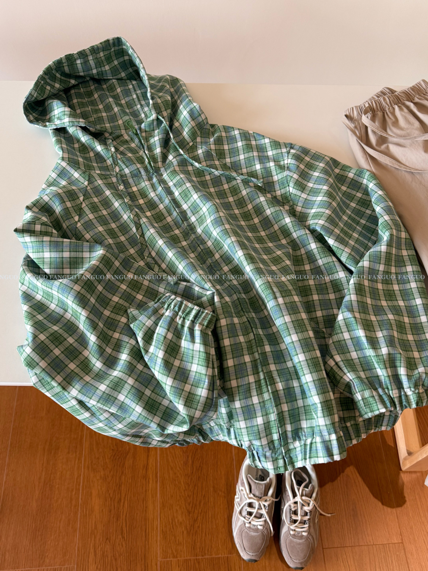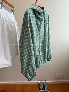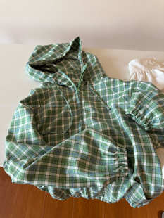 包邮 韩国our 复古绿色格子休闲连帽抽绳外套女 太合春意了