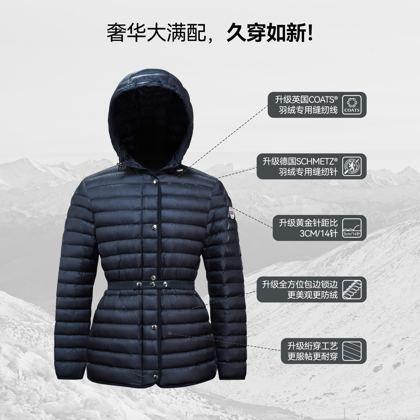 蒙口羽皇加拿大进口98鹅绒女收腰轻量细格纹面料YKK拉链外套9101