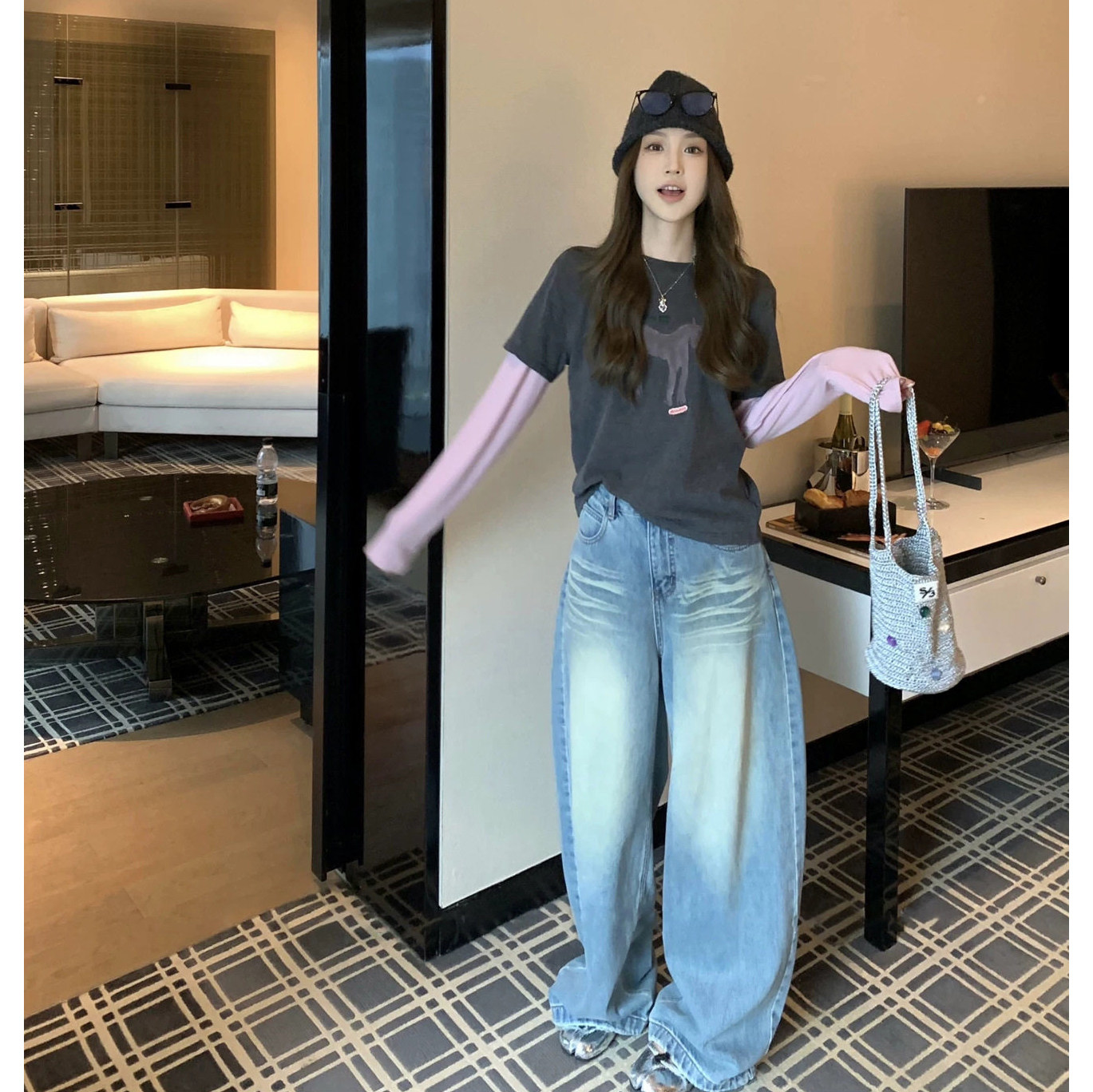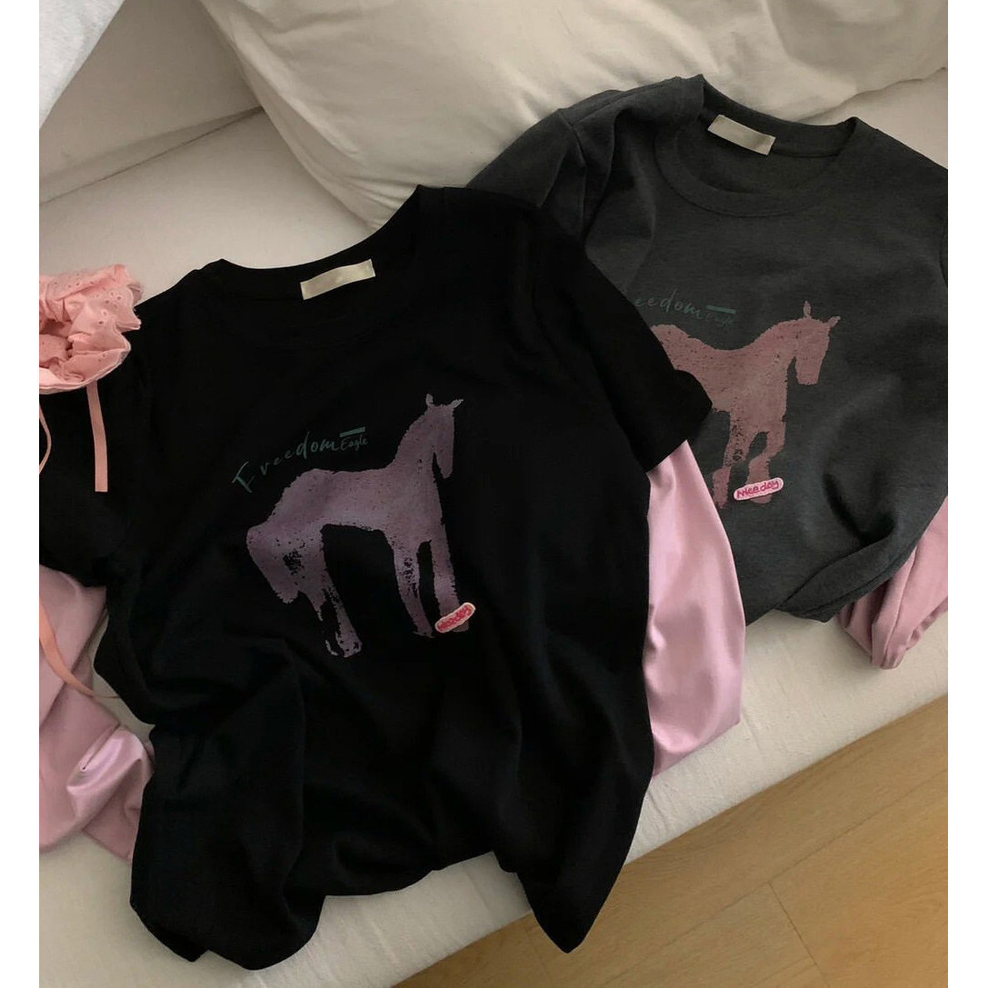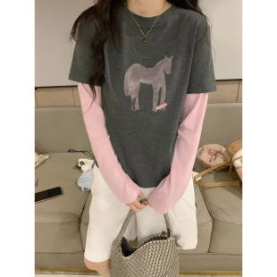 上衣女 可爱童趣小马印花圆领T恤拼接假两件长袖 现货 韩国春新款