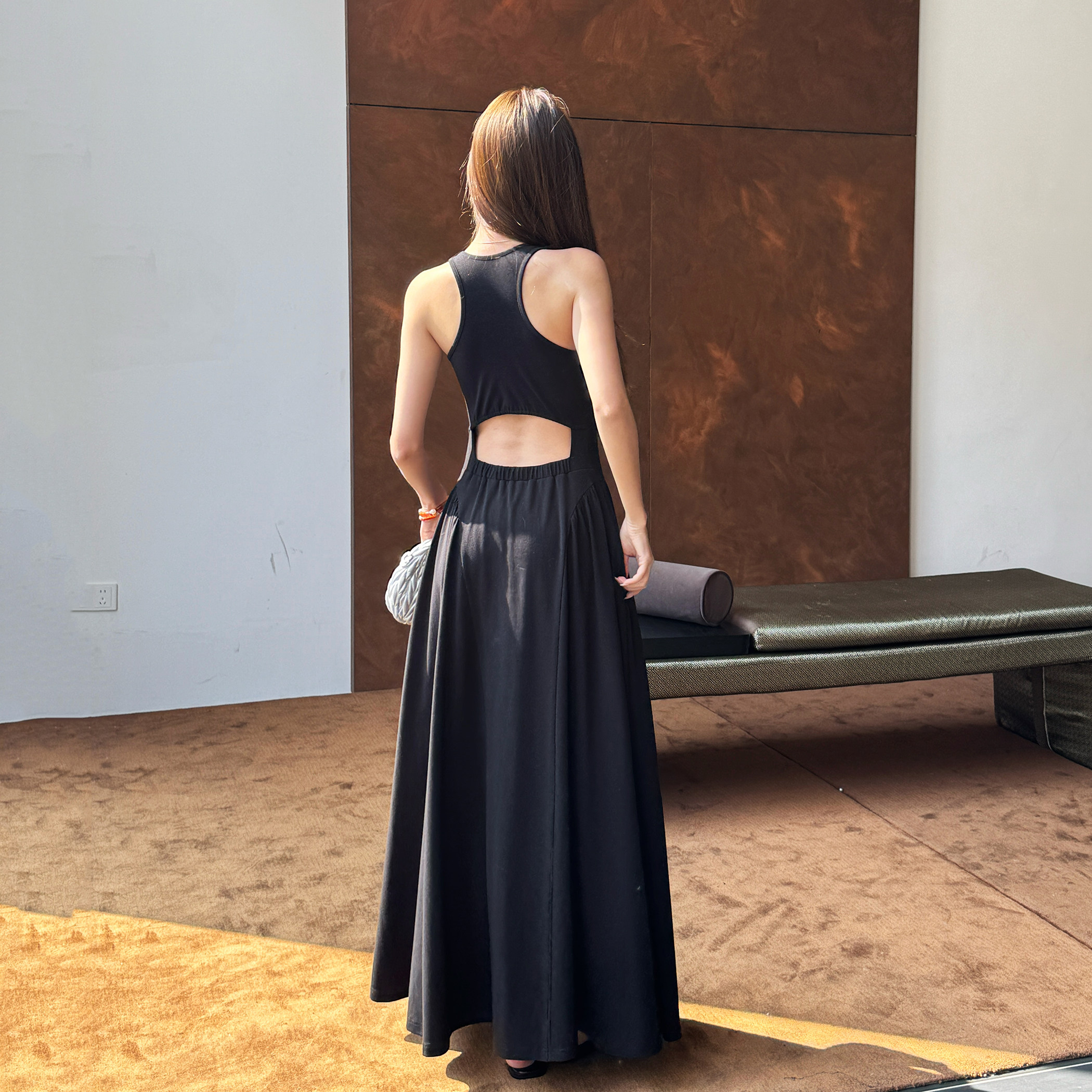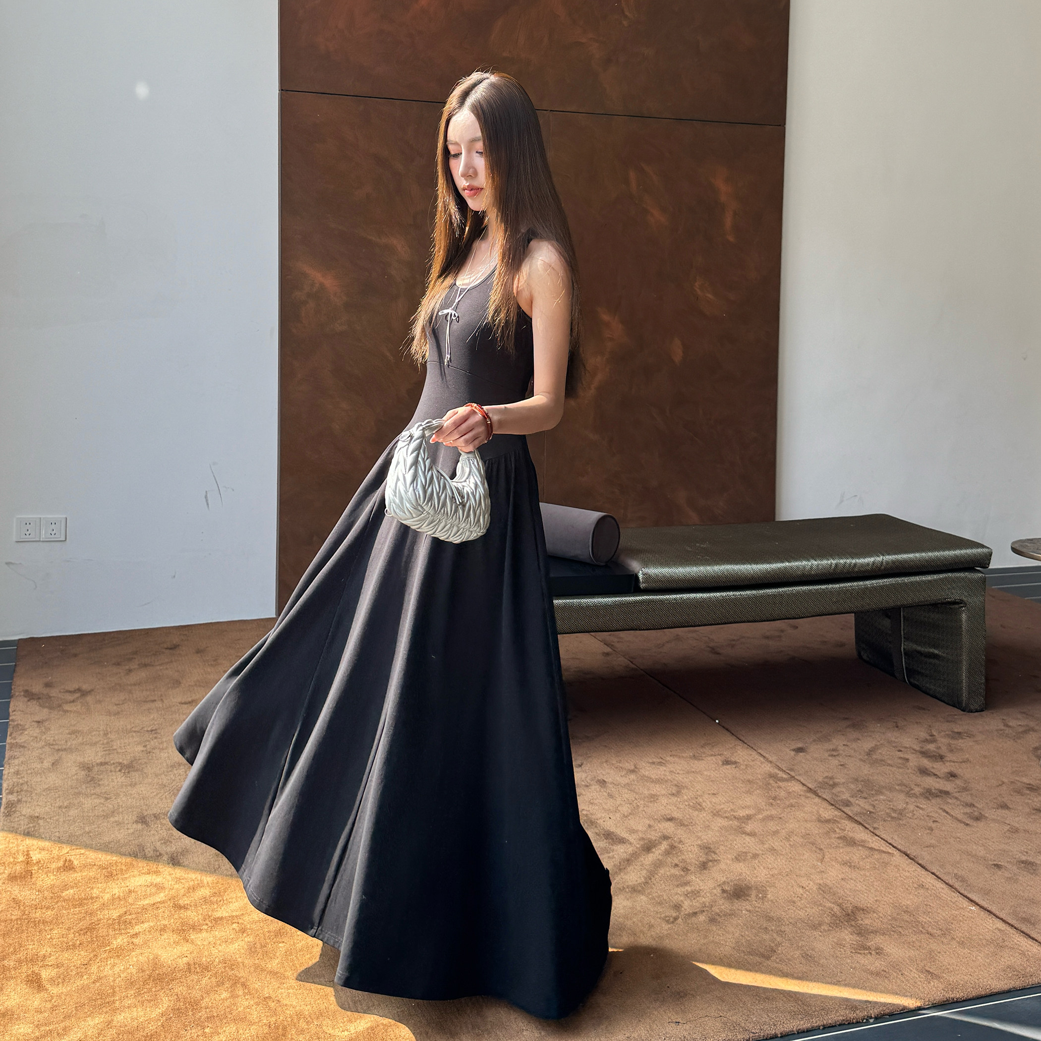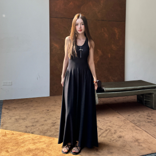 浅布调春夏赫本黑色大摆长裙吊带连衣裙女修身 显瘦百搭露腰背心裙
