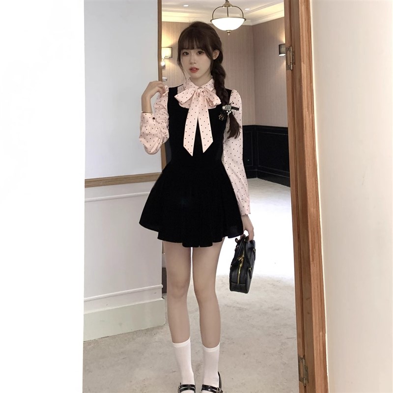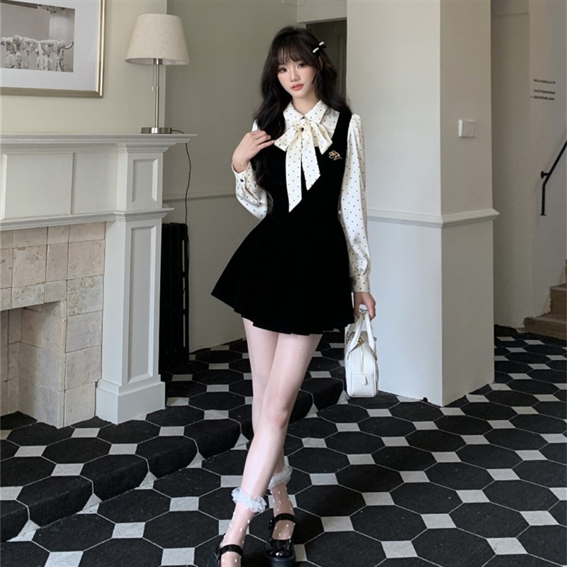 连衣裙富家千金高级感秋季 法式 波点假两件裙子 丝绒黑巧 越韩小鱼