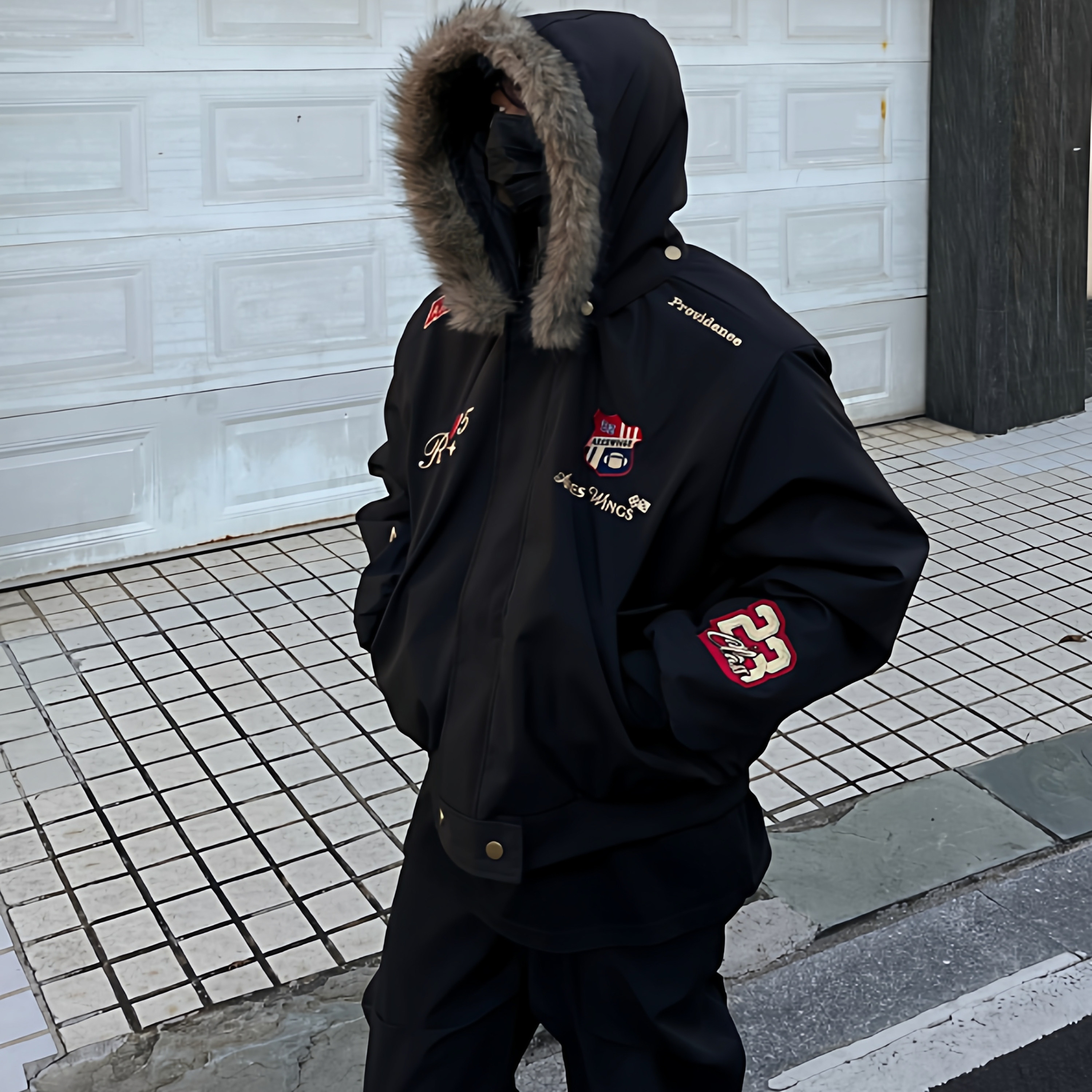 美式 外套潮 hiphop飞行夹克座山雕刺绣棒球服加厚拆卸连帽情侣冬季