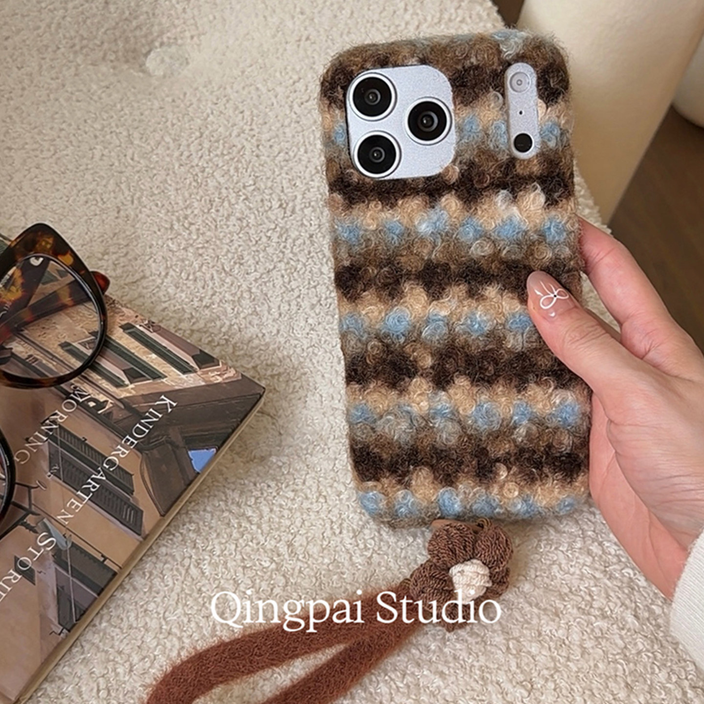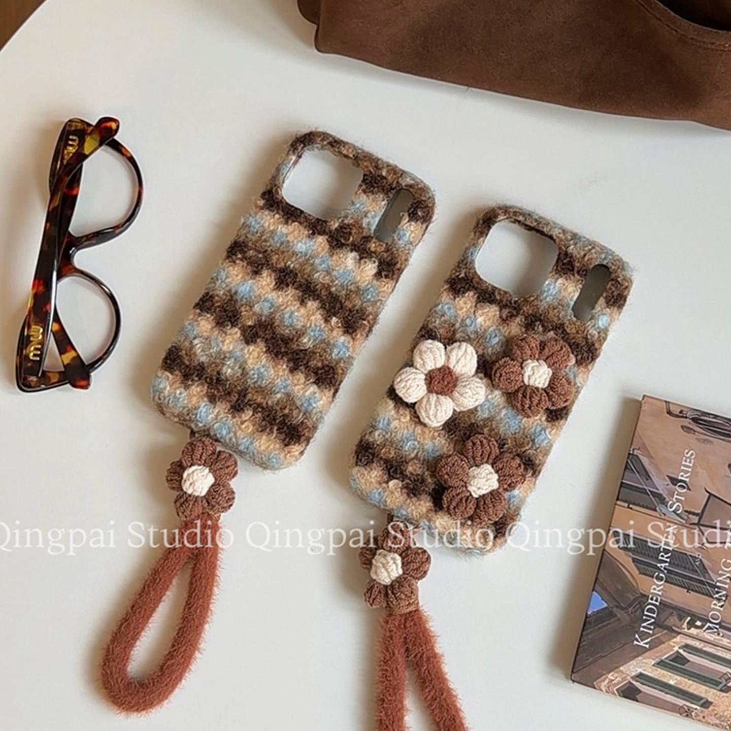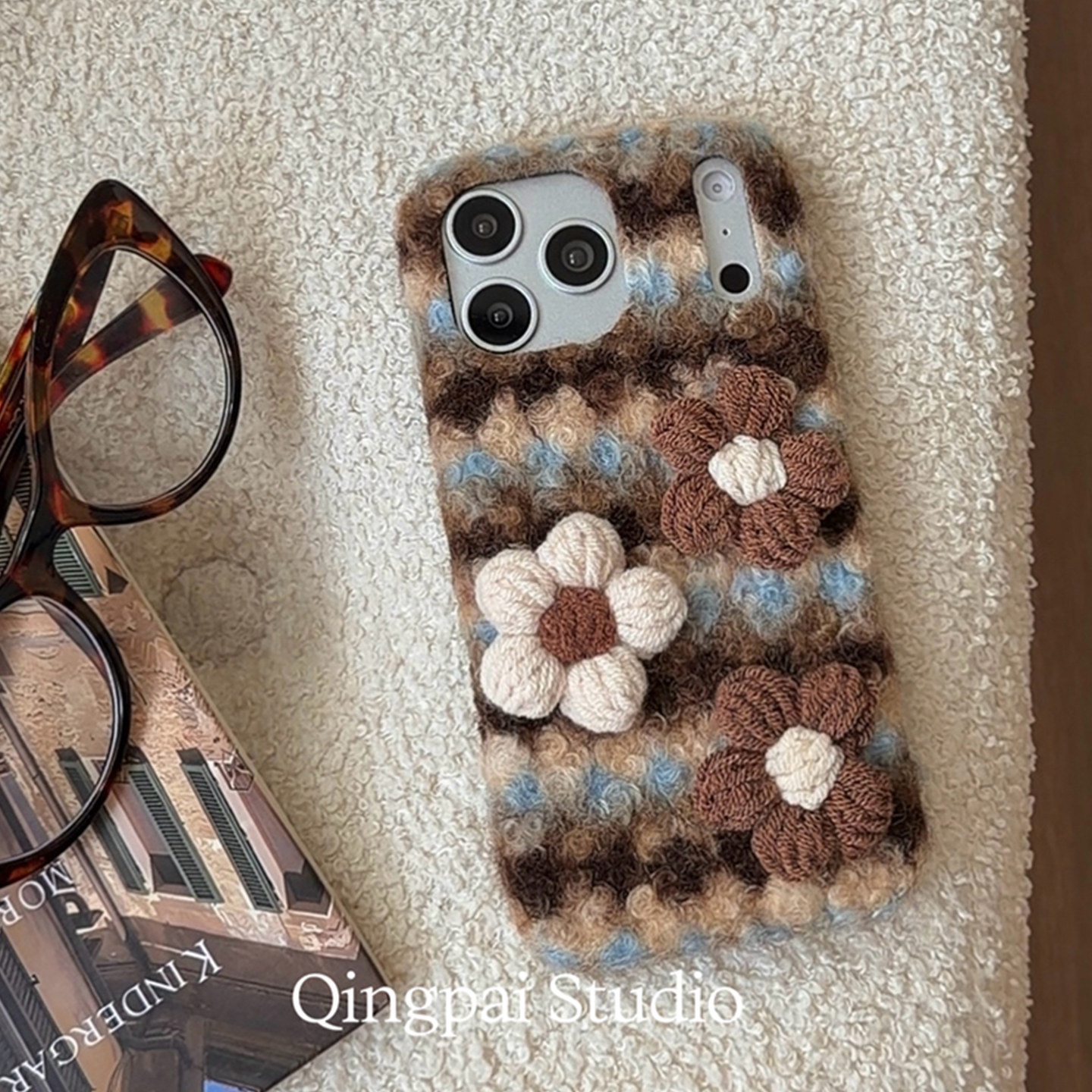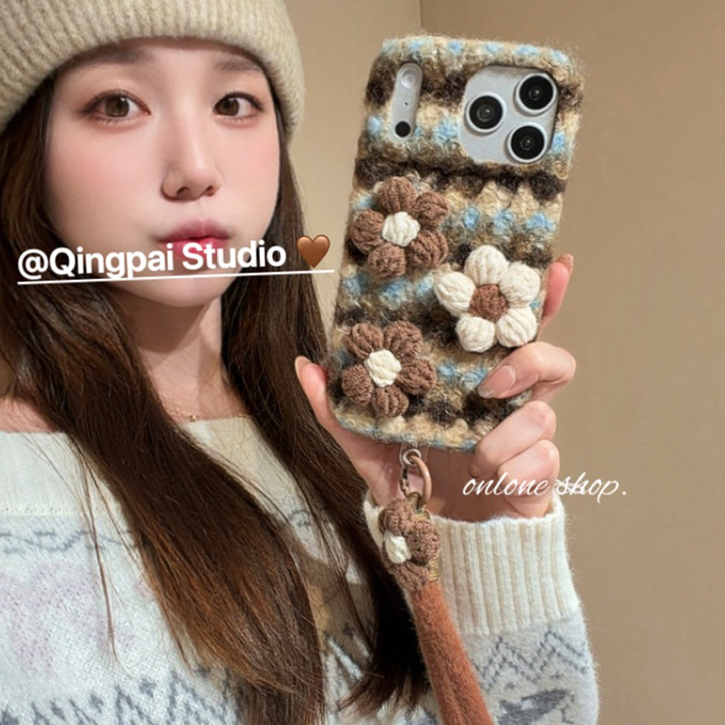 轻派秋冬棕色毛绒立体花朵带挂绳适用苹果17promax手机壳iphone16pro新款 14复古美拉德13小众全包软壳 15女款