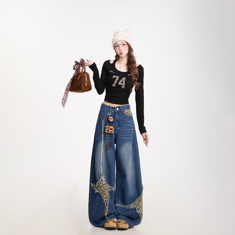 子小众水洗阔腿裤 潮牌设计感裤 女美式 NERESUM豹纹拼接弯刀牛仔裤