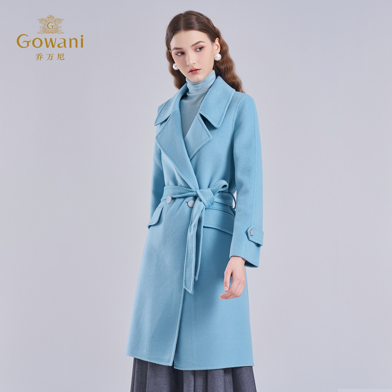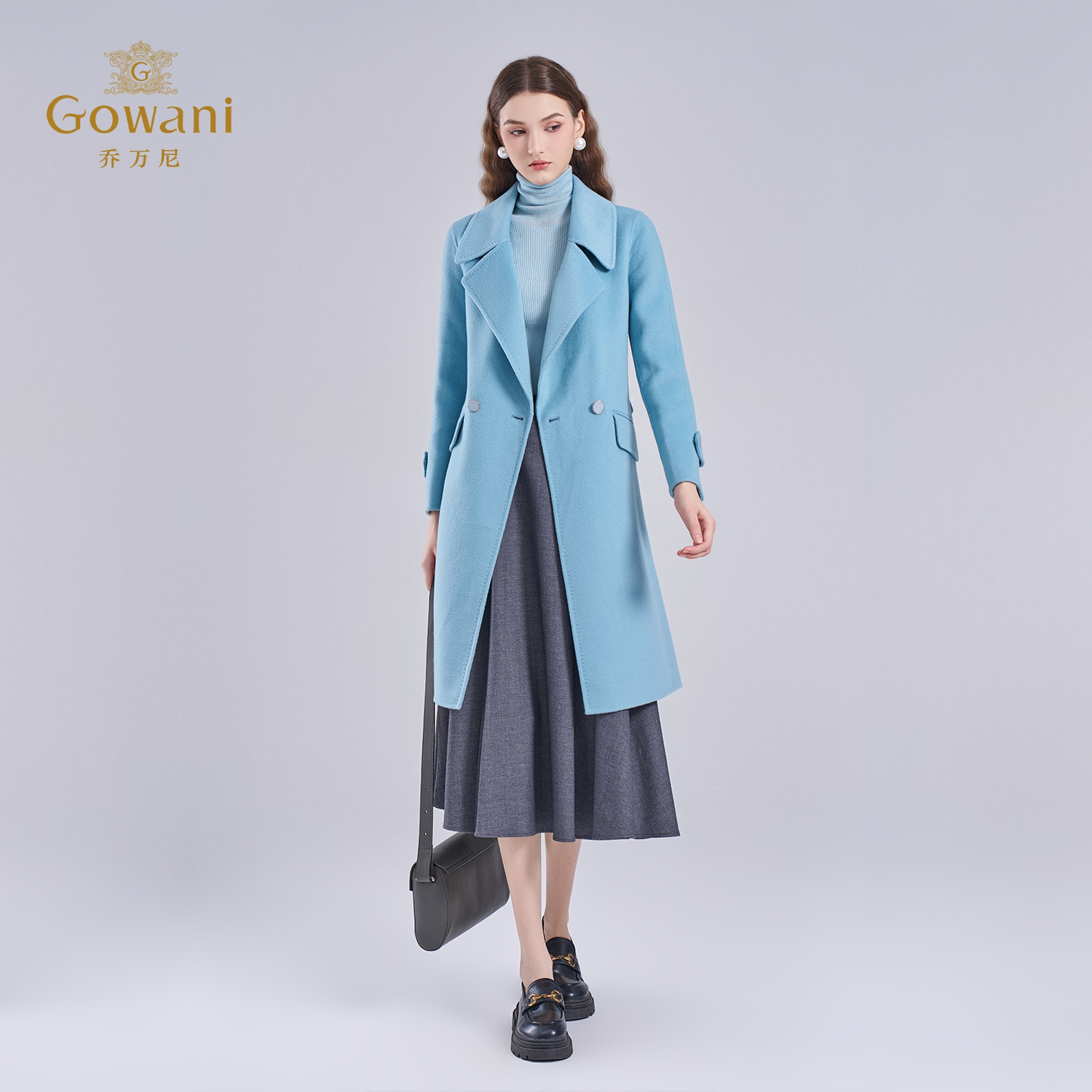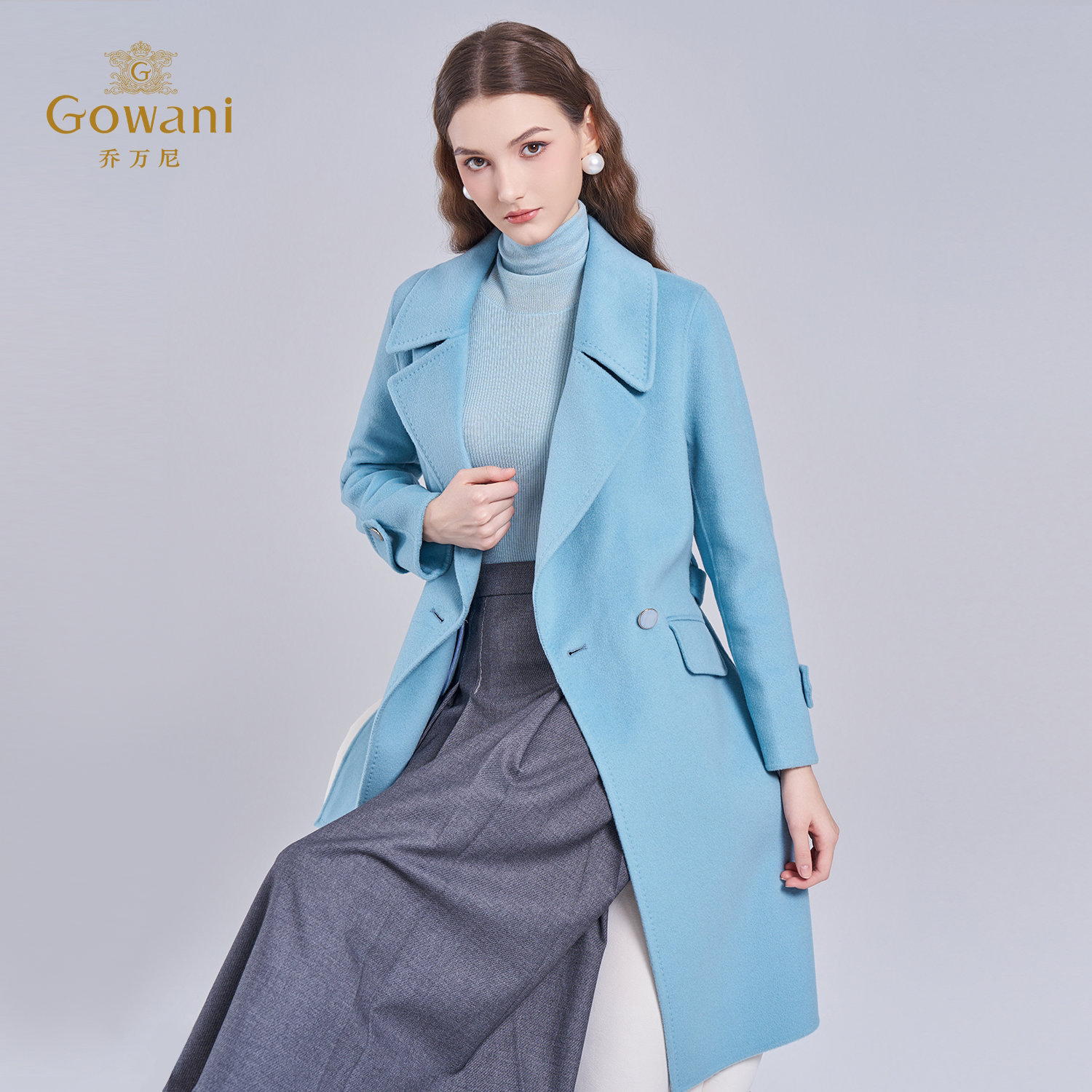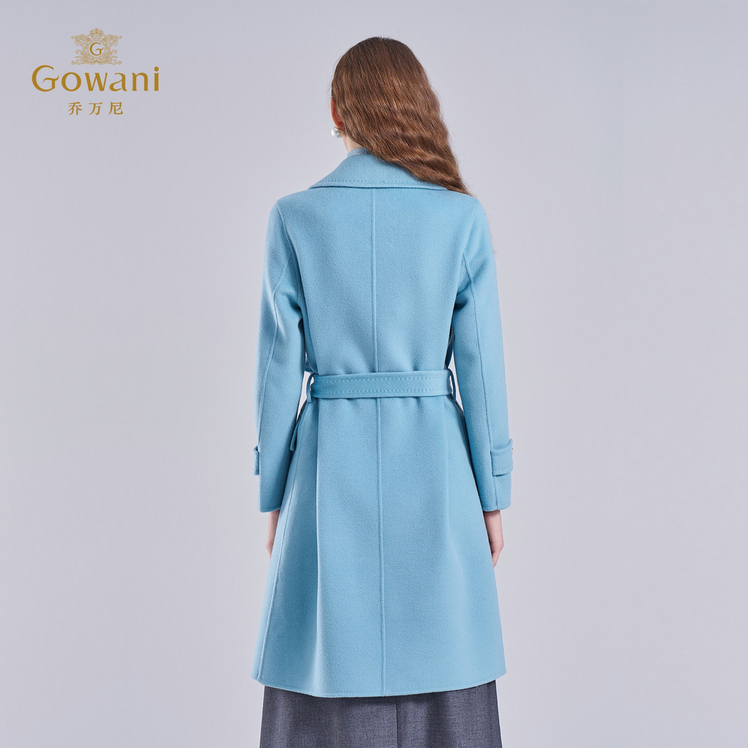乔万尼绵羊毛大衣女蓝色中长款 收腰显瘦保暖毛呢外套ET4A827