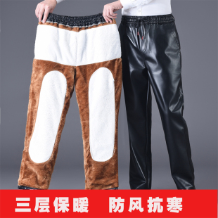 宽松直筒长裤 防风防水冬季 摩托车加绒中老年休闲皮裤 高腰皮裤 男士